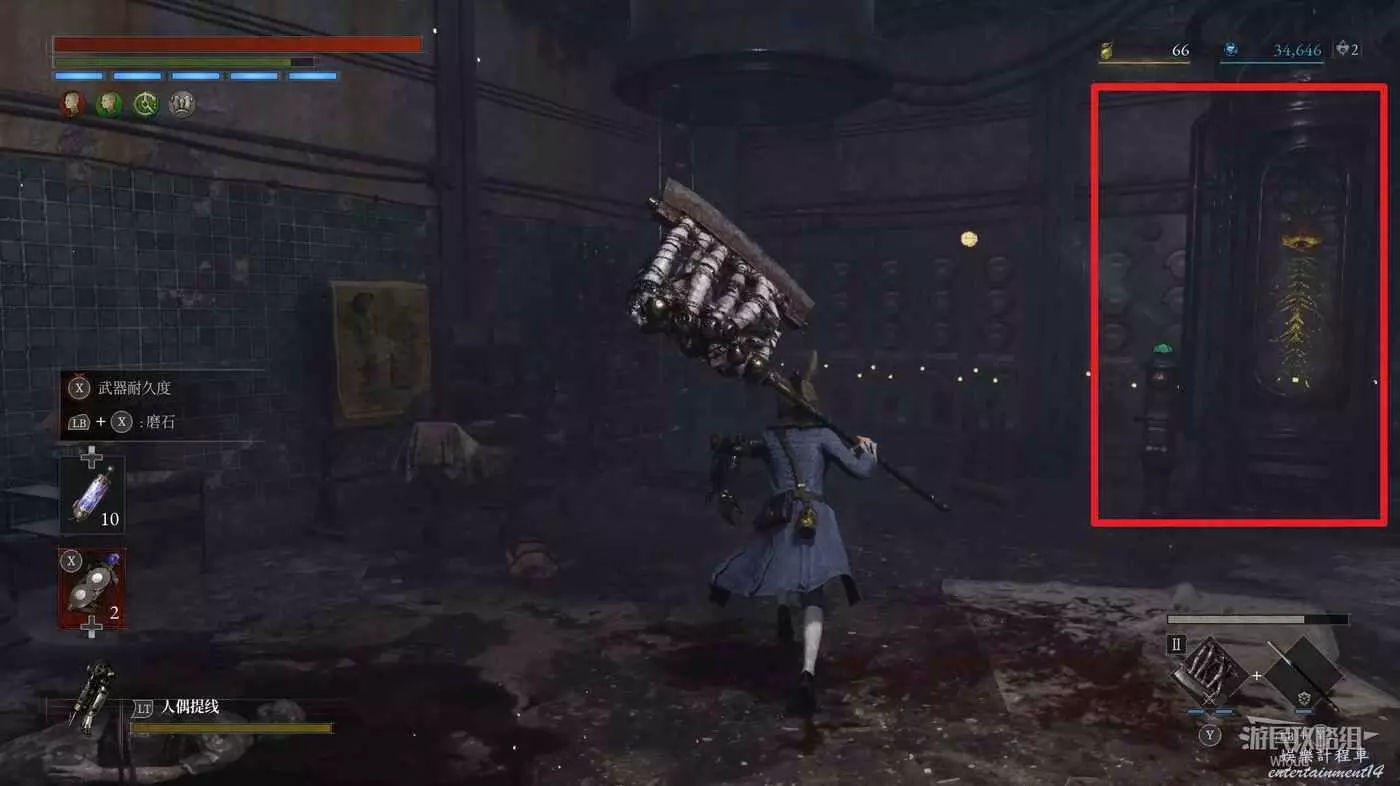拾取左側紅框所示道具時,注意此處有個被箱子擋住的管道入口。
