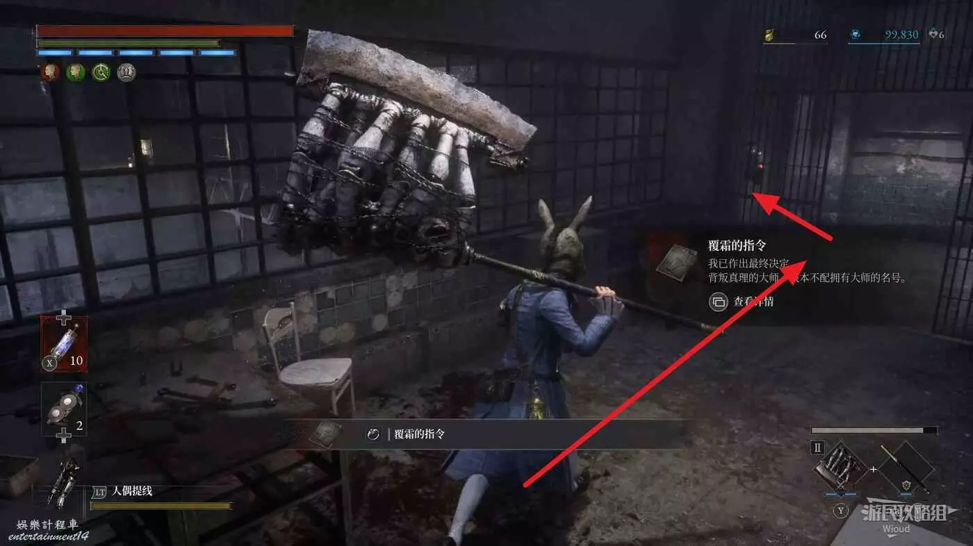 與一個跪地的NPC對話,電梯旁的桌子上可撿到收藏品【覆霜的指令】。