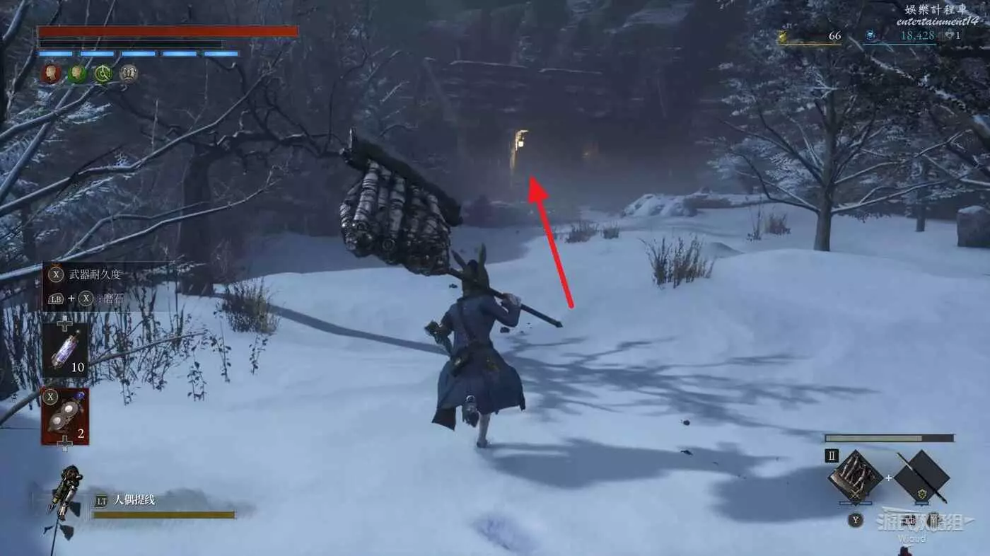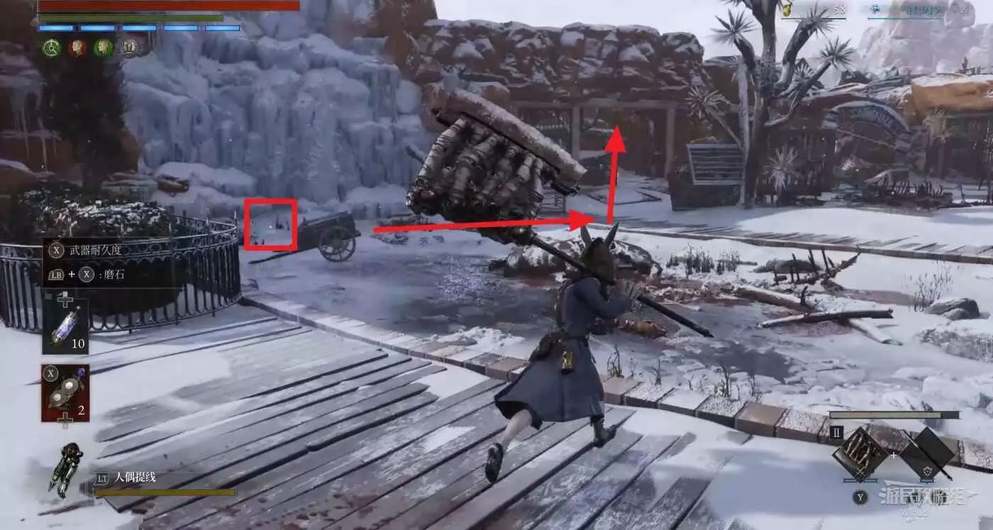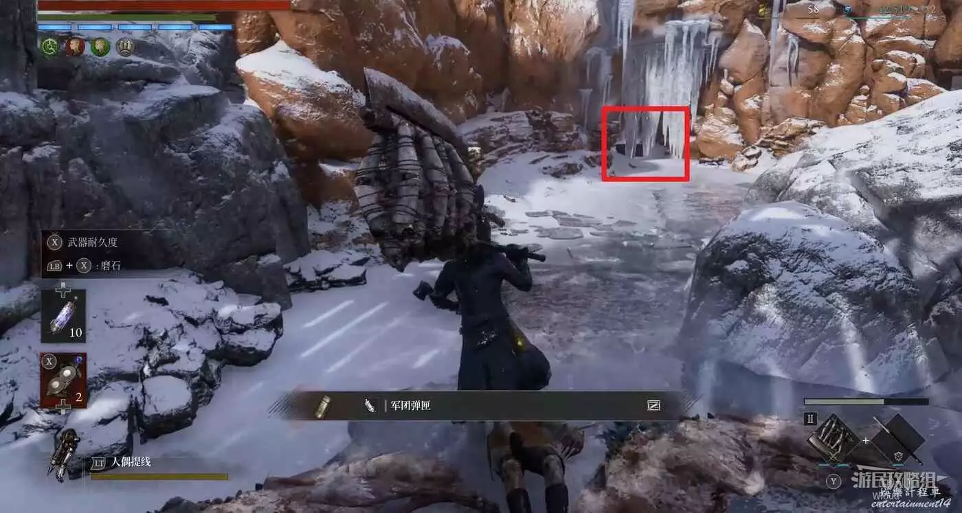 開啟通往冒險大廳篝火的近路後轉頭看向後方全是籠子的開闊區域,左側全是冰塊的牆壁處可以撿到一個【屬性抗性安瓶】,注意冰牆壁右側有個入口,記住這個入口但先不進去。
