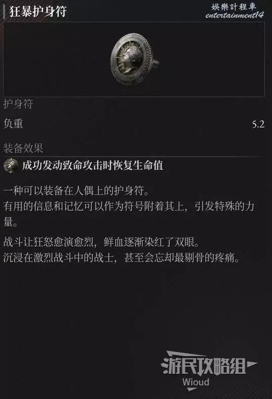 從篝火【摩納德救濟院地窖】開始,進入篝火左側房間可撿到道具1,回到走廊直走左拐,盡頭處可找到一個寶箱,裡面撿到【狂暴護身符】。