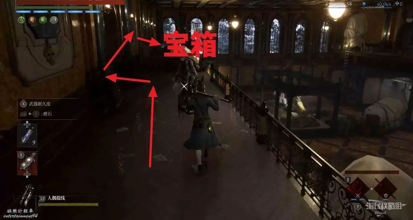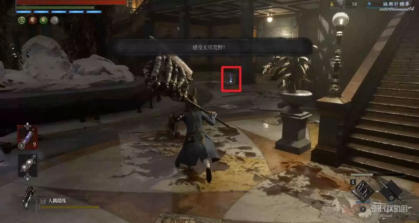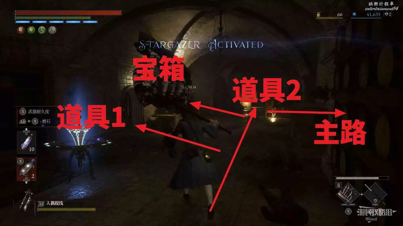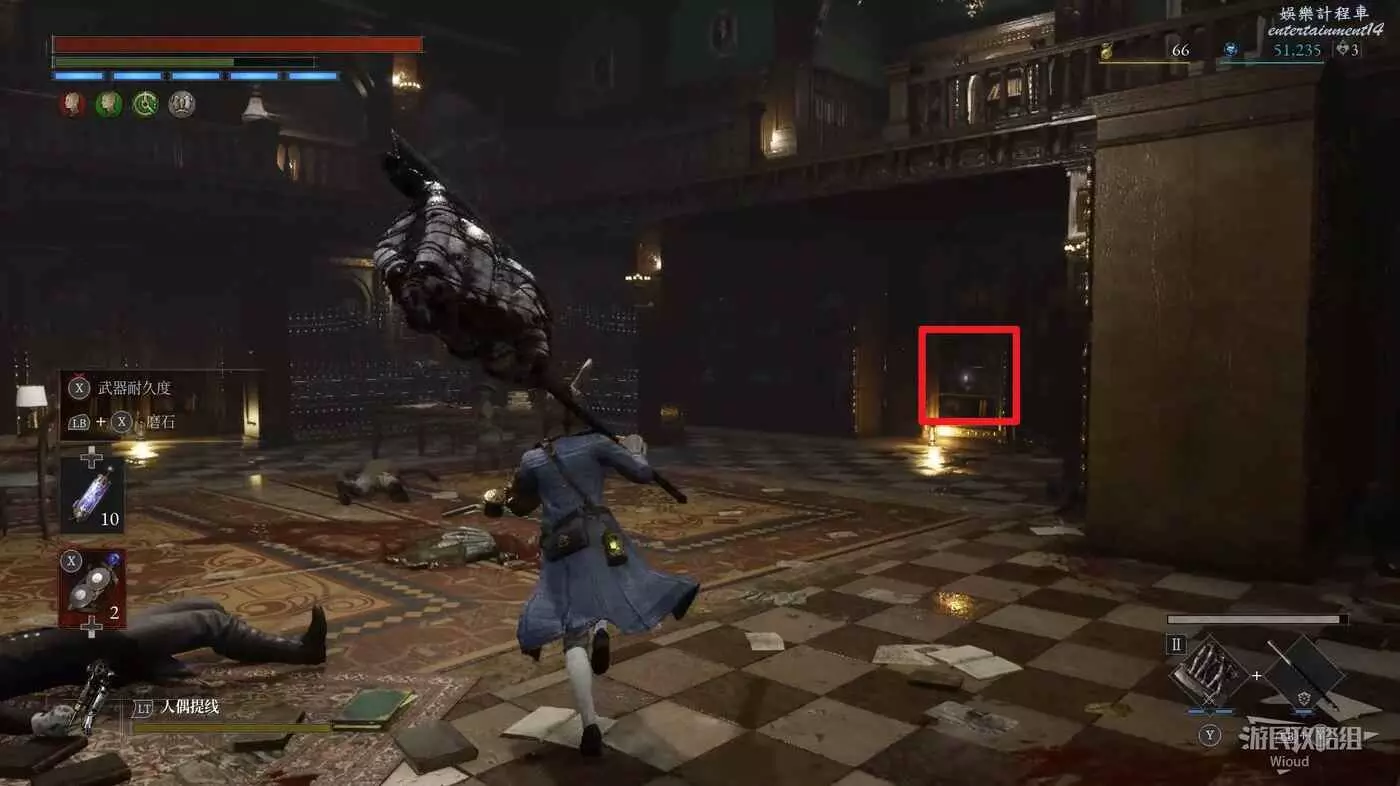 篝火右側的箱子處可撿到【鉛球】,大廳中間左側的樓梯是斷掉的。