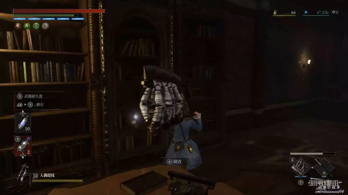 從暗道凹口出來貼著右牆走,中間會再次遇到一個可互動的書架,裡面寶箱可獲得【勇氣護身符】。