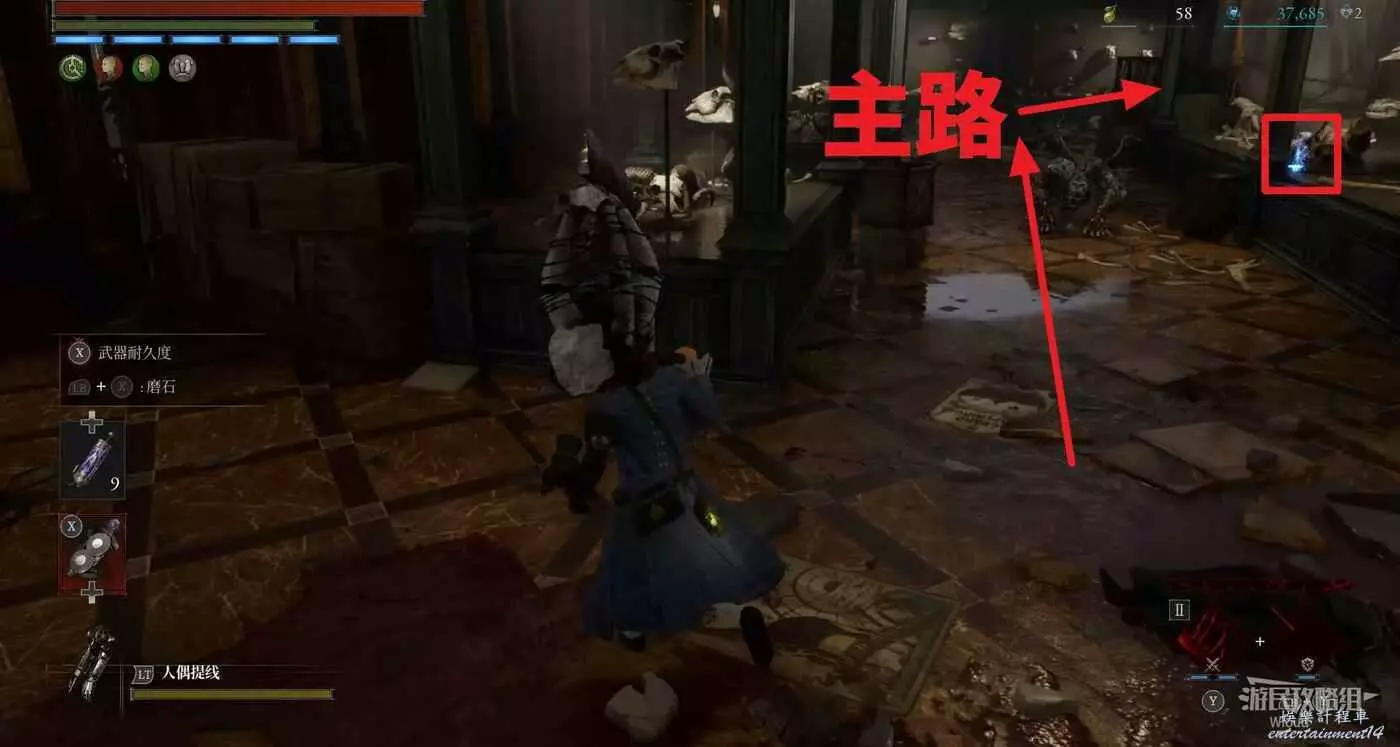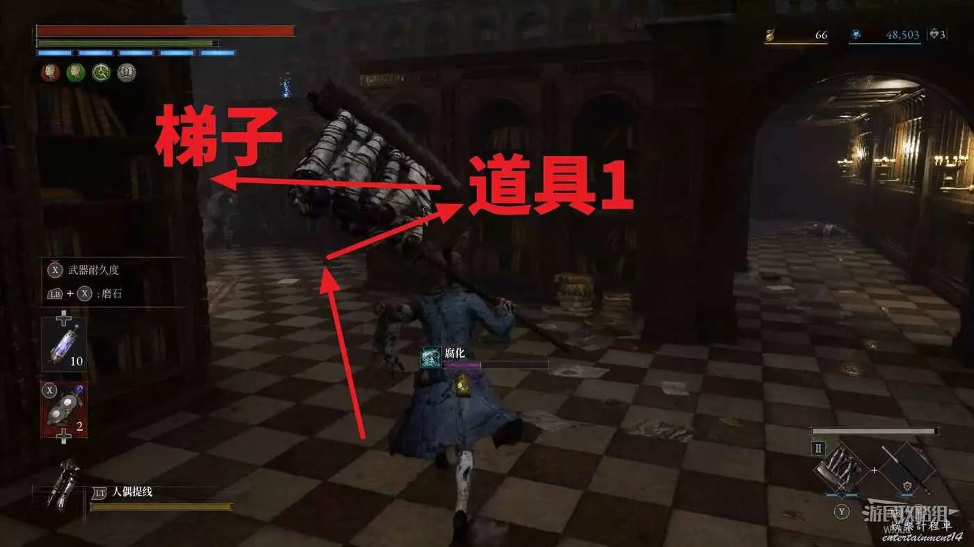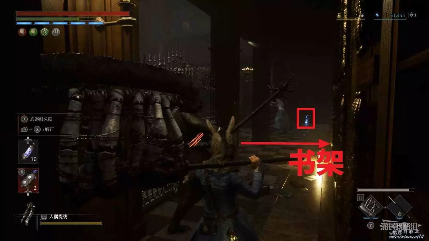 直走右拐,穿過一片牢籠,沿著下圖路線貼著右邊書架繞到裡面拿個道具,走到梯子的位置,貼著右牆來到中間,右邊有個可以互動的書架,互動後兩側都會開啟一個凹口,左邊有個怪物,右邊可拾取一個【超凡恢復安瓶】。