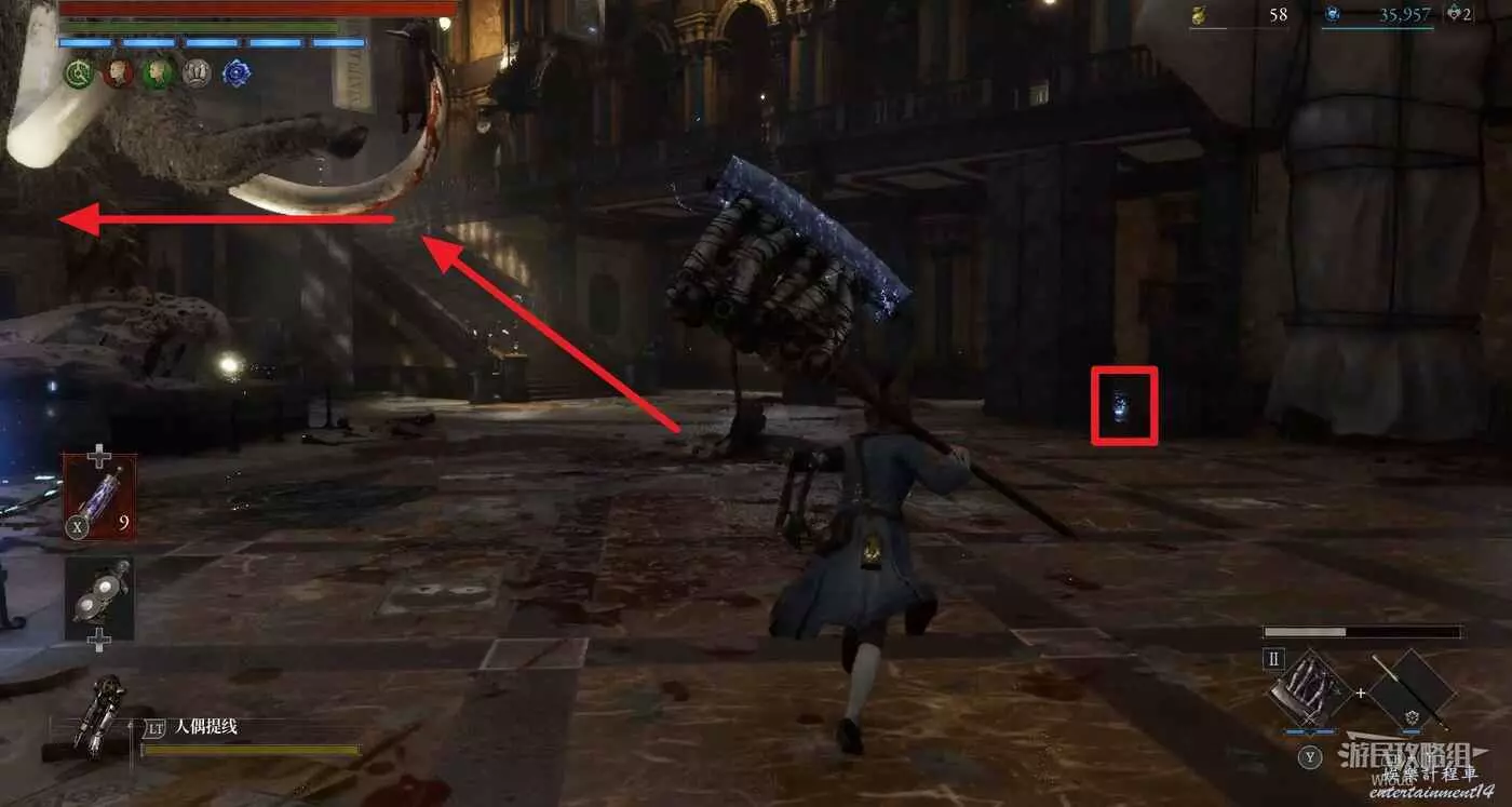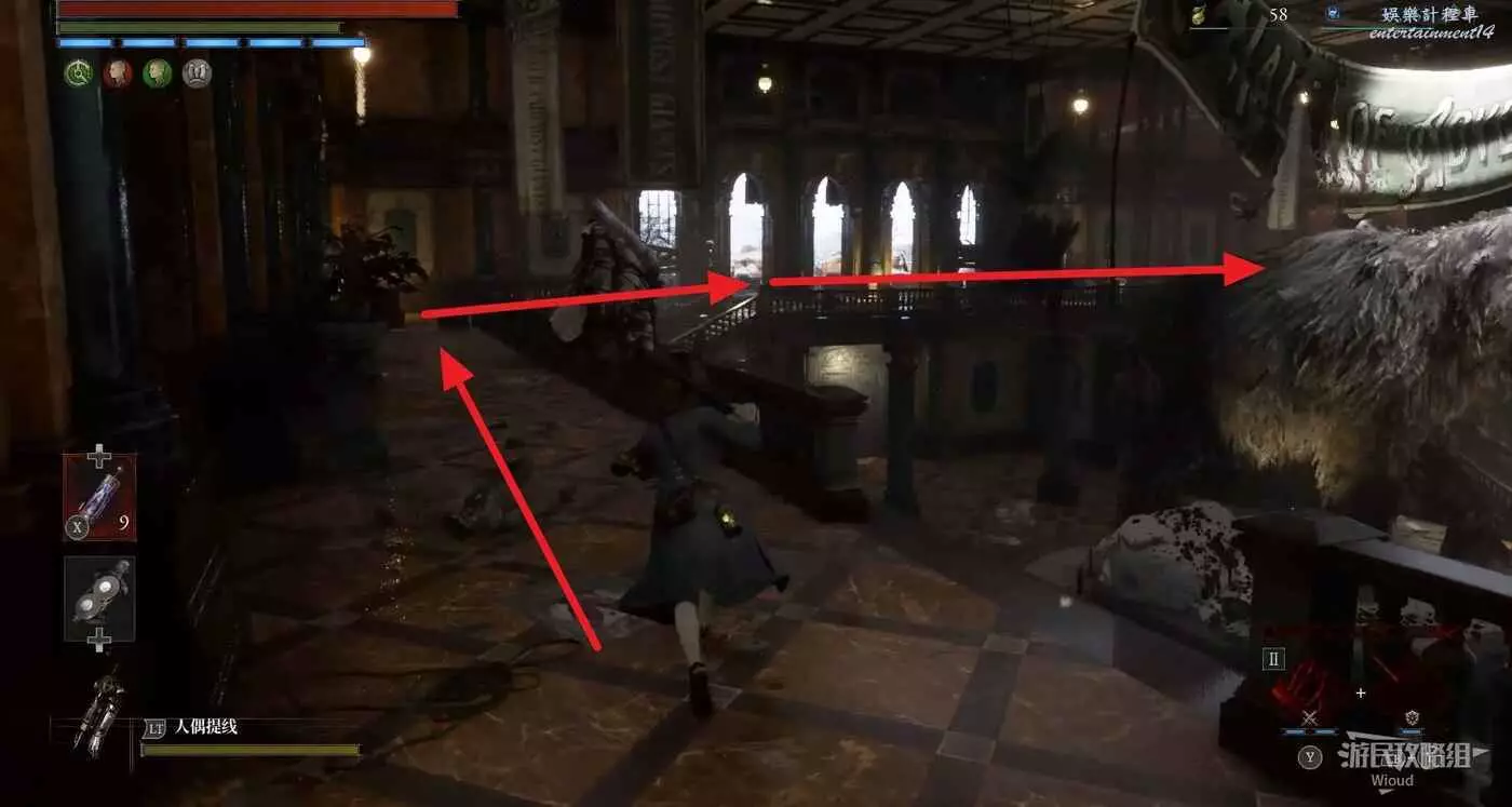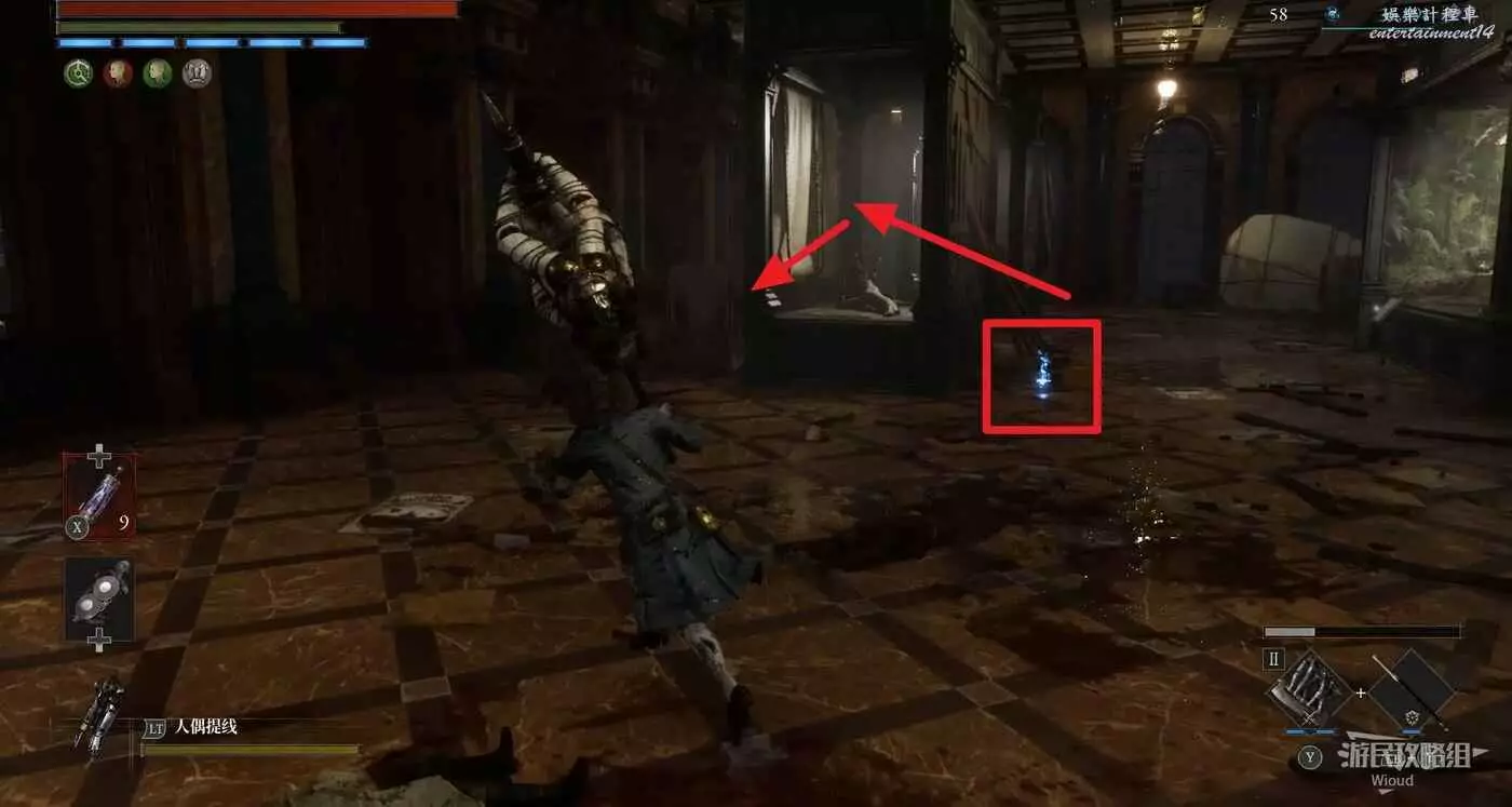 直走右拐,穿過一片牢籠,沿著下圖路線貼著右邊書架繞到裡面拿個道具,走到梯子的位置,貼著右牆來到中間,右邊有個可以互動的書架,互動後兩側都會開啟一個凹口,左邊有個怪物,右邊可拾取一個【超凡恢復安瓶】。