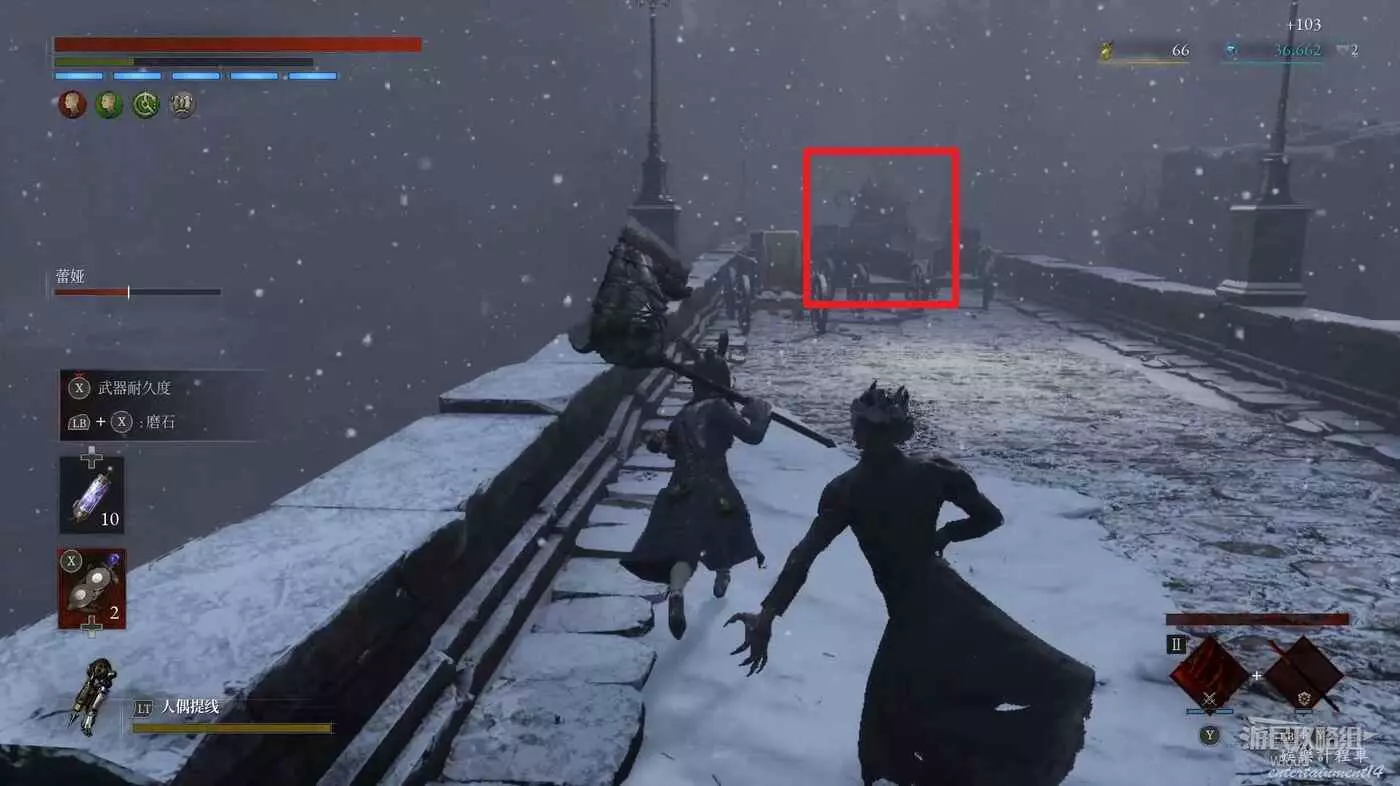 此處左前方馬車邊有個缺口,沿缺口下去往右走,有個被擋住的道具可檢,往左走可以找到一個紅色的次元蝴蝶。