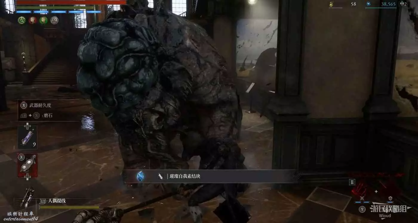 因為前面的路被木箱擋住,繞到大廳右邊,擊敗一個賊肉的大象怪可獲得一個【璀璨自我素結塊】。