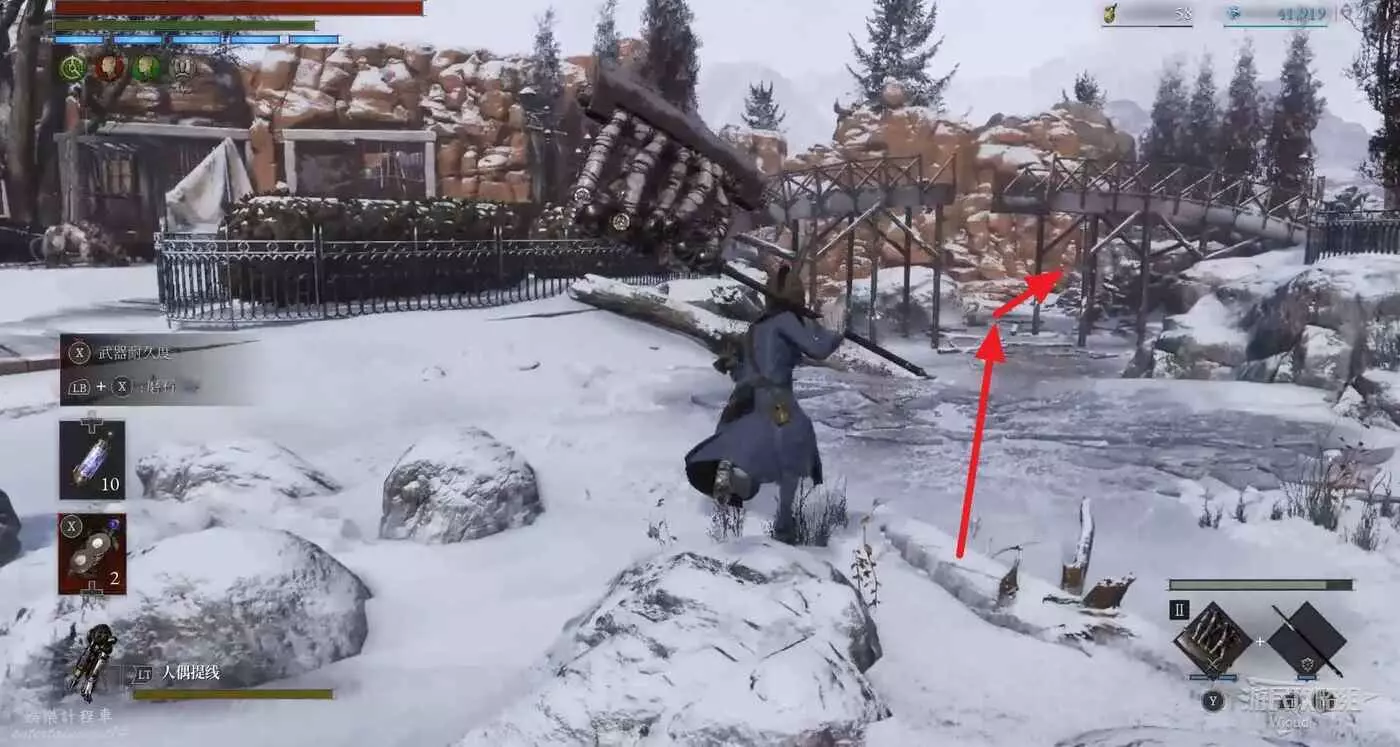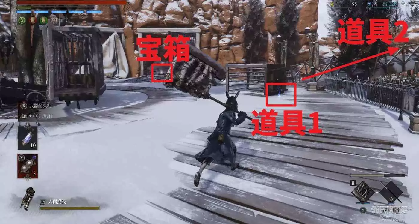 回到中間位置往前走一段朝右看,右側木橋口有個道具可拿,沿著木橋走到斷口處也有個道具可拿。