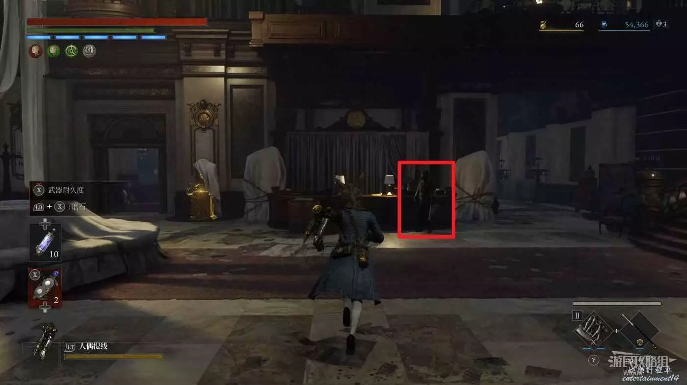 爬剛才的梯子並走到2層盡頭,左邊陽臺週邊有個可以往書架上走的斜坡,先記住這個位置,走廊前方右側紅色長椅處藏著一個容易被忽略的道具,就在紅色長椅左邊有個向下的梯子。