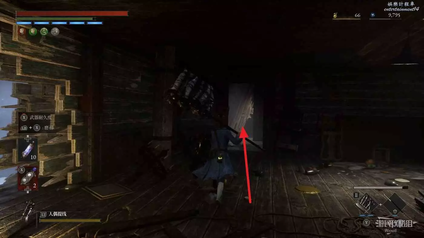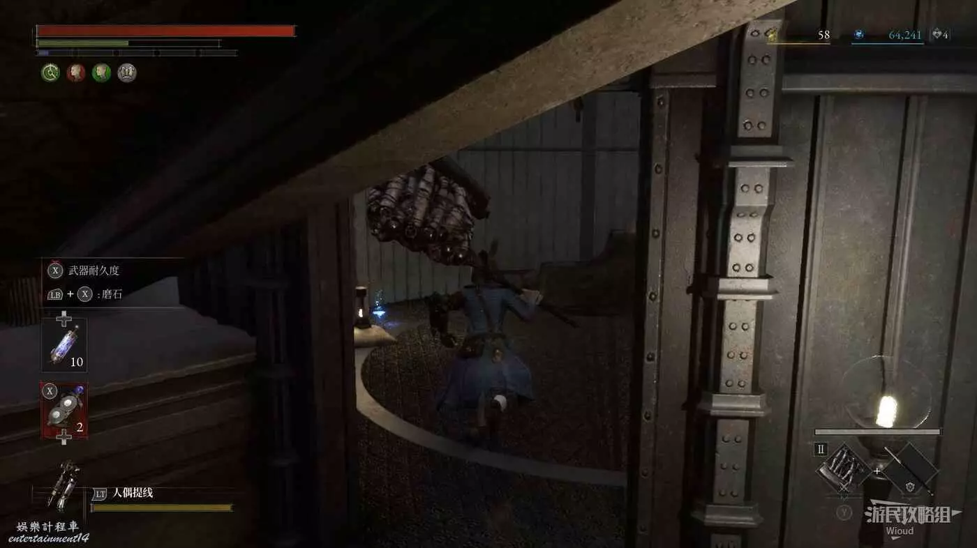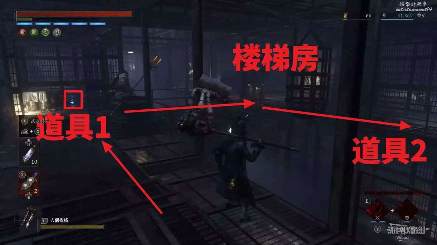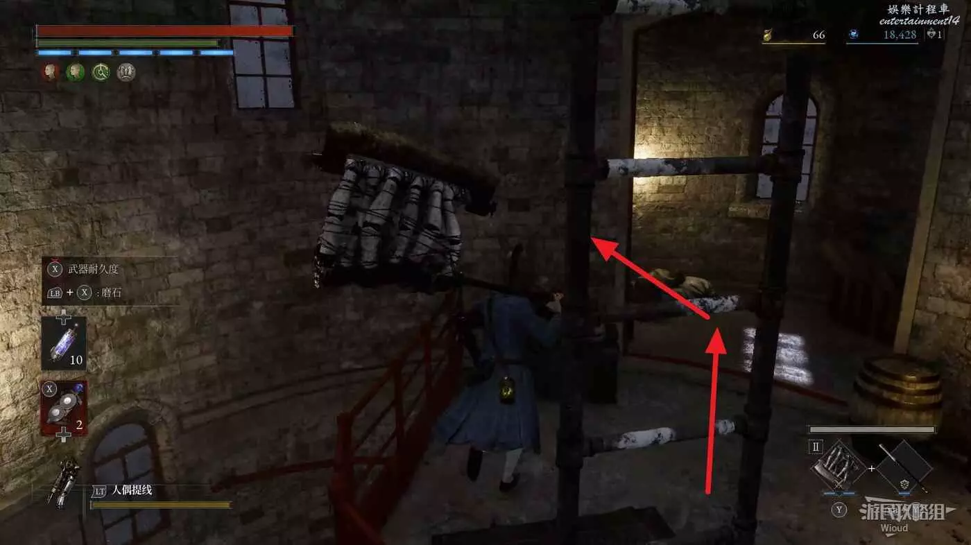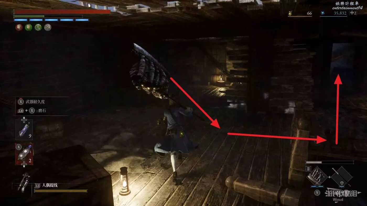酒窖進門右拐,撿到第一個道具,回到剛進門位置,直走左拐再爬梯子上去。