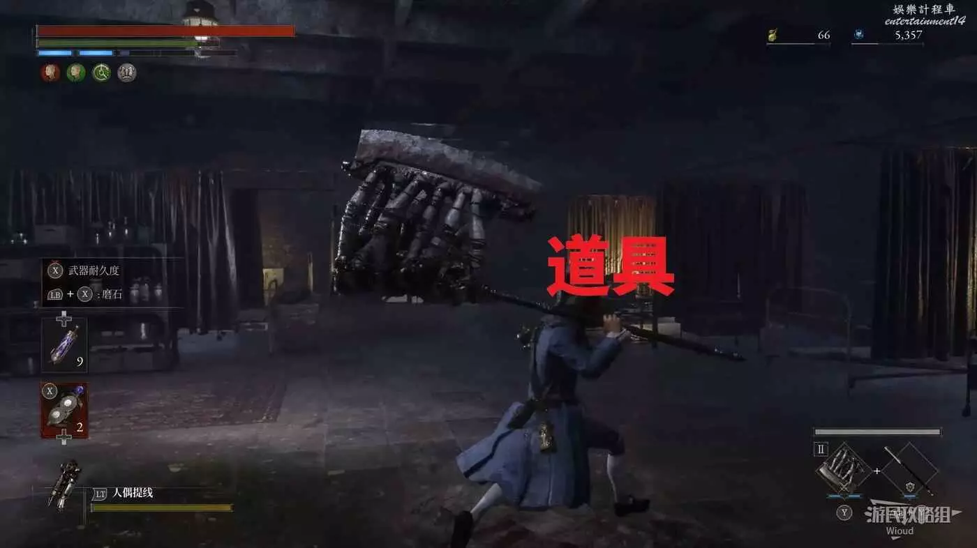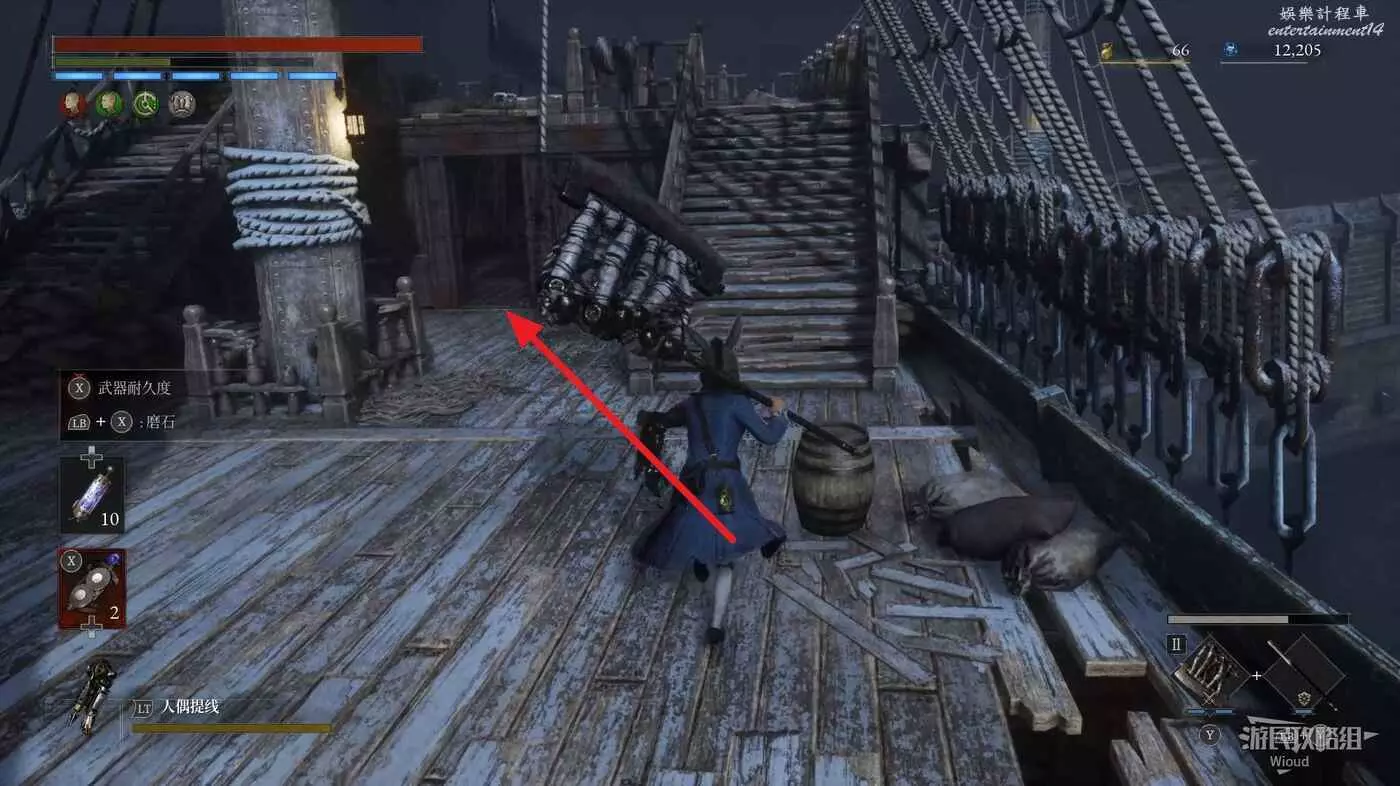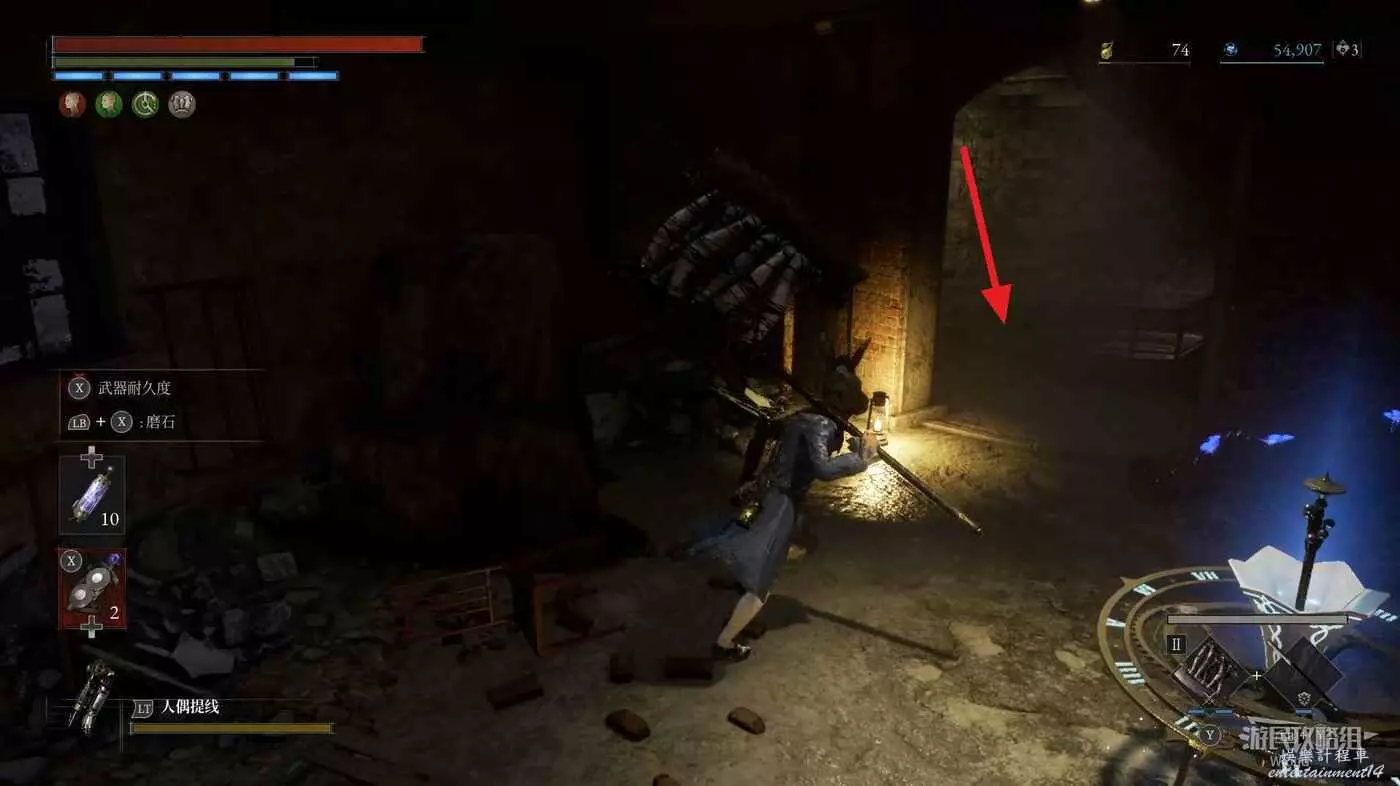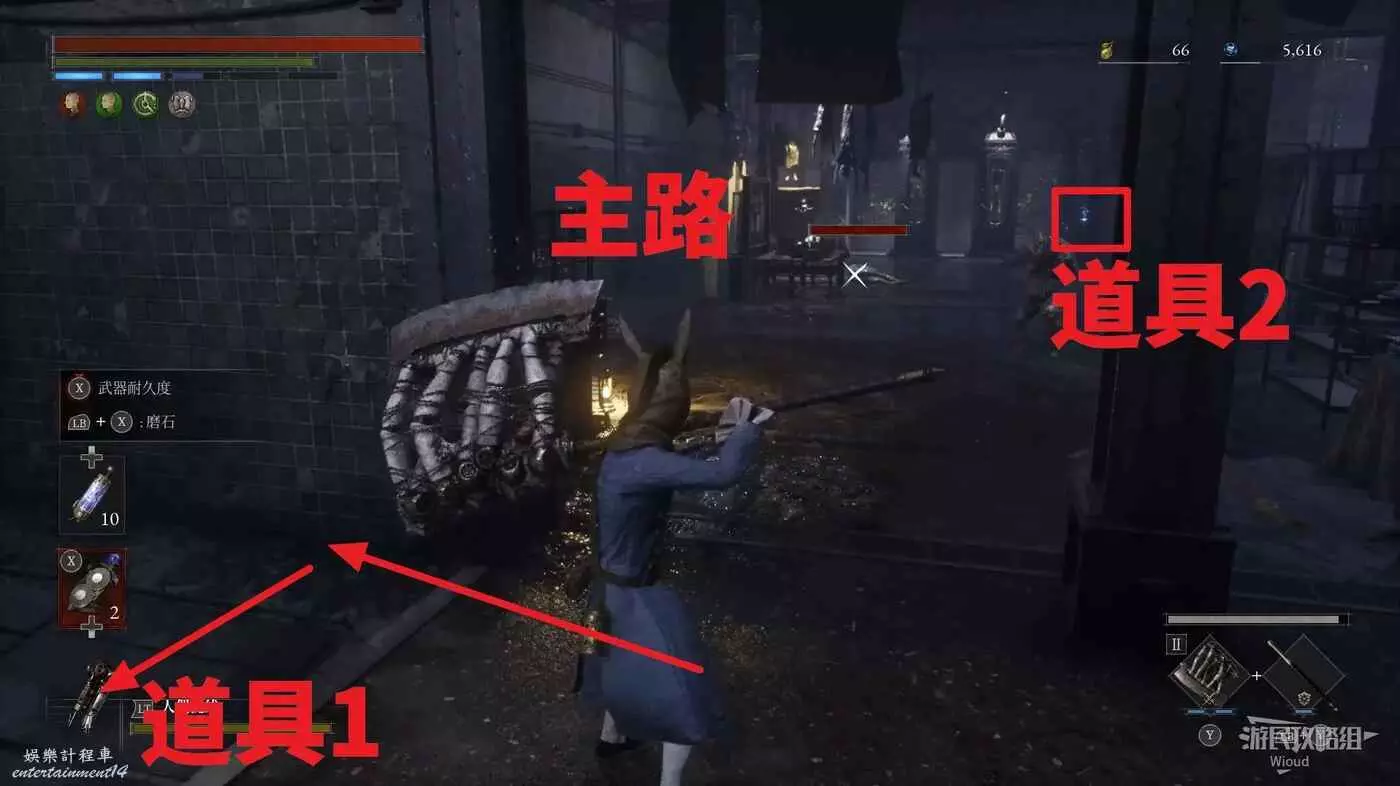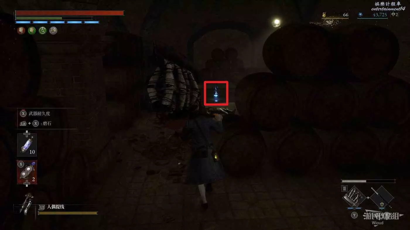 酒窖進門右拐,撿到第一個道具,回到剛進門位置,直走左拐再爬梯子上去。