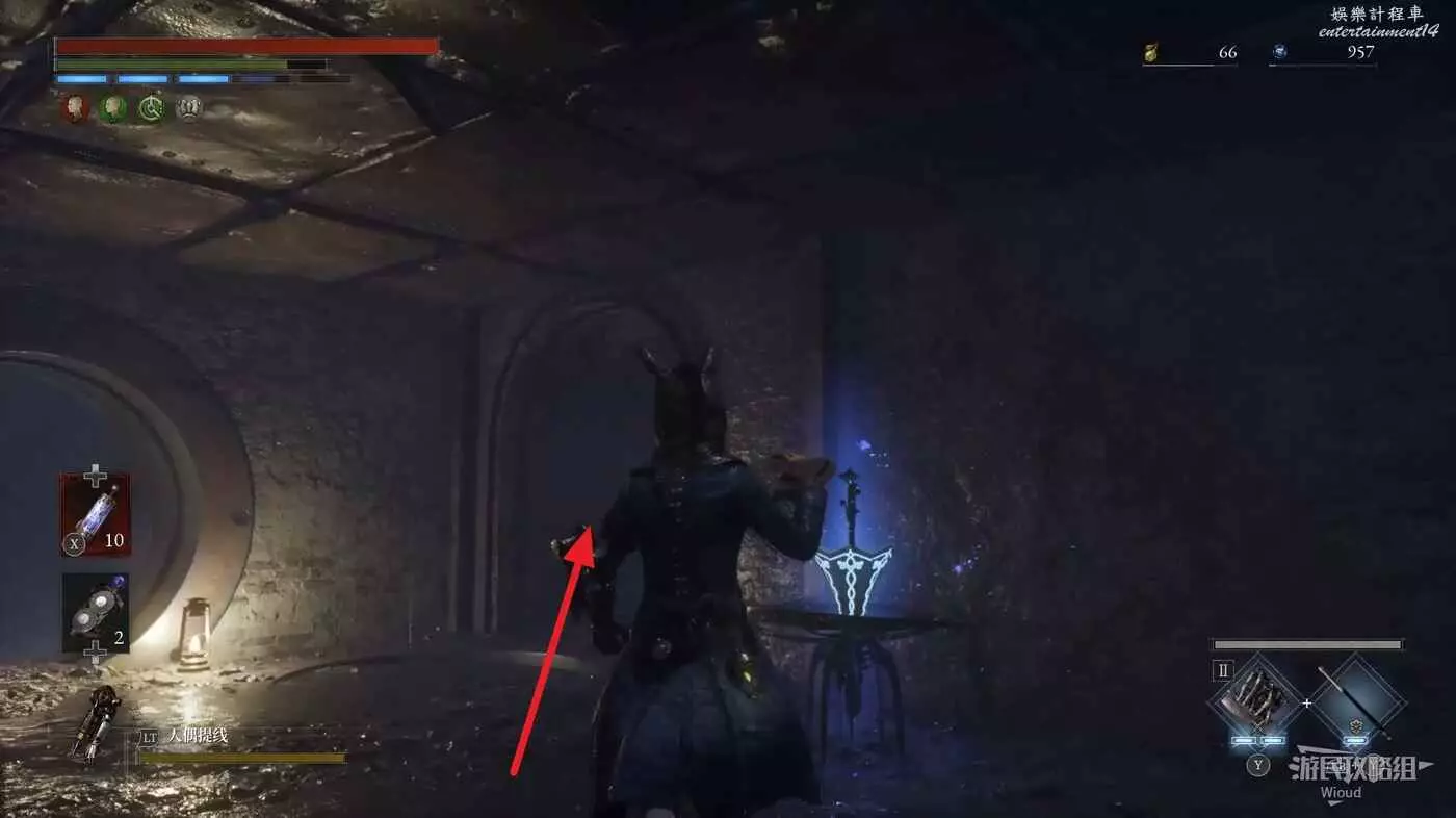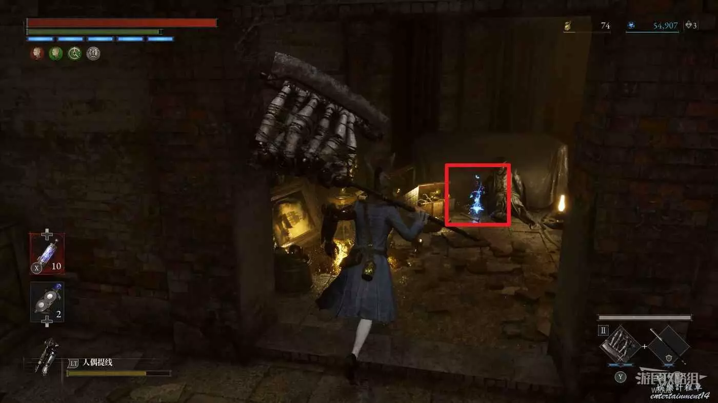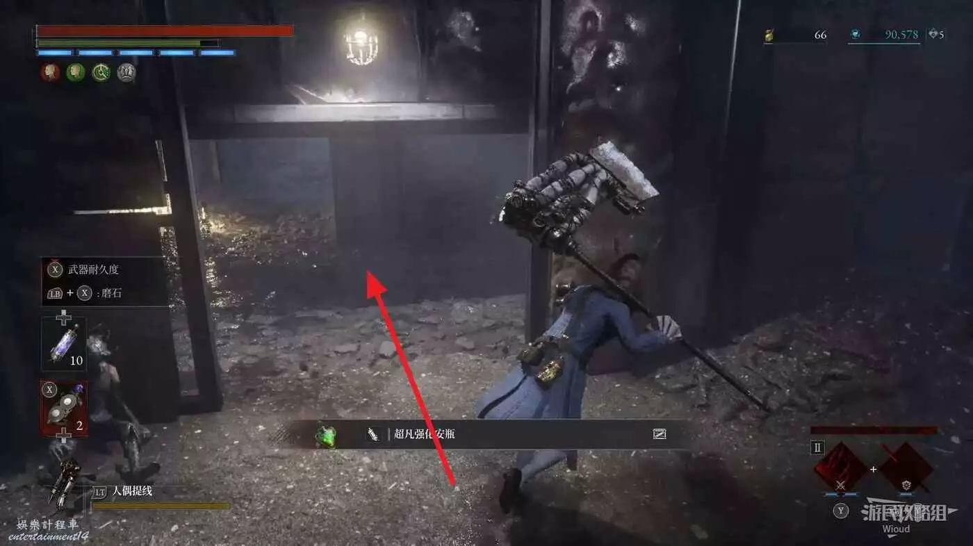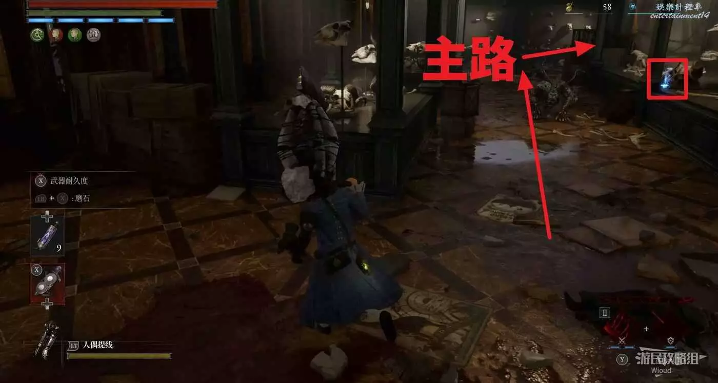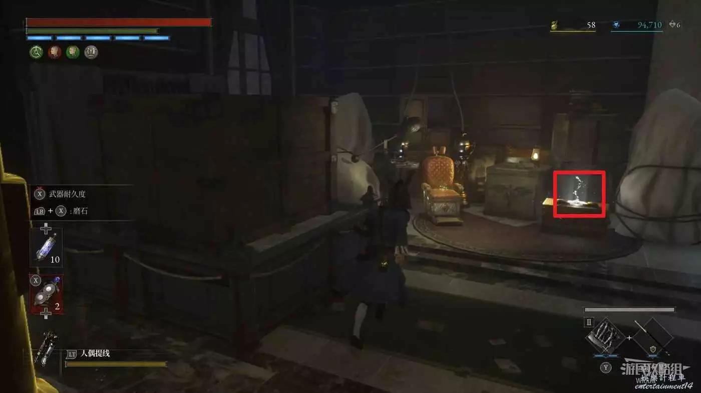 回到煉金師屍體處,走左邊往上的主路,盡頭開啟之前入口左側那個緊閉的大門,然後進入左側的房間內。