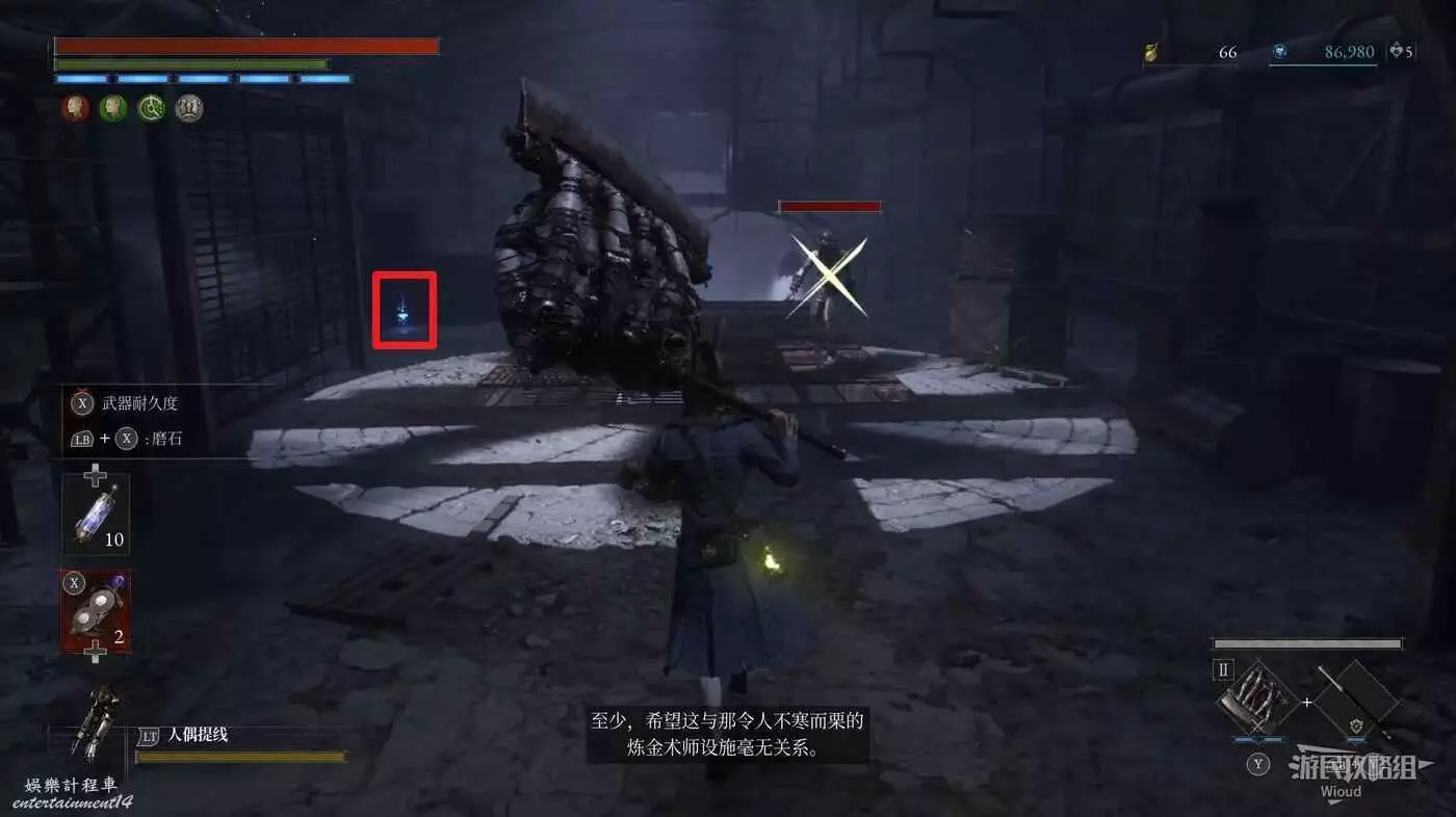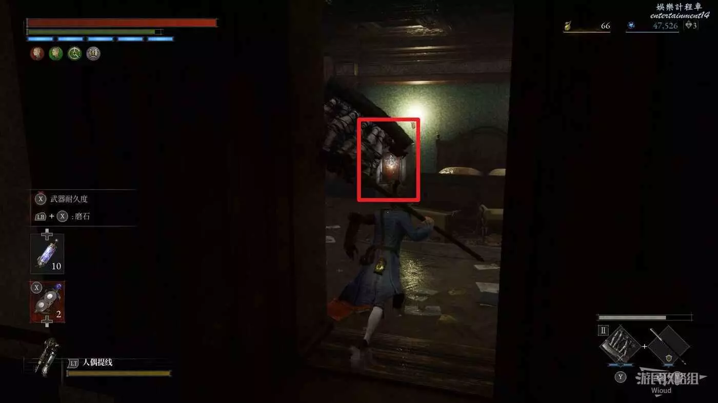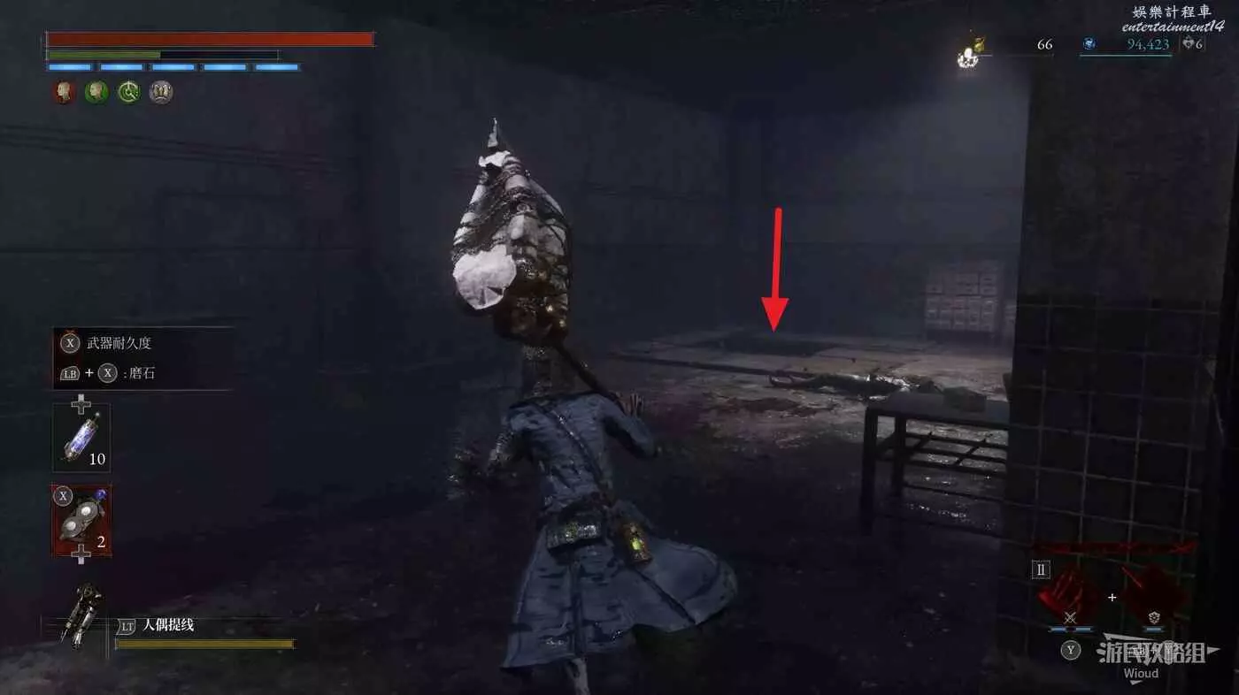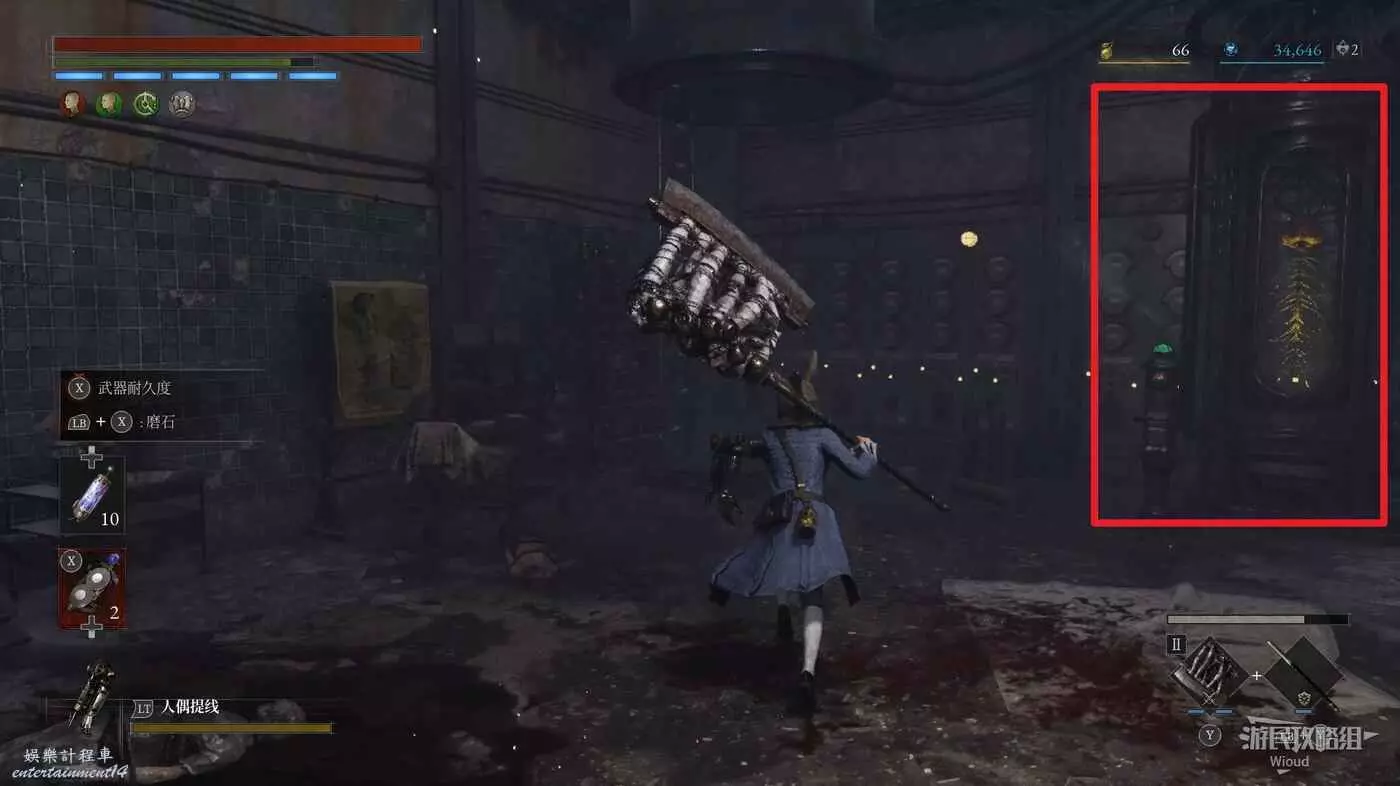 回到煉金師屍體處,走左邊往上的主路,盡頭開啟之前入口左側那個緊閉的大門,然後進入左側的房間內。