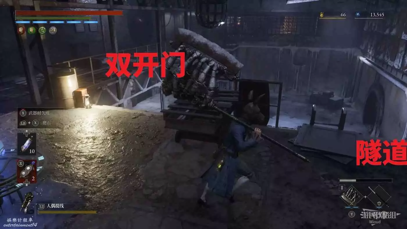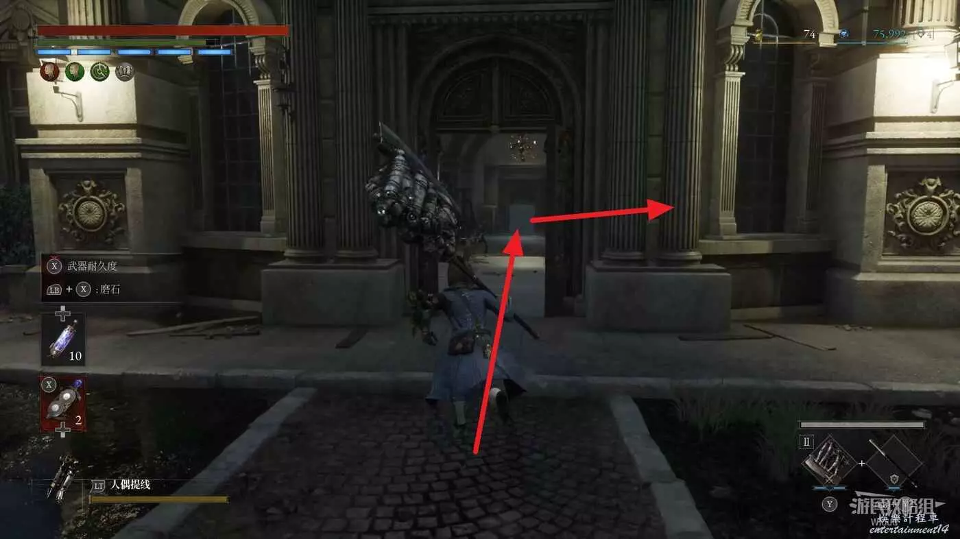 右側有個斷橋,可以看到對面有個道具點,沿路往前走,開啟左側建築大門,此門是猛獁象標本後方鎖住的大門,是個通往篝火的近路。