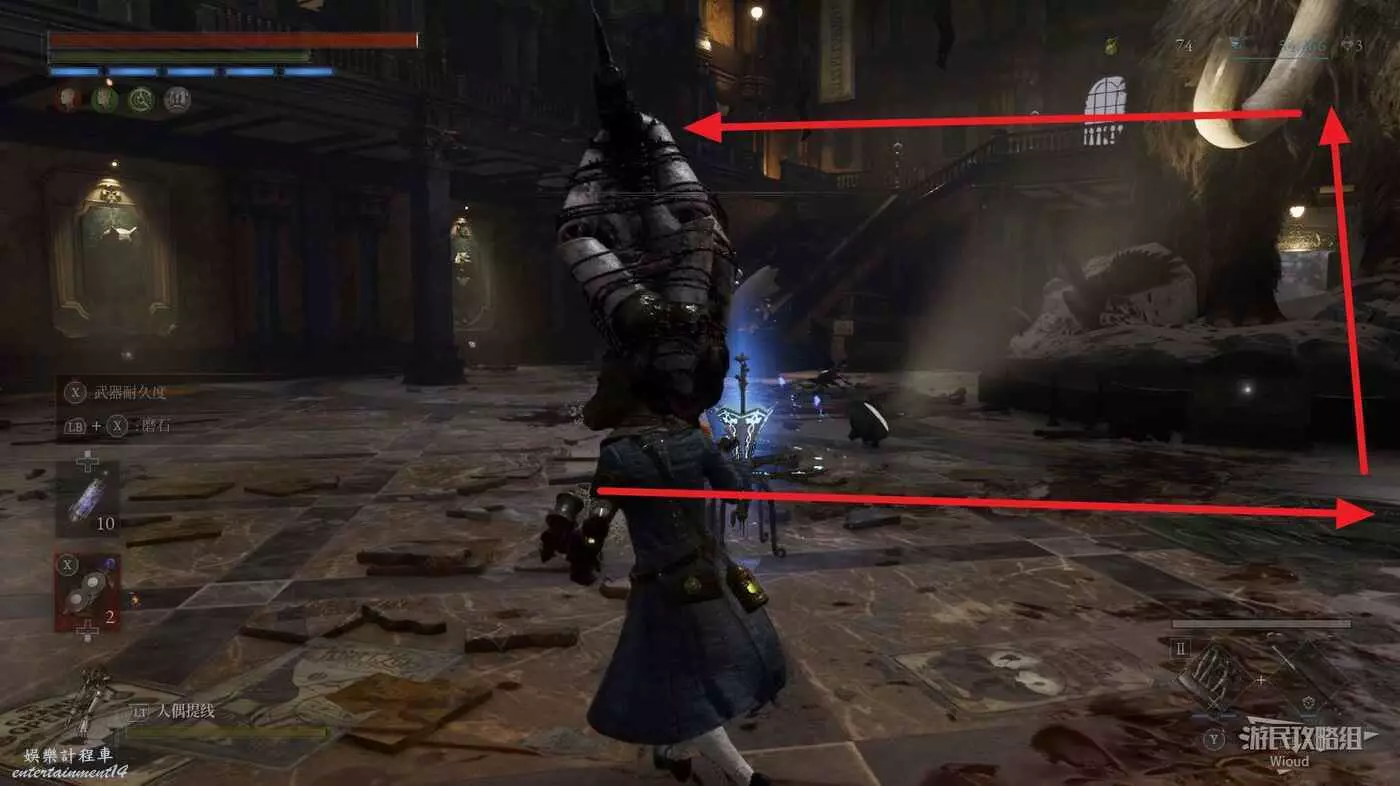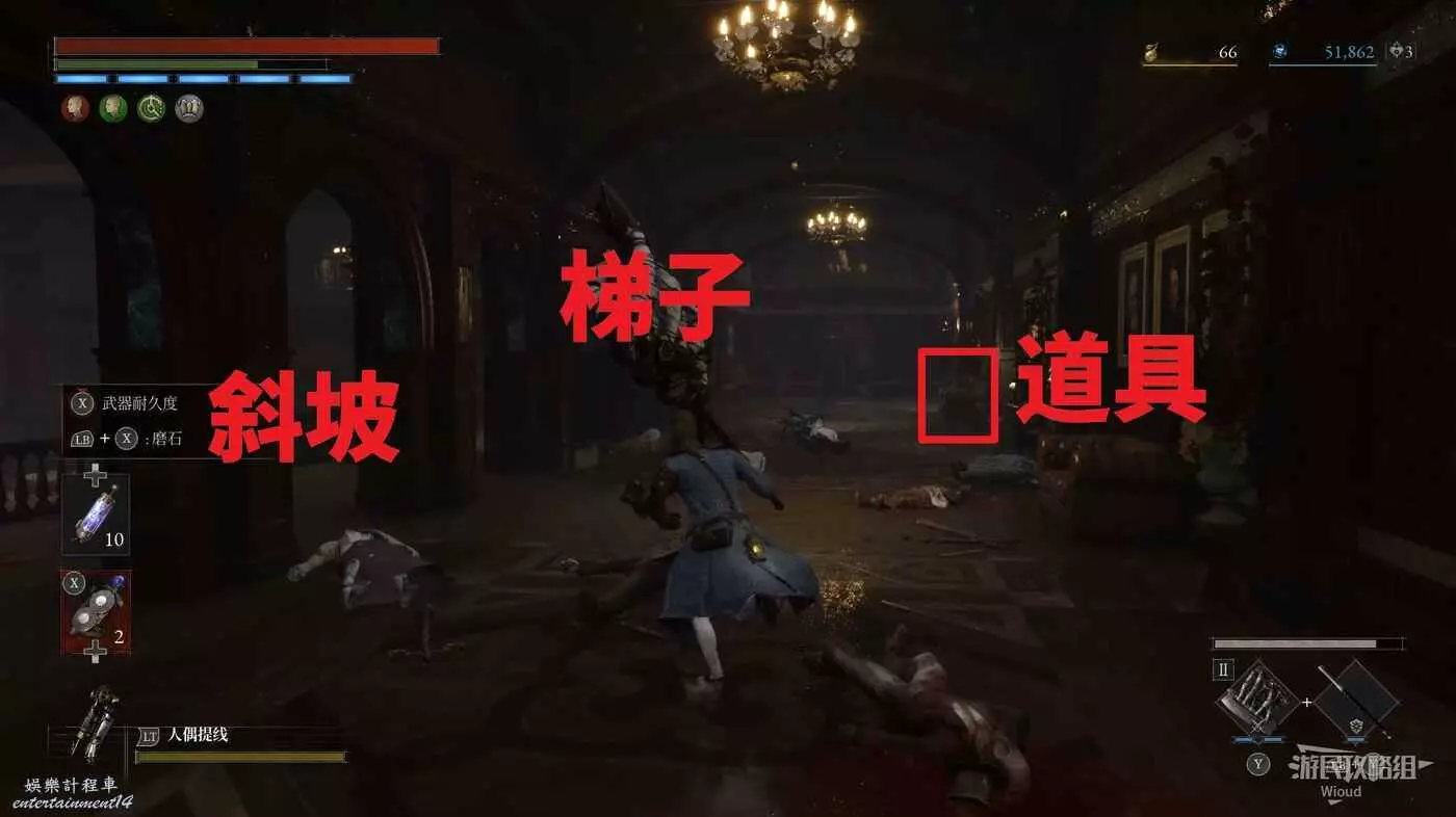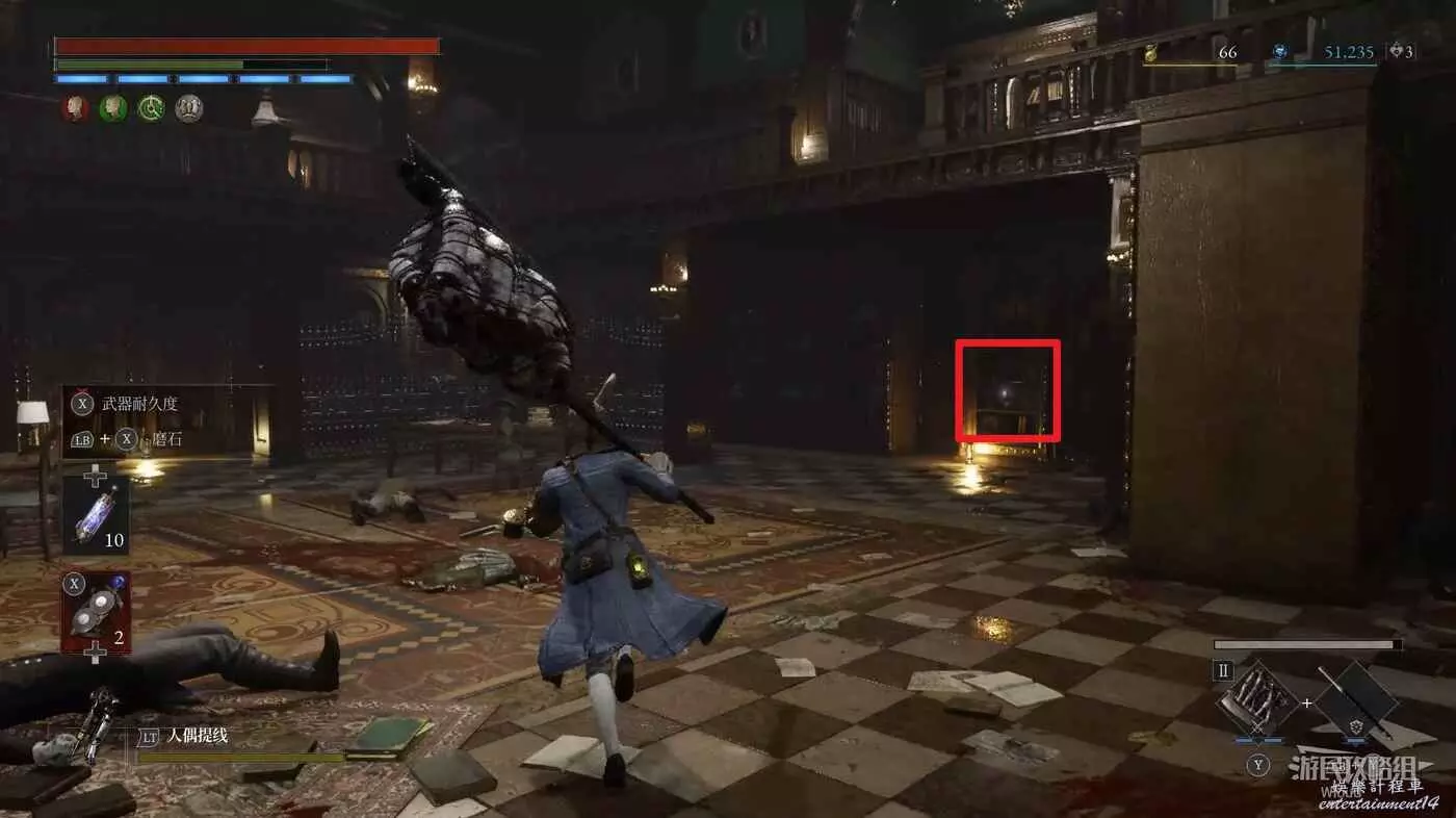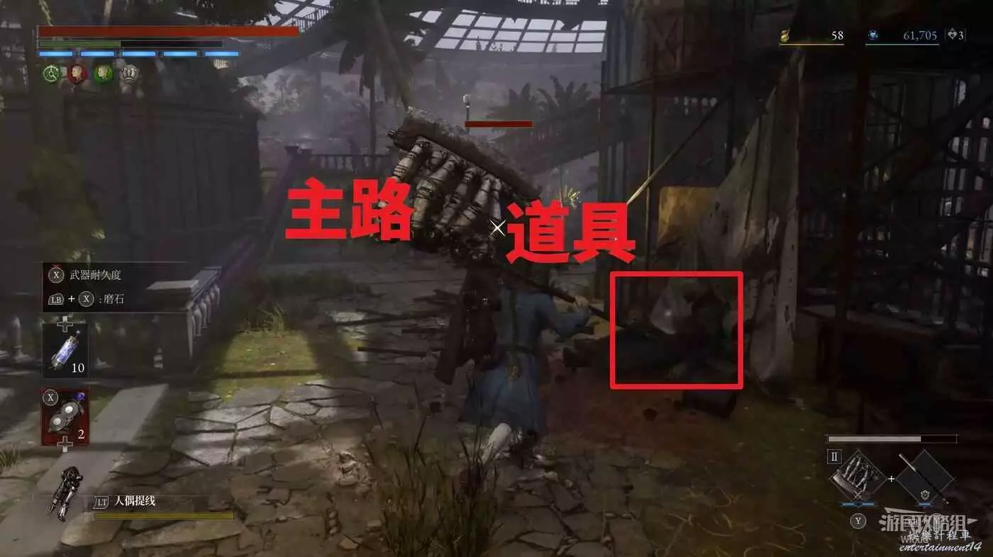篝火右側的箱子處可撿到【鉛球】,大廳中間左側的樓梯是斷掉的。