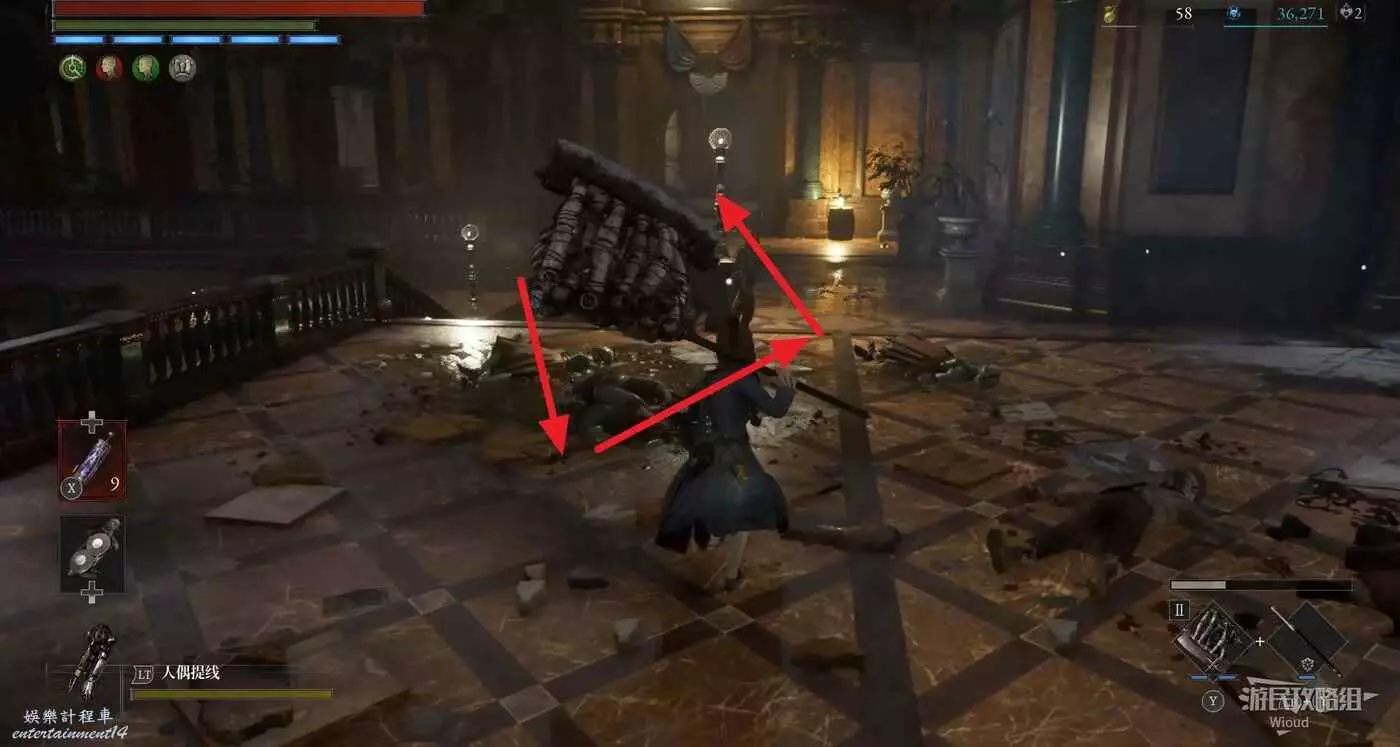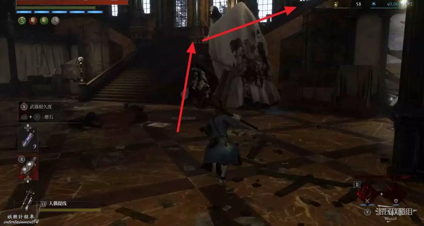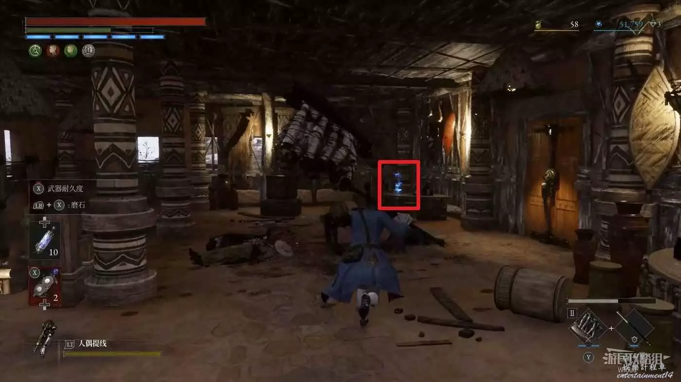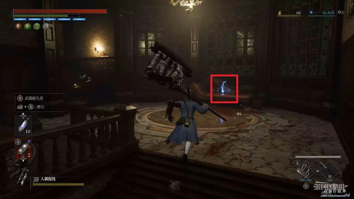 篝火右側的箱子處可撿到【鉛球】,大廳中間左側的樓梯是斷掉的。