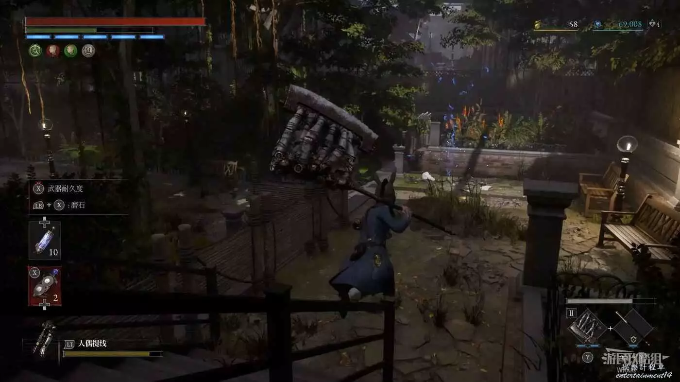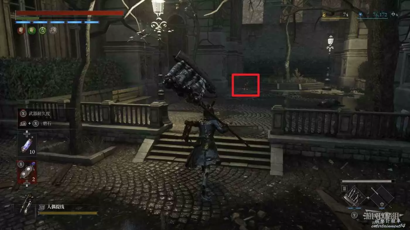 篝火右前方被障礙物擋住的大門前屍體處可撿到一個【屬性淨化安瓶】,打開左側建築大門進入花園內部。