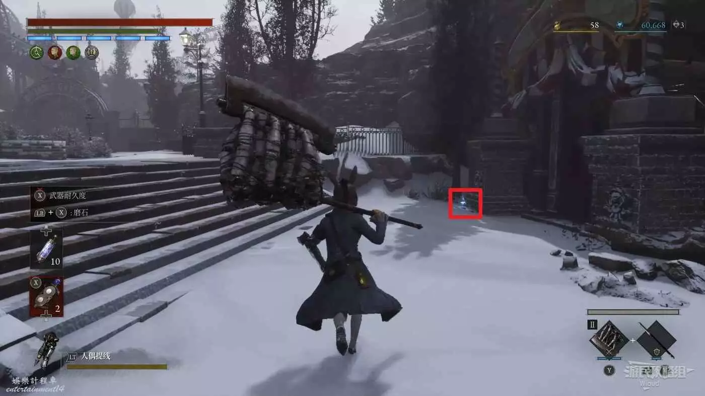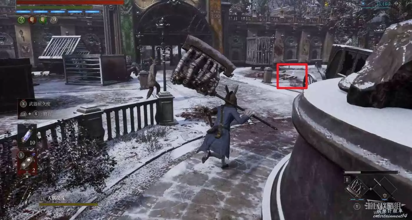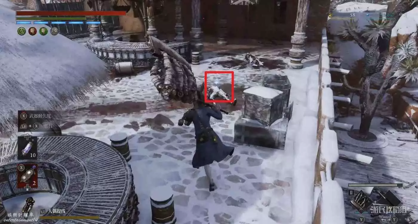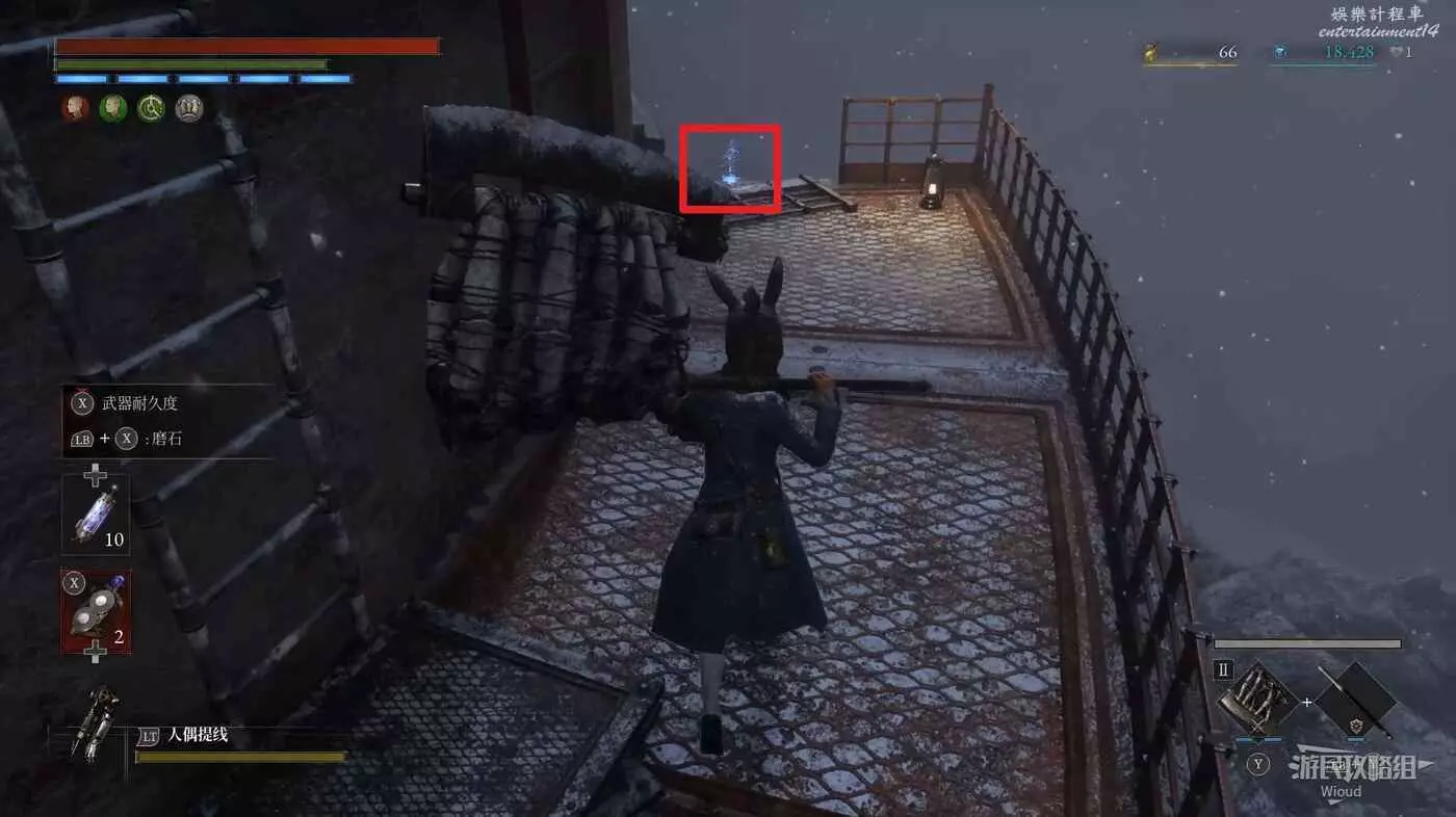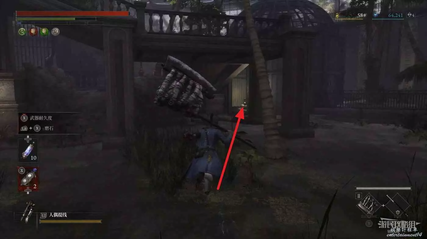 隨後回到剛從缺口跳下來的位置往右走,不遠處塔樓有個樓梯,此塔樓另一側可撿到一個【特殊抗性安瓶】。