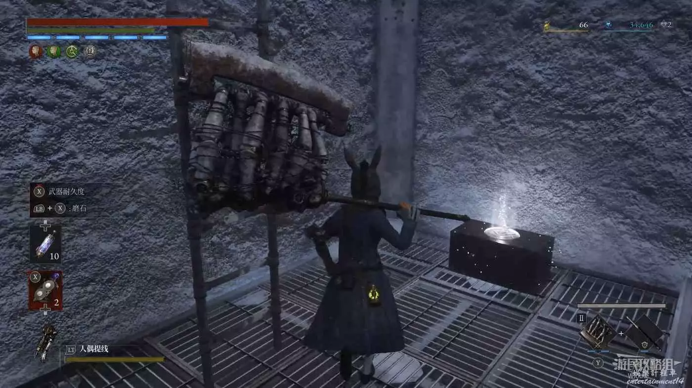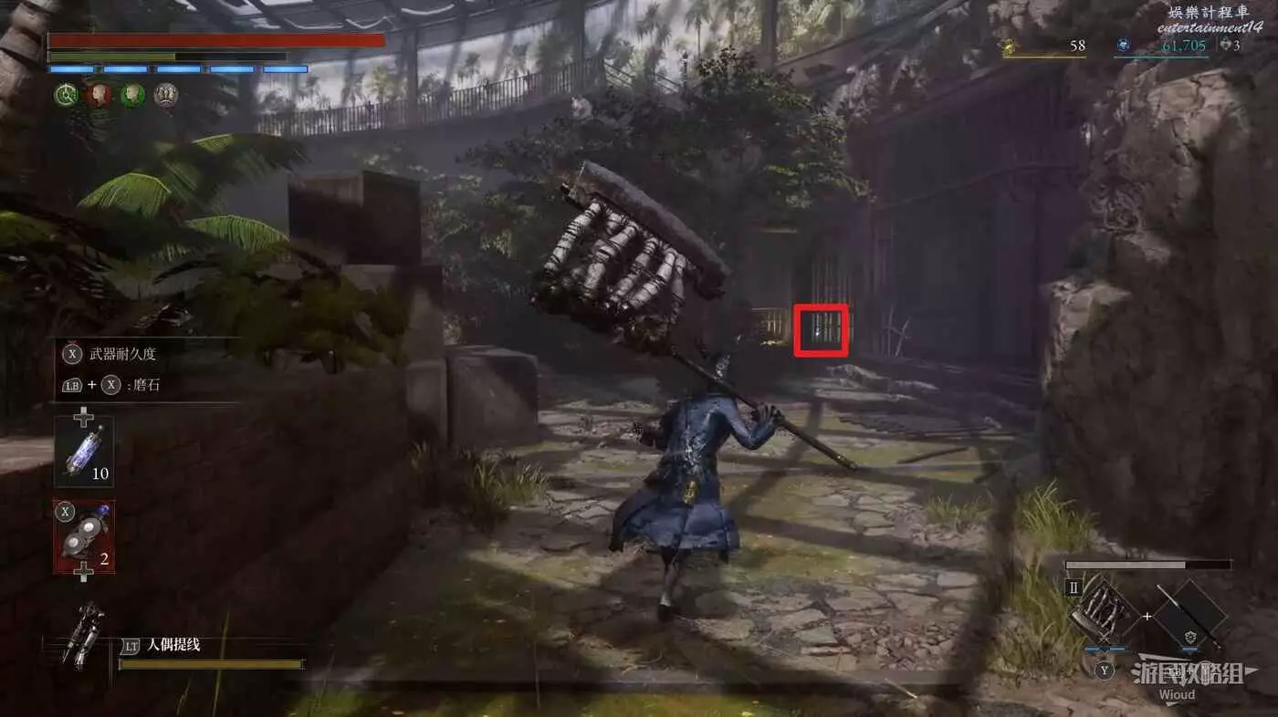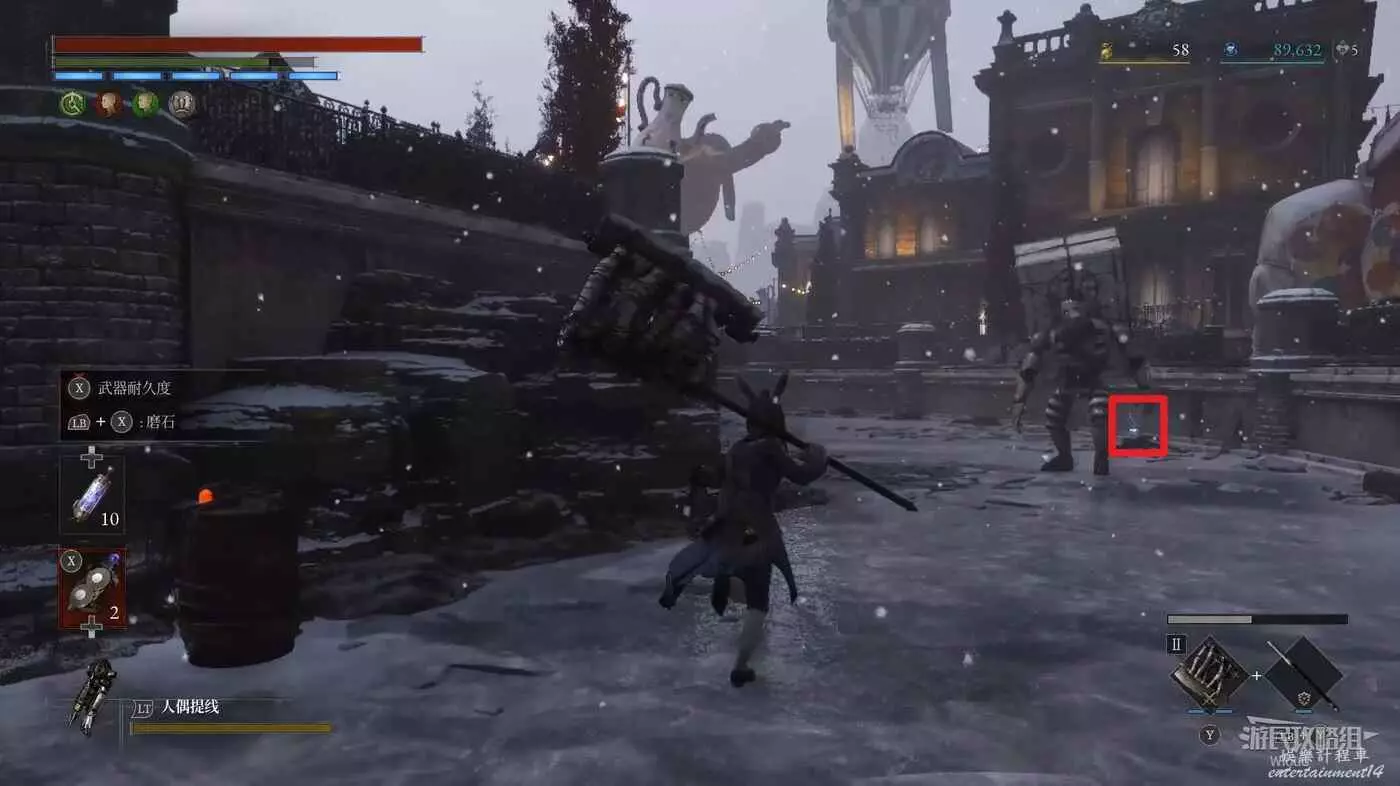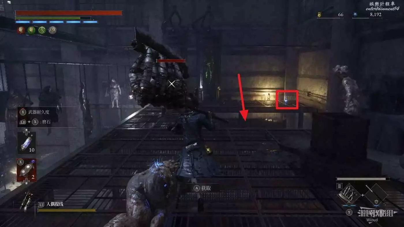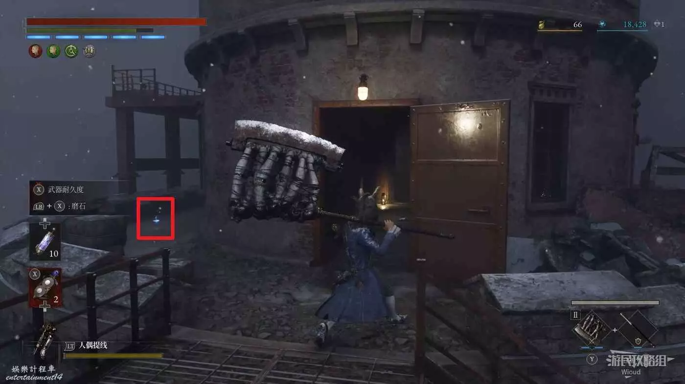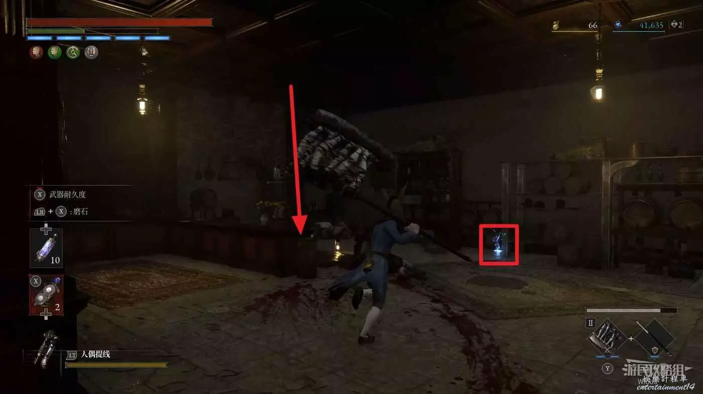 隨後回到剛從缺口跳下來的位置往右走,不遠處塔樓有個樓梯,此塔樓另一側可撿到一個【特殊抗性安瓶】。