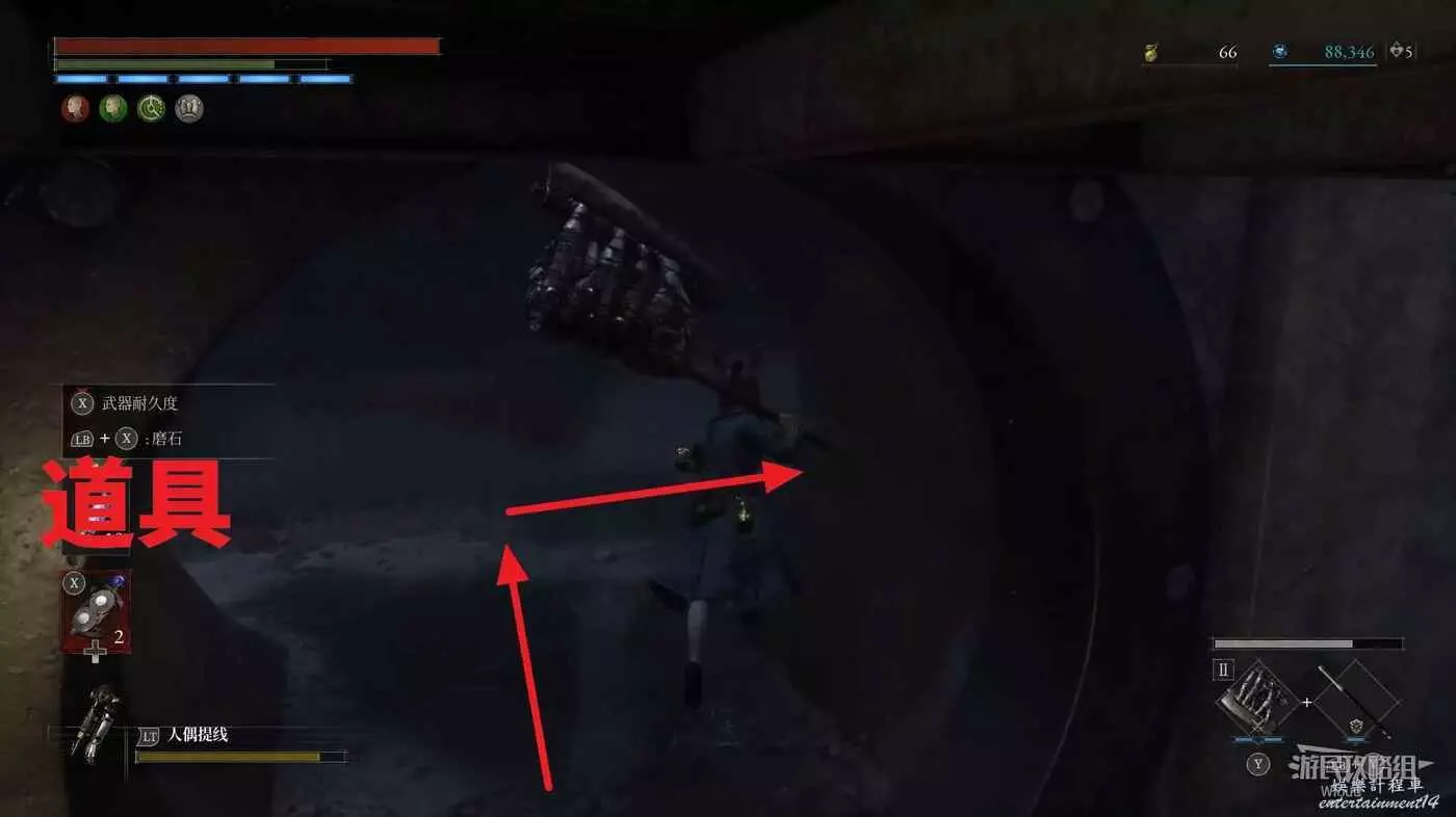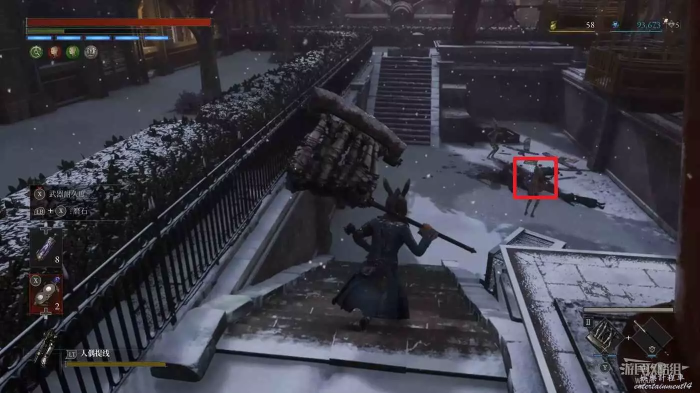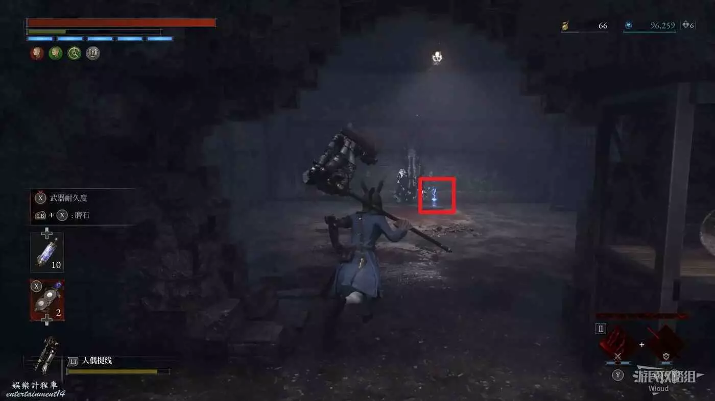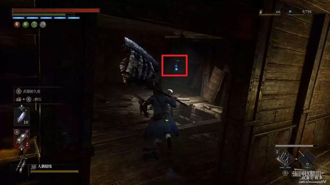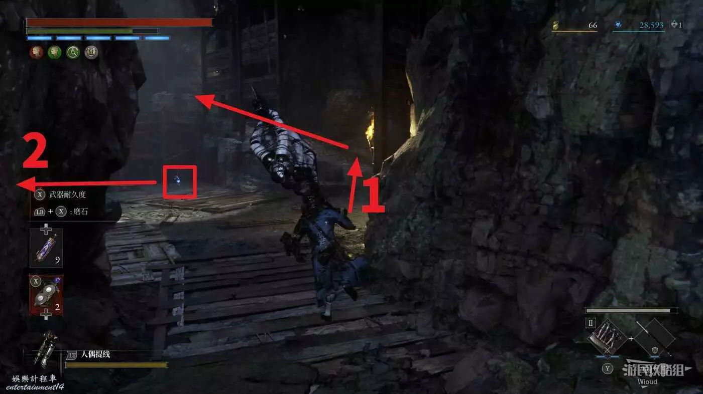 隨後回到剛從缺口跳下來的位置往右走,不遠處塔樓有個樓梯,此塔樓另一側可撿到一個【特殊抗性安瓶】。