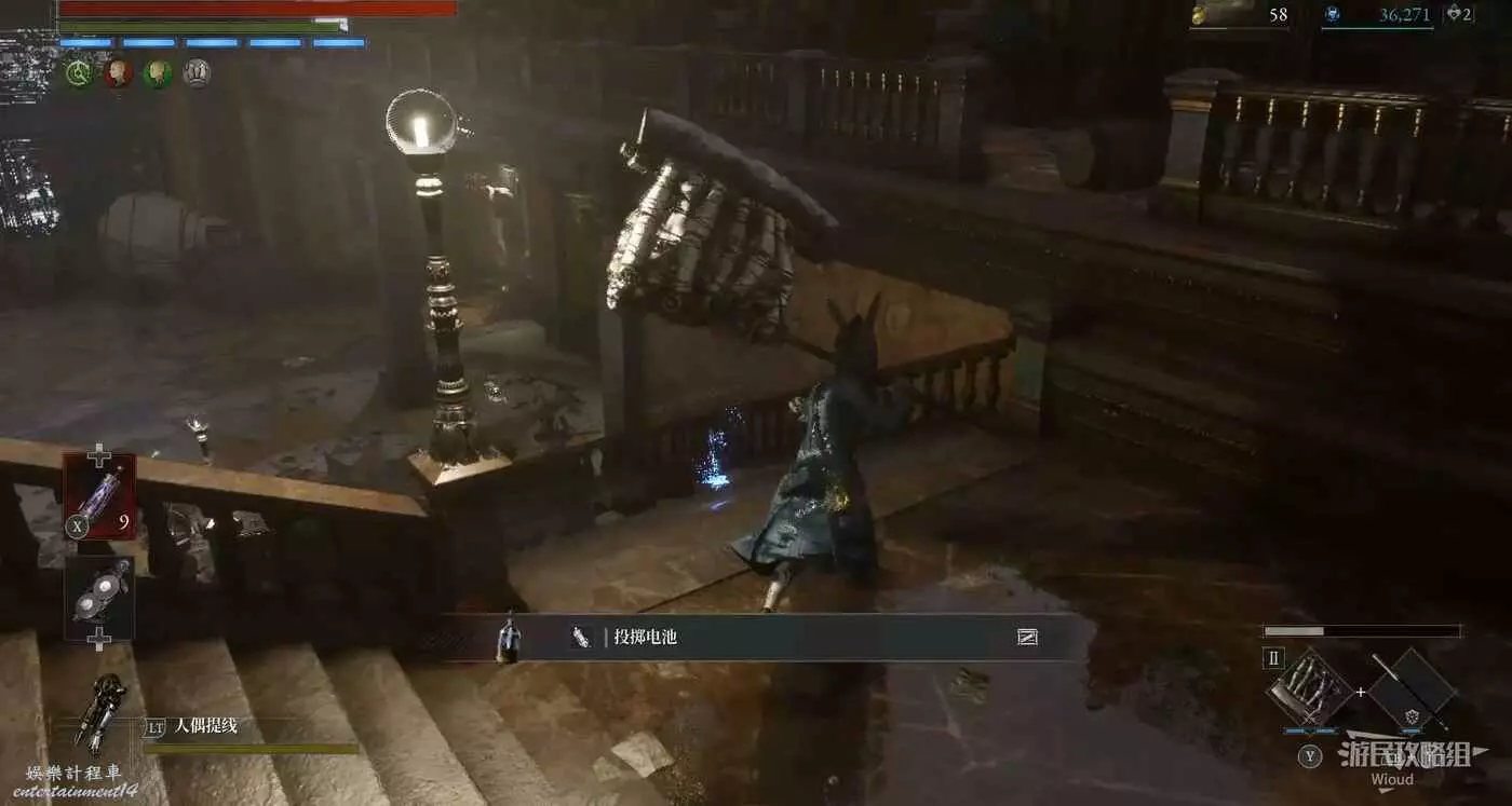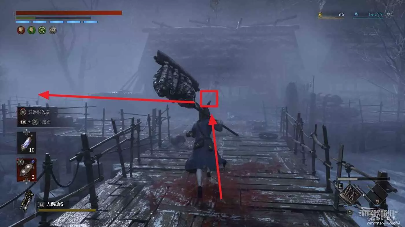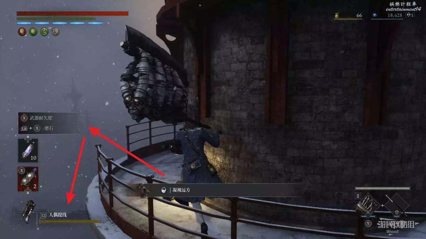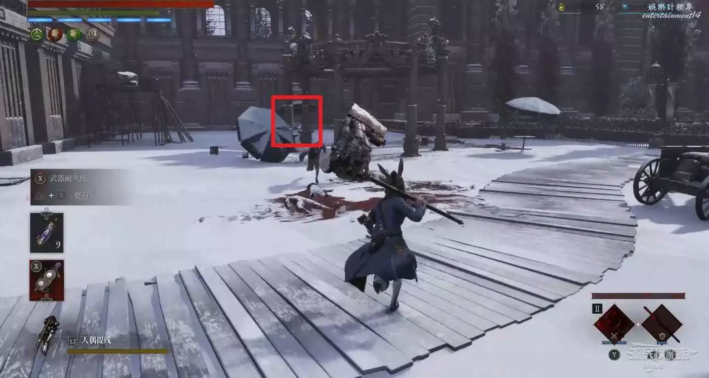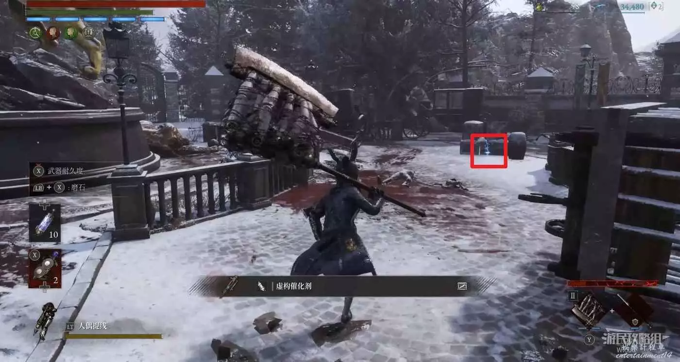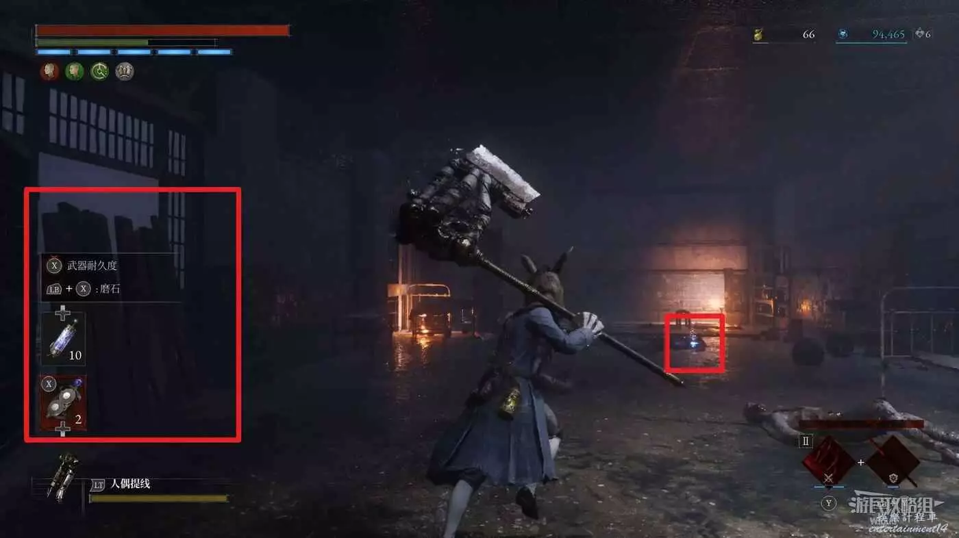 隨後回到剛從缺口跳下來的位置往右走,不遠處塔樓有個樓梯,此塔樓另一側可撿到一個【特殊抗性安瓶】。