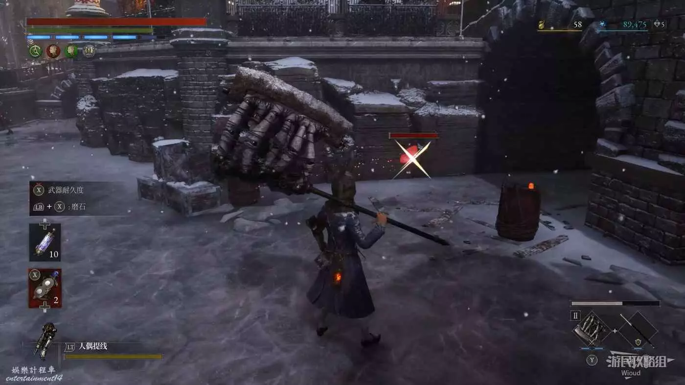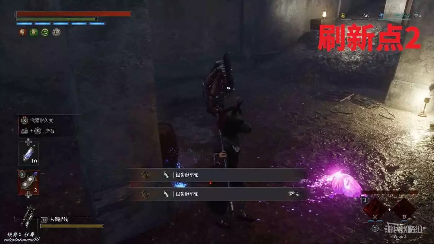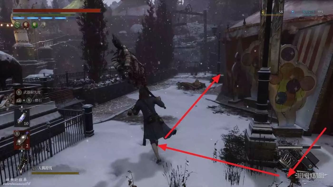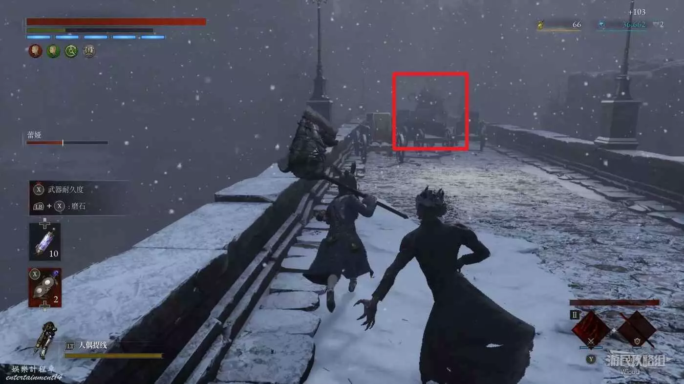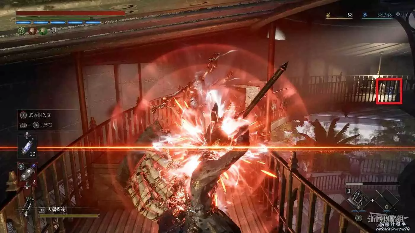 隨後回到剛從缺口跳下來的位置往右走,不遠處塔樓有個樓梯,此塔樓另一側可撿到一個【特殊抗性安瓶】。