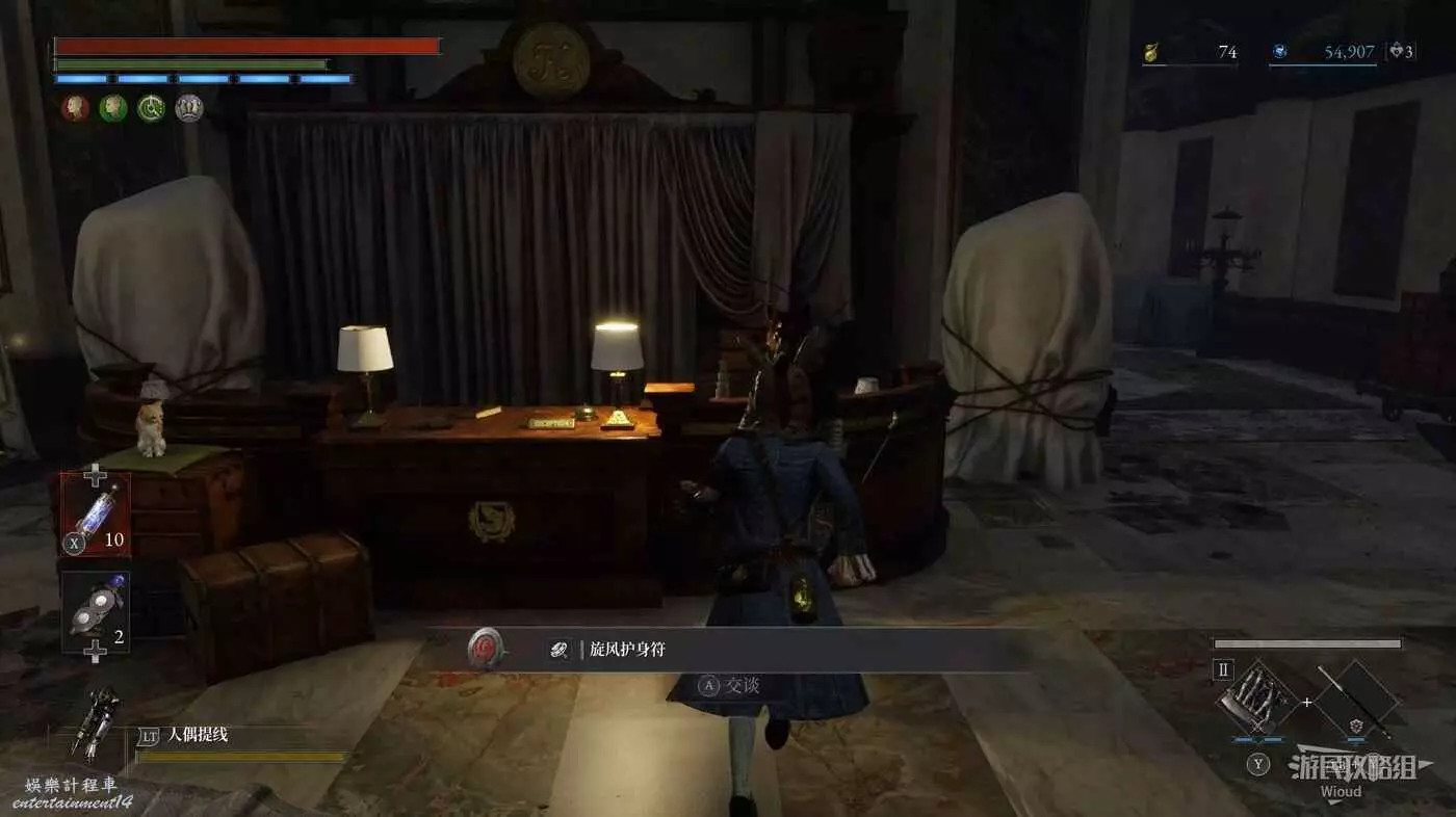 從暗道凹口出來貼著右牆走,中間會再次遇到一個可互動的書架,裡面寶箱可獲得【勇氣護身符】。