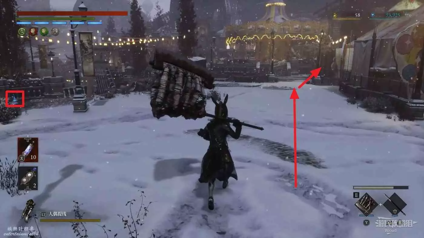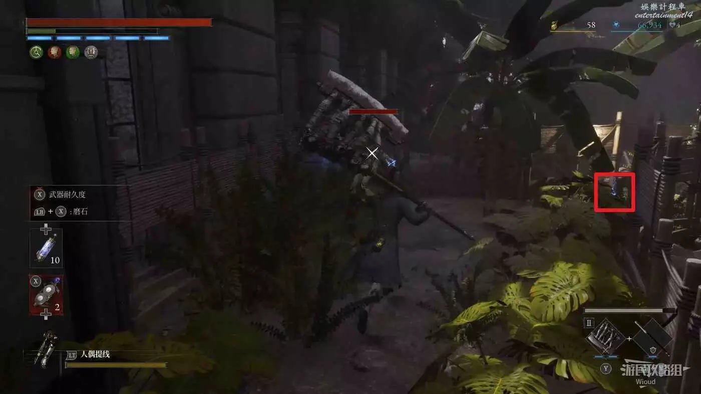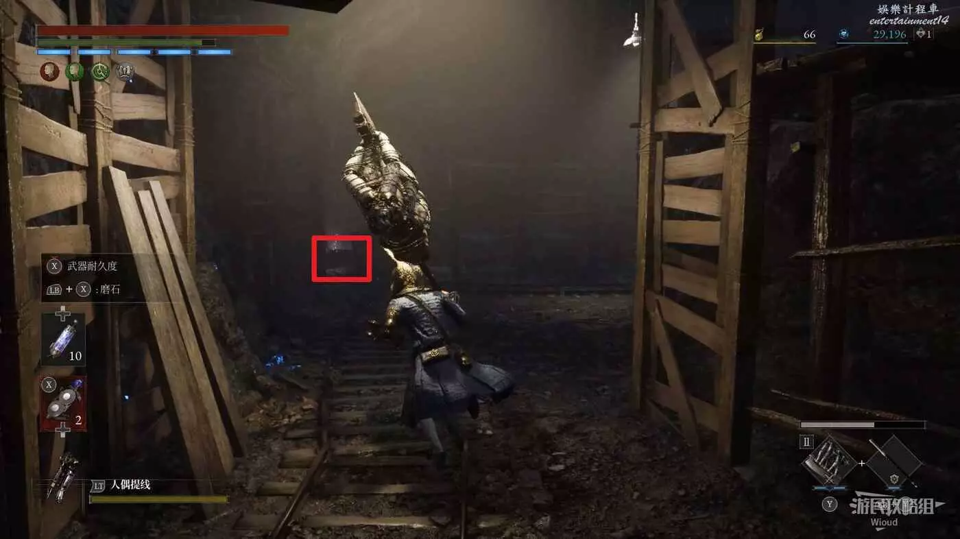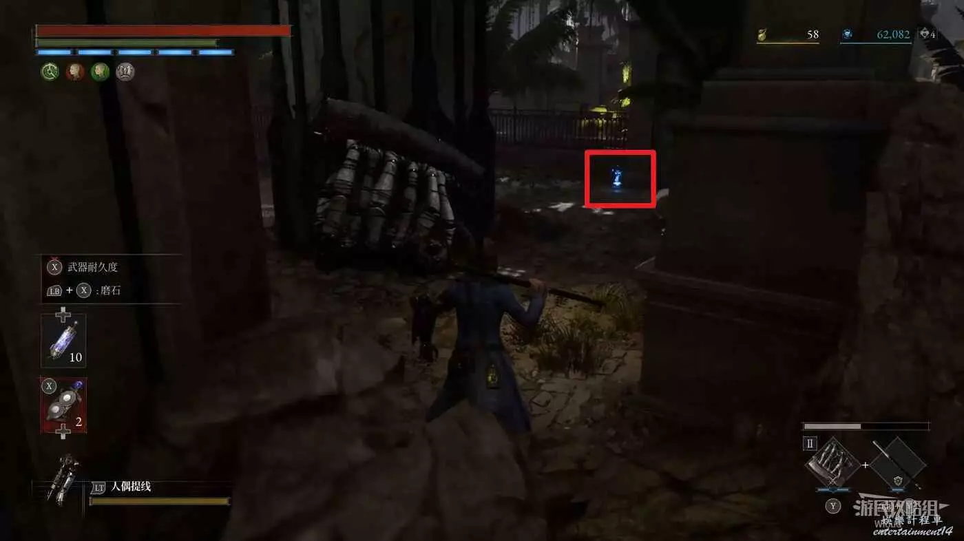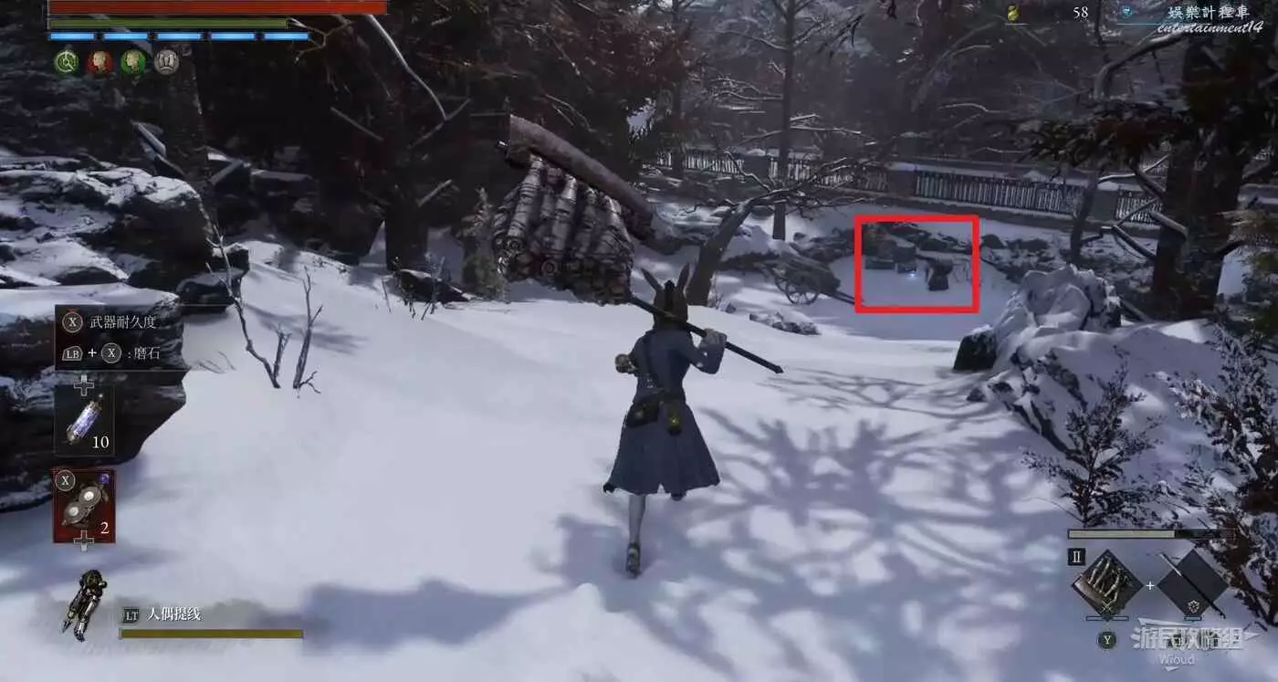 回到剛進這個區域的大入口往左走,不遠處紅框所示位置可以撿到第二個【狂歡幣】。
