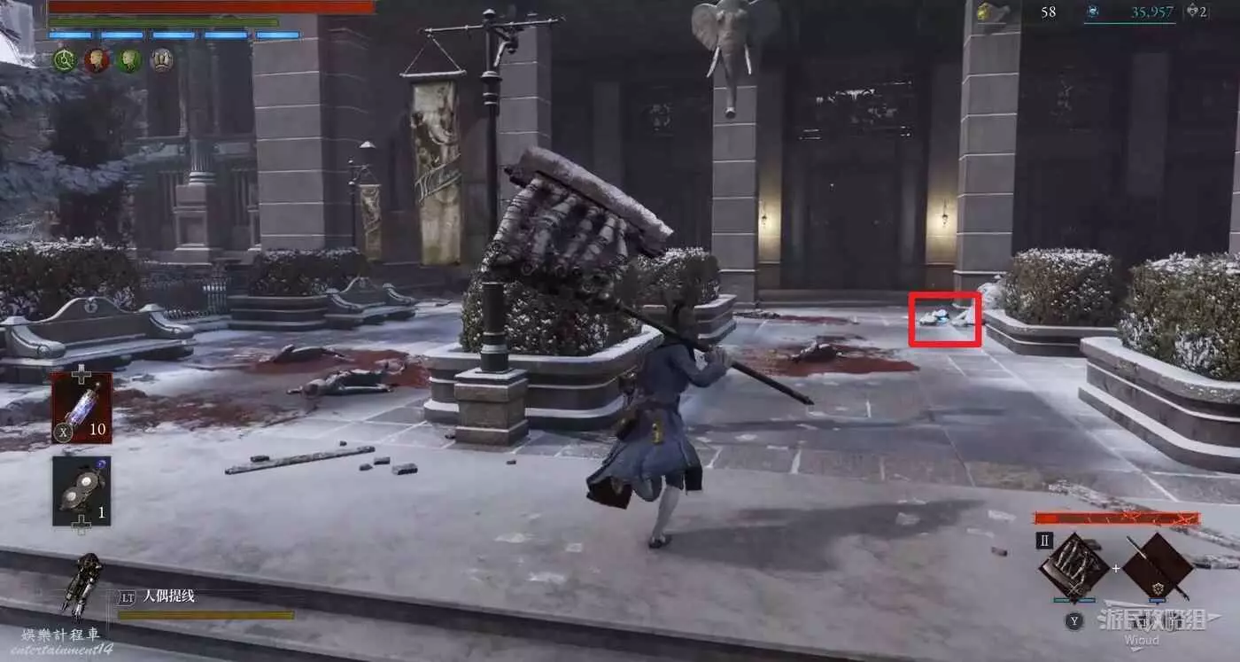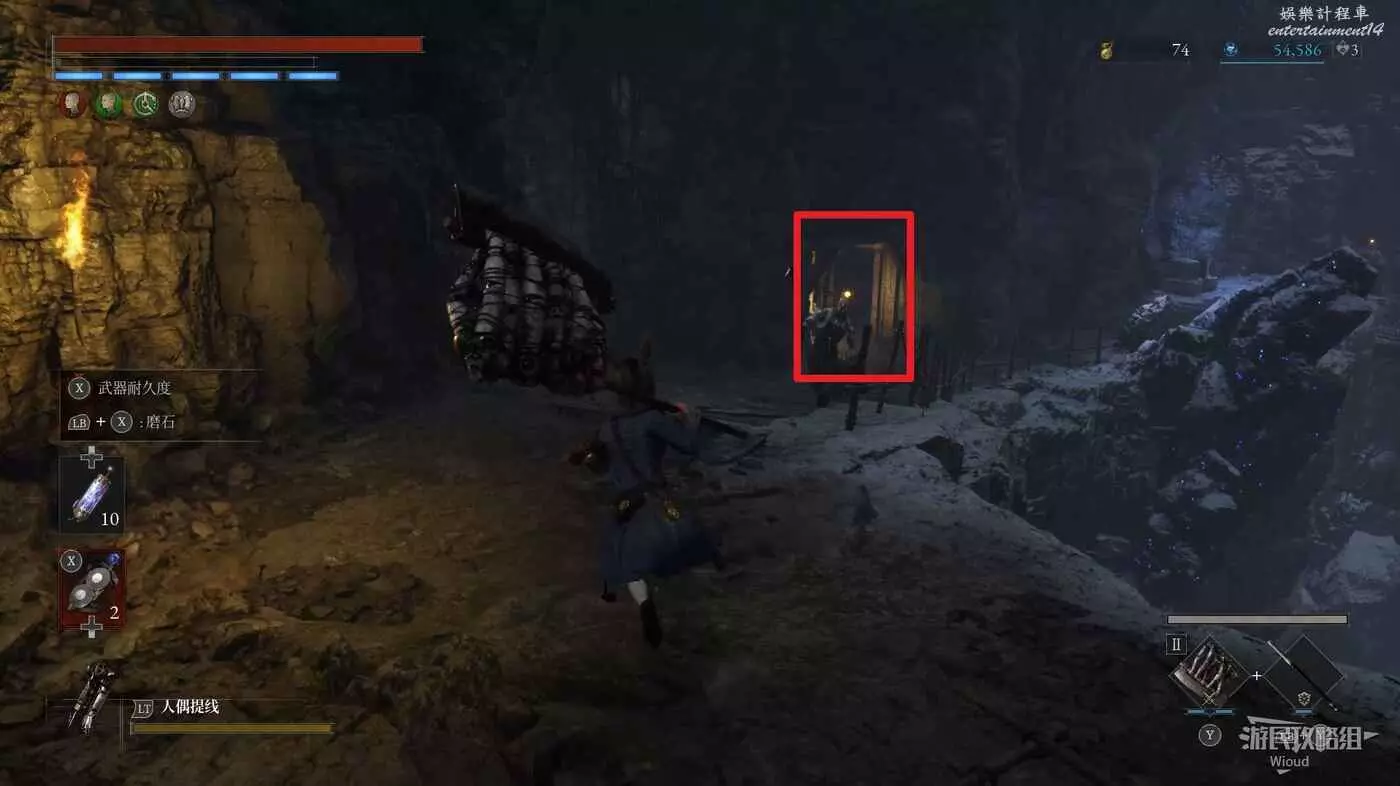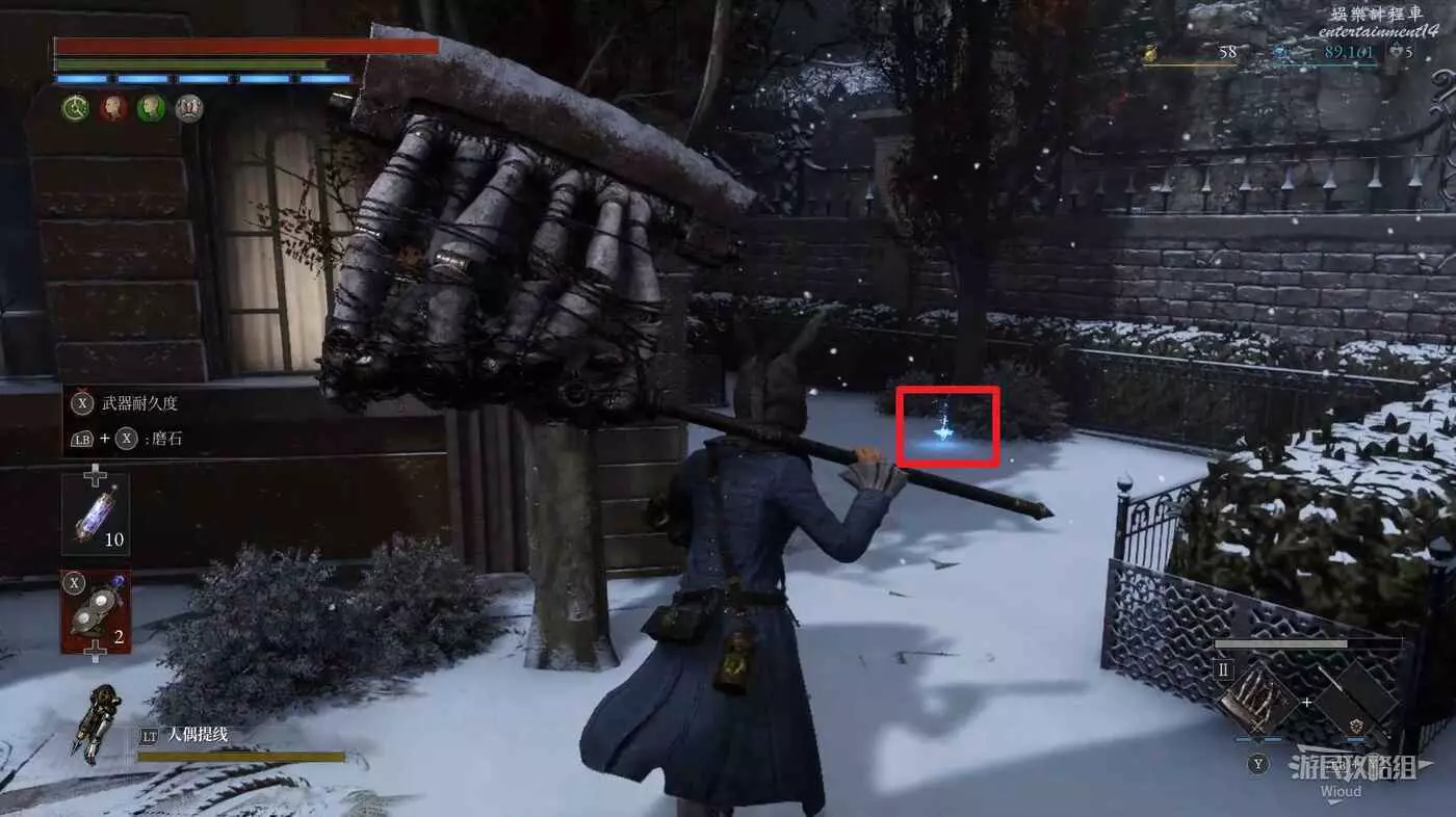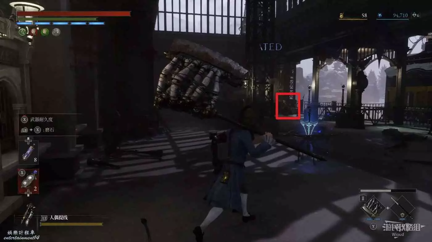 回到剛進這個區域的大入口往左走,不遠處紅框所示位置可以撿到第二個【狂歡幣】。