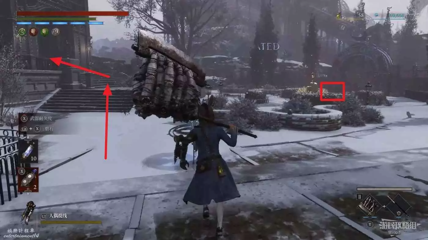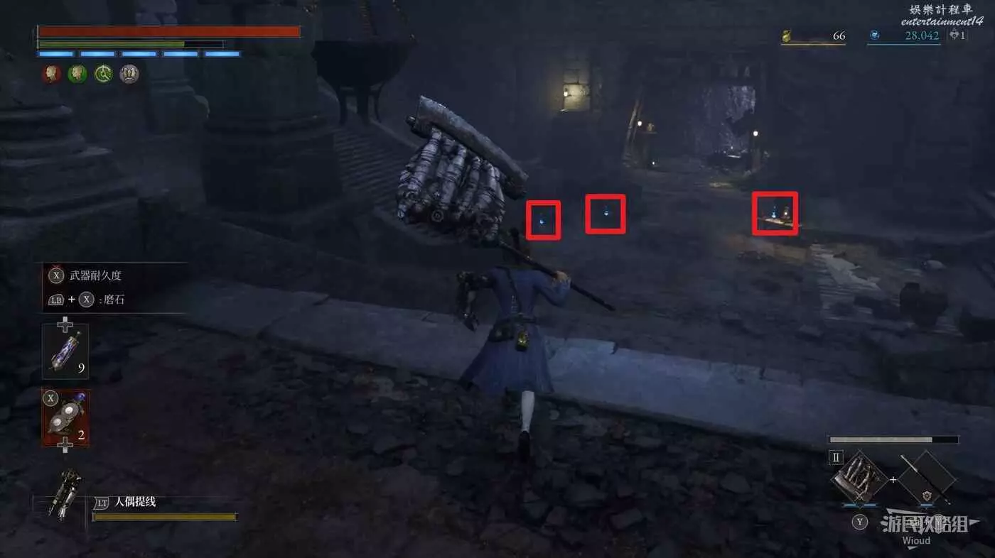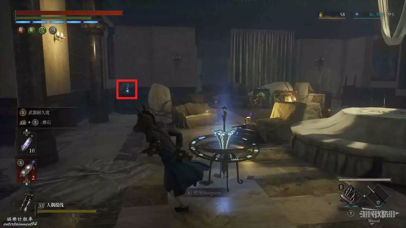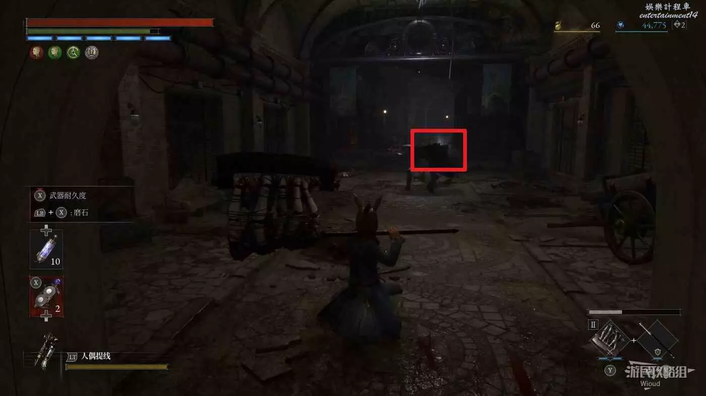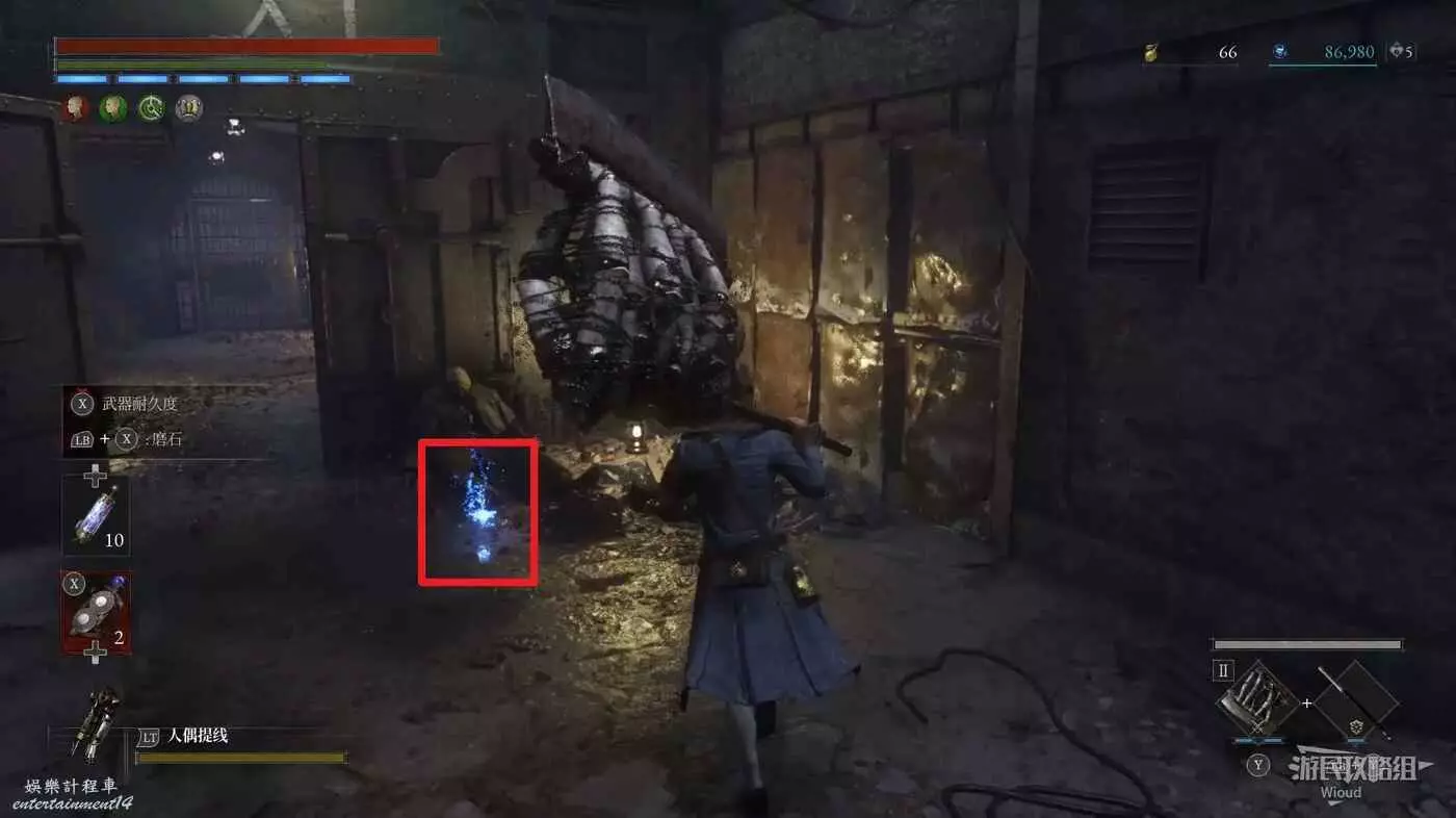 回到剛進這個區域的大入口往左走,不遠處紅框所示位置可以撿到第二個【狂歡幣】。