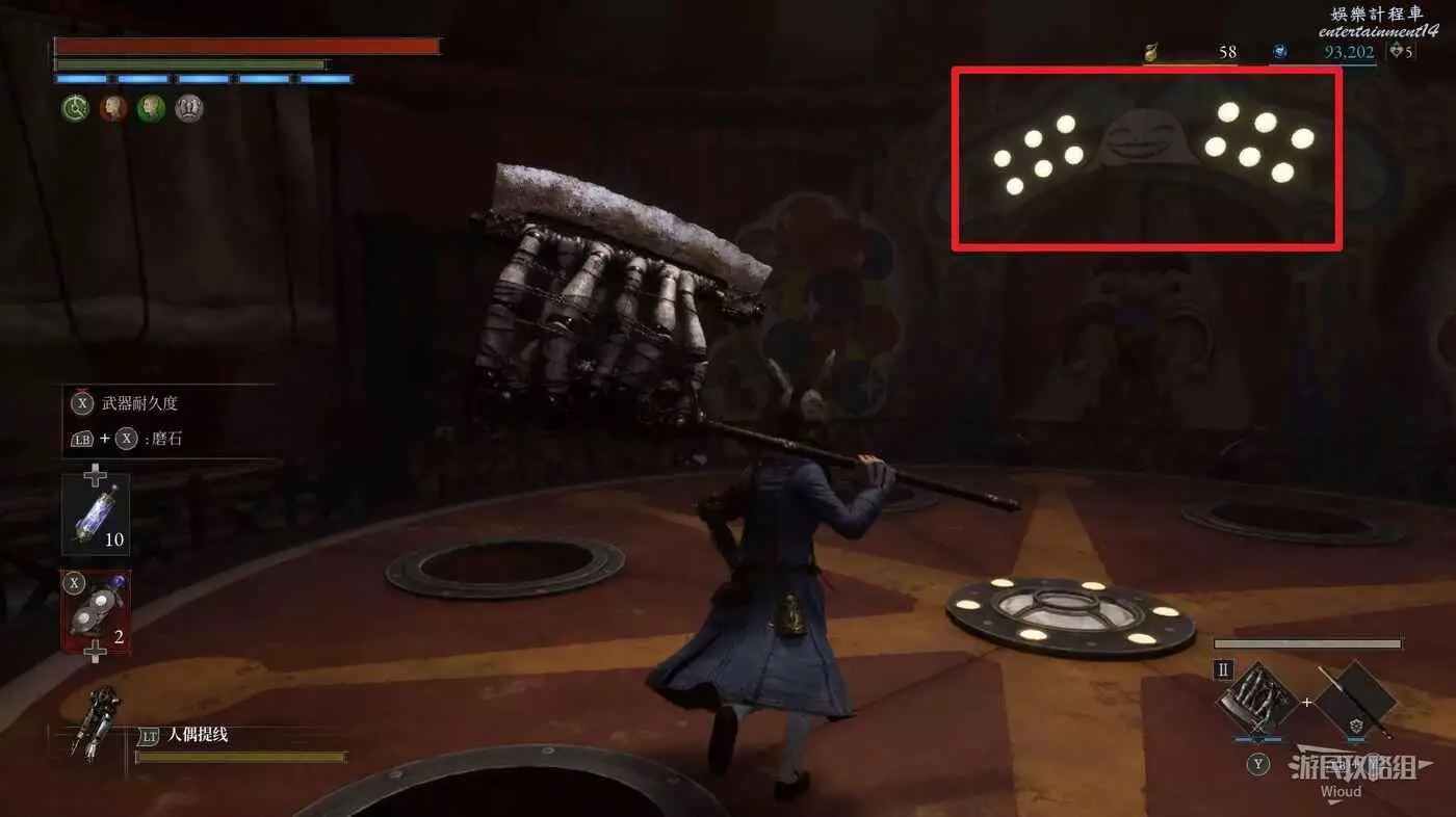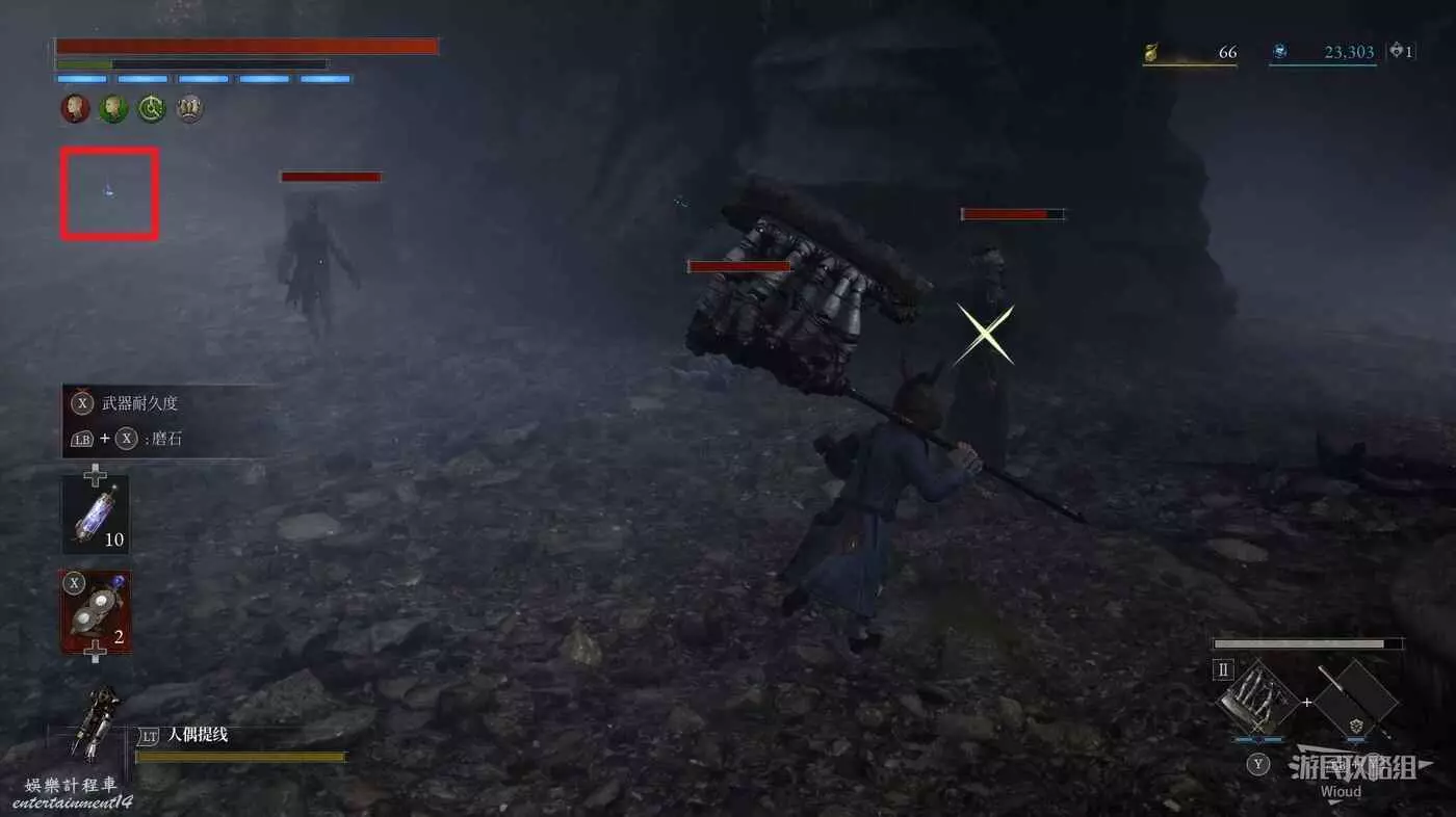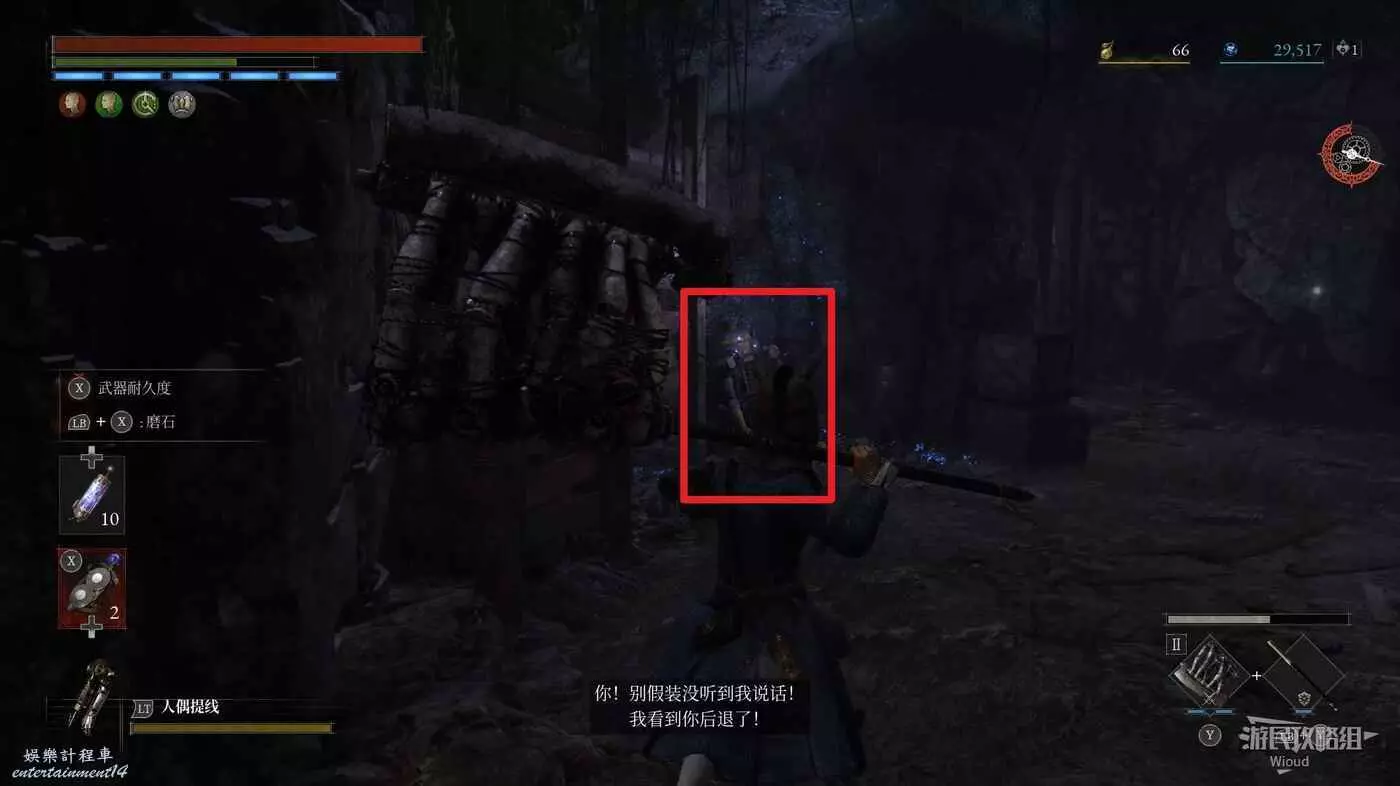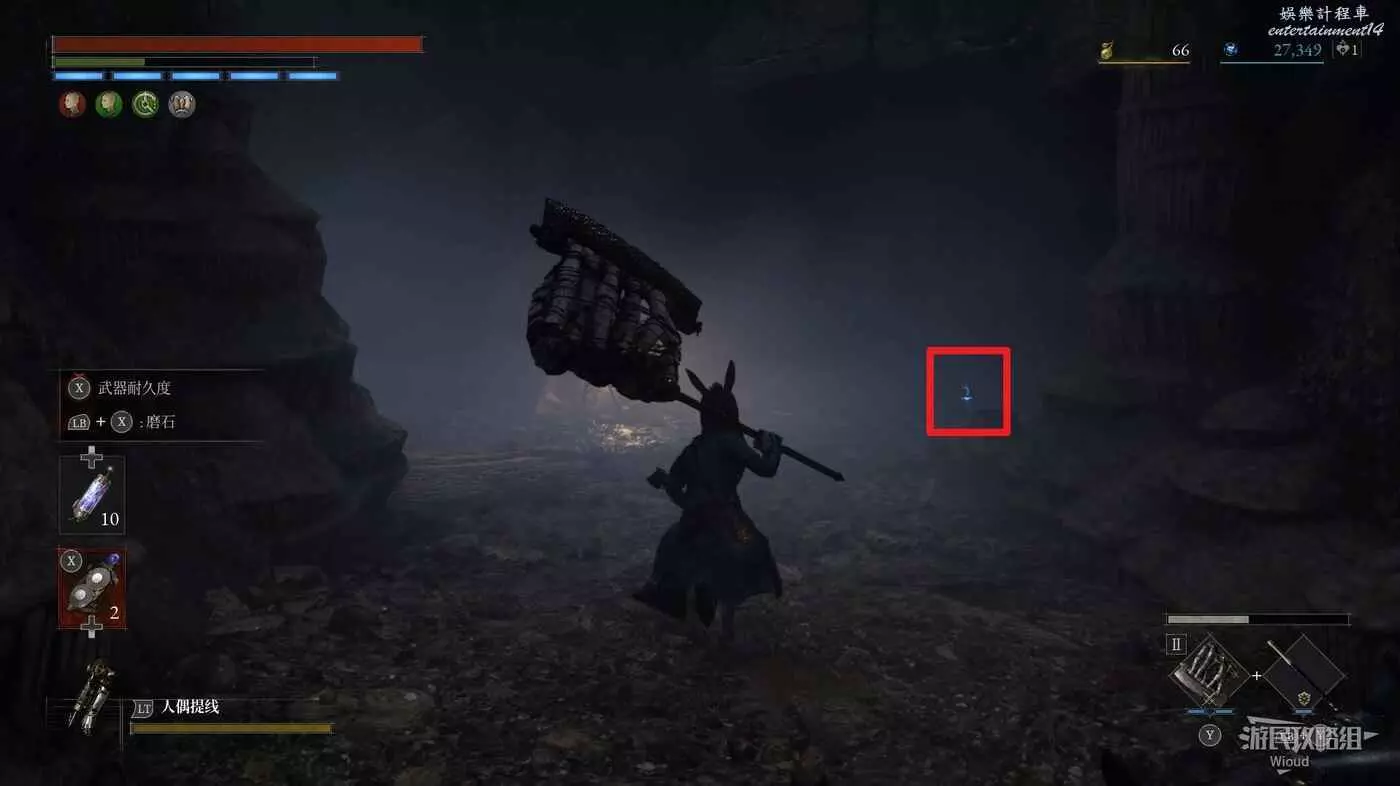 回到剛進這個區域的大入口往左走,不遠處紅框所示位置可以撿到第二個【狂歡幣】。