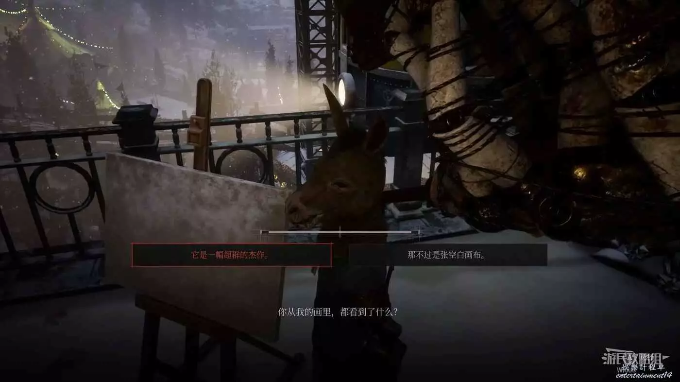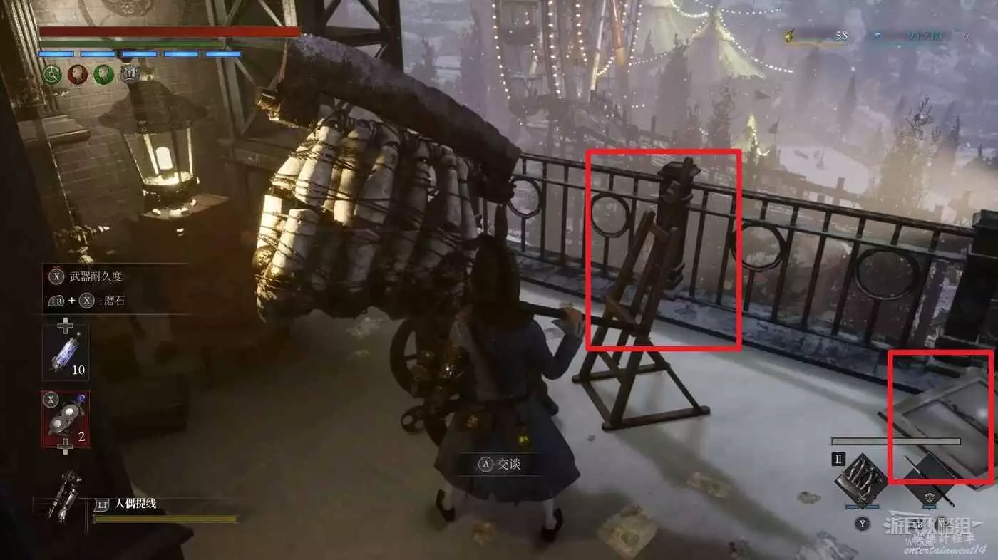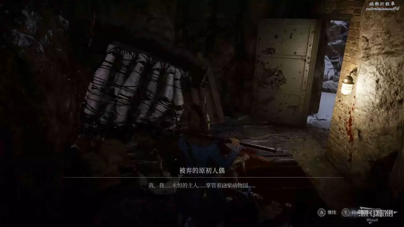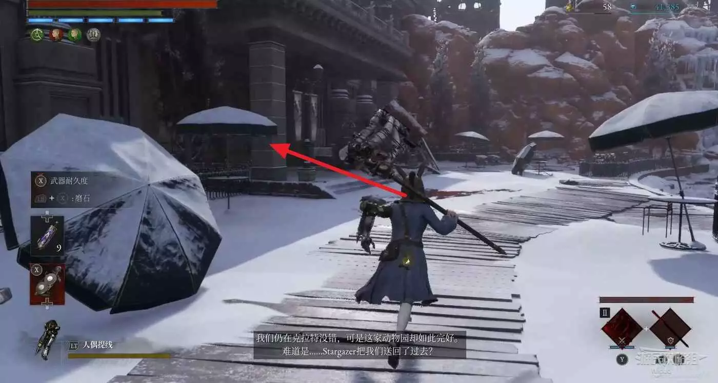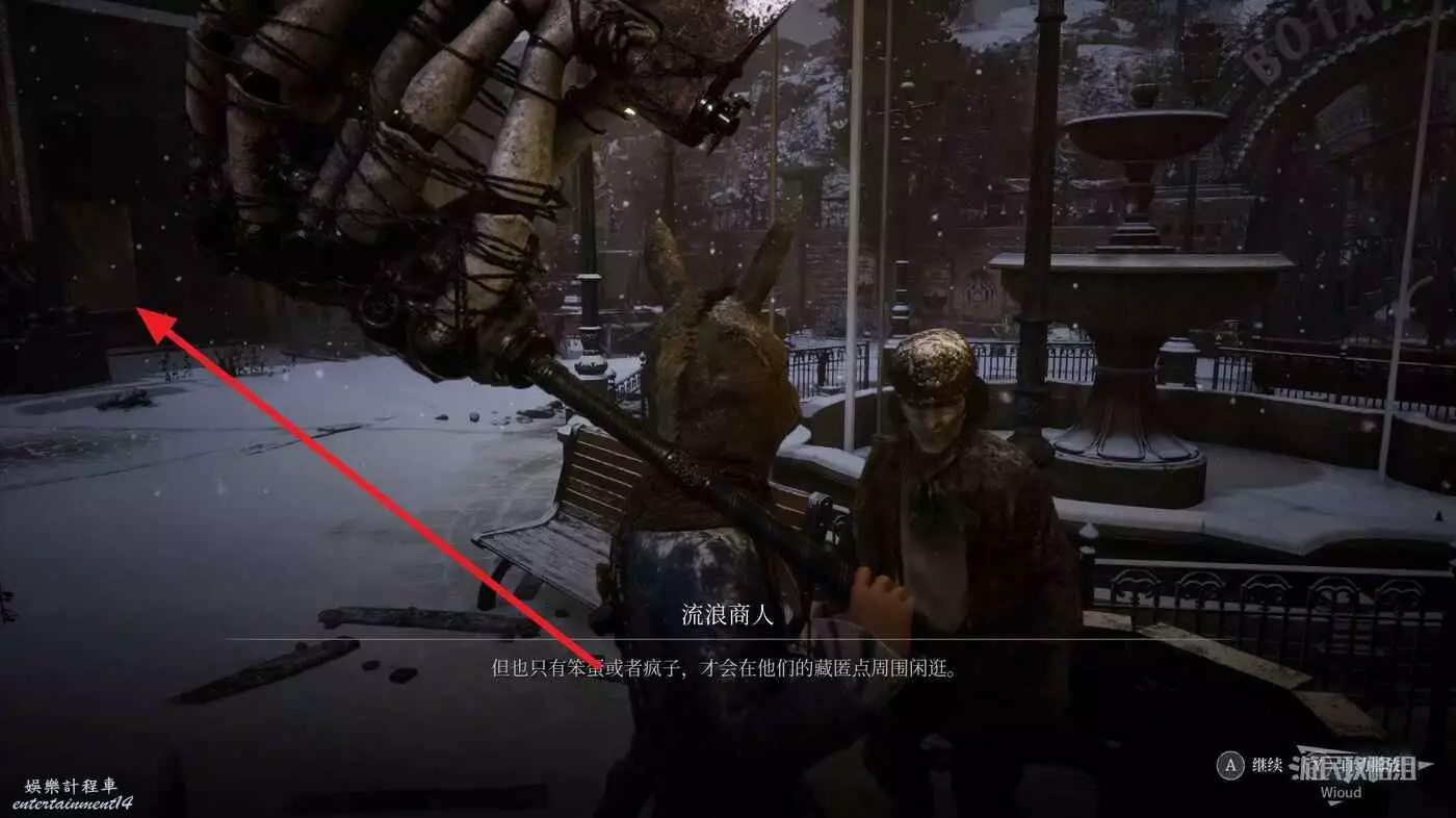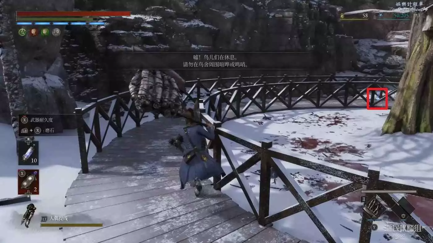 進入BOSS破冰出來的洞穴,爬裡面的梯子到高層,走到拐角處與地面的人偶對話被警告。