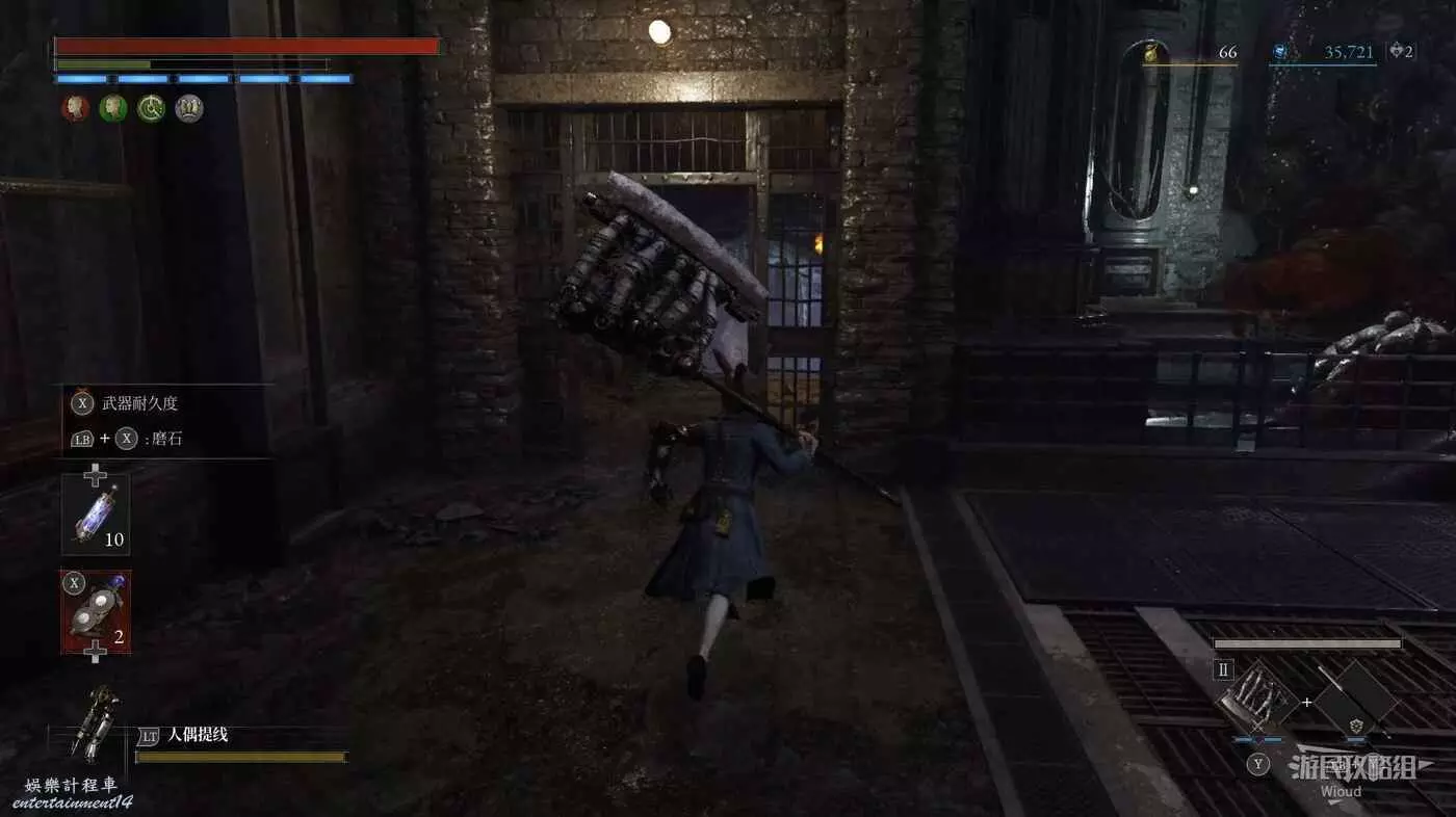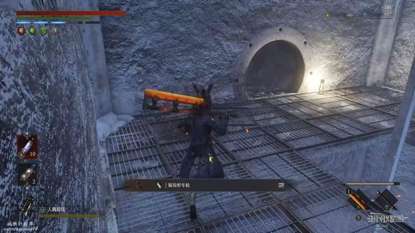 開始我們只有一條路可走,中間左側會遇到一個暫時無法打開的大門,無視此處繼續沿路走,直到看見一個被撞開的籠子,右側第二個籠子裡可以撿到一個【電閃雷鳴研磨劑】。