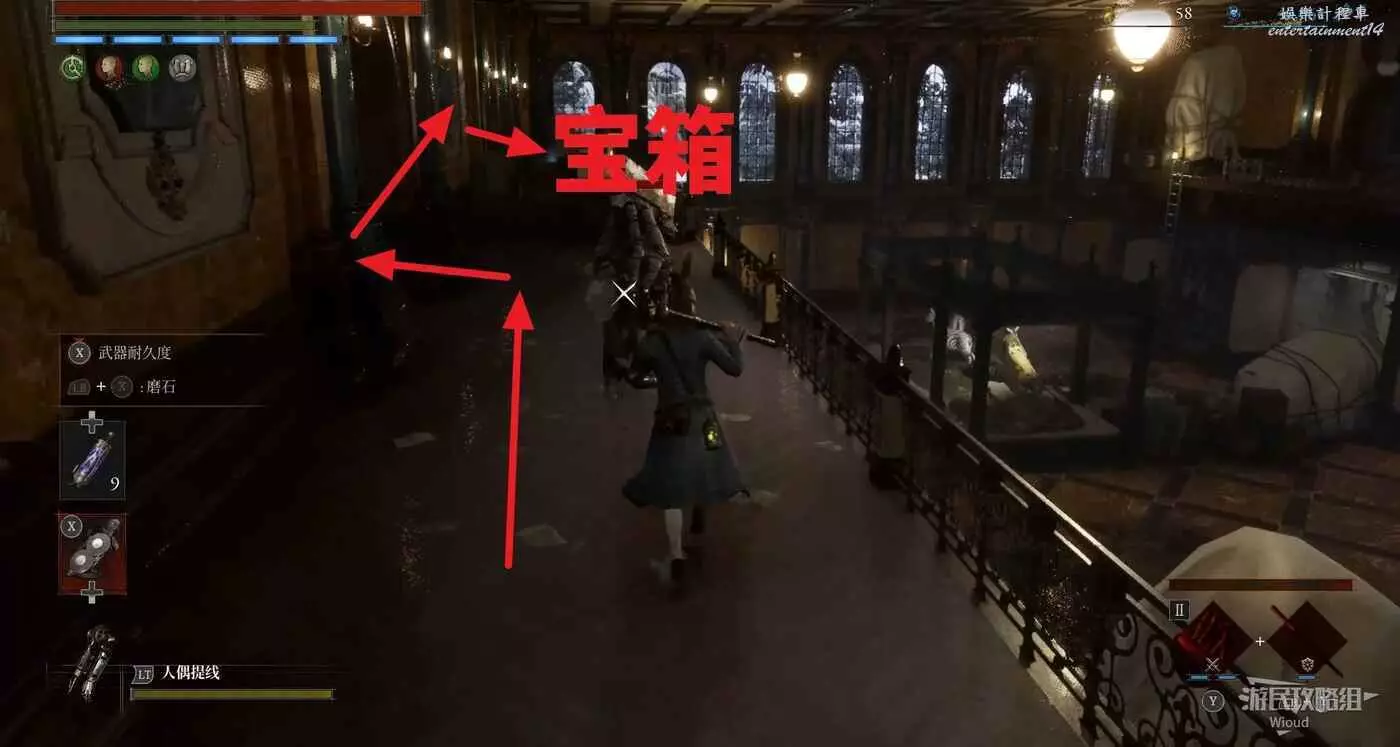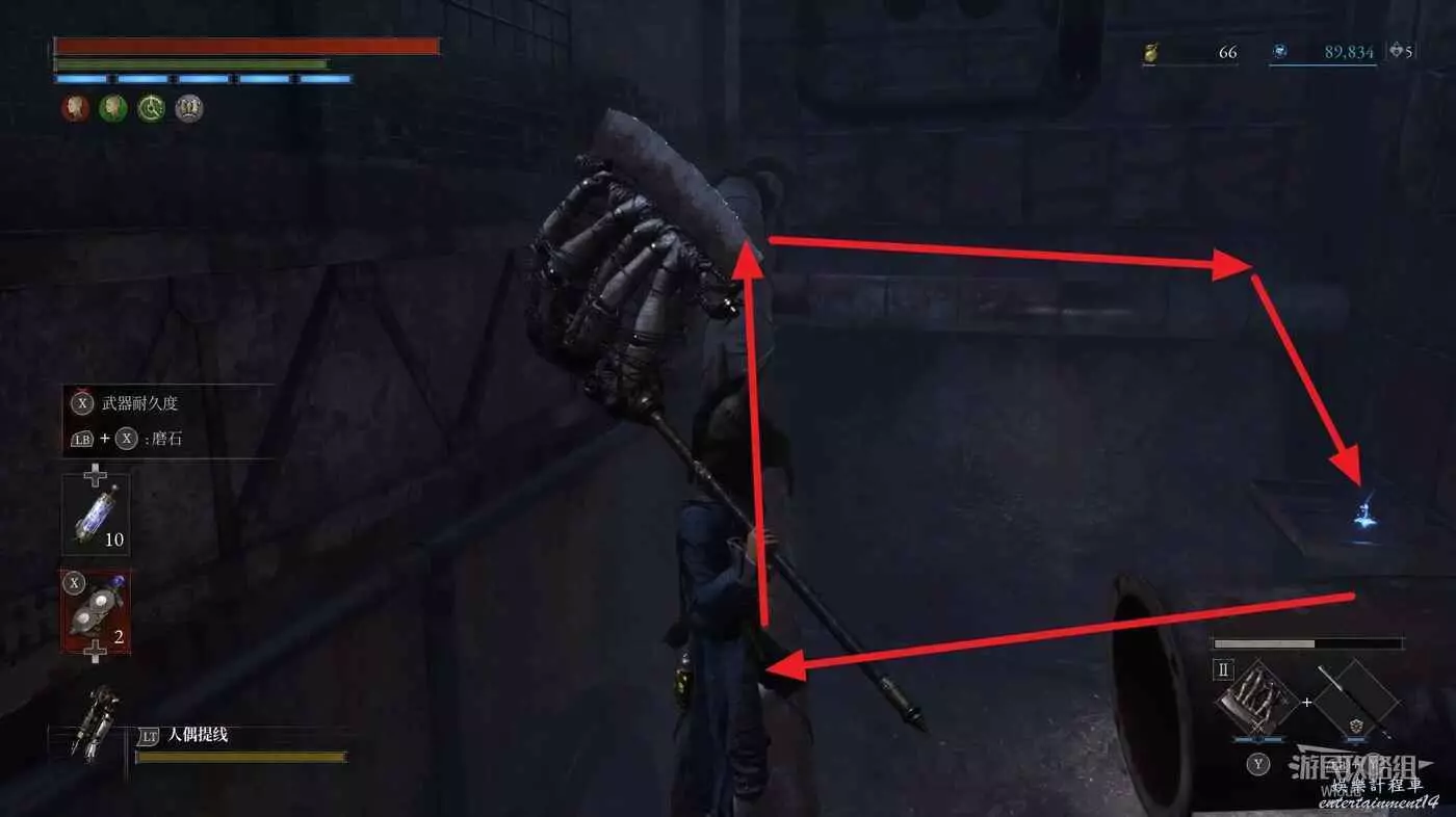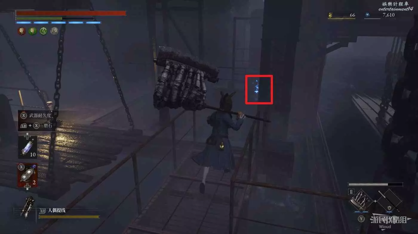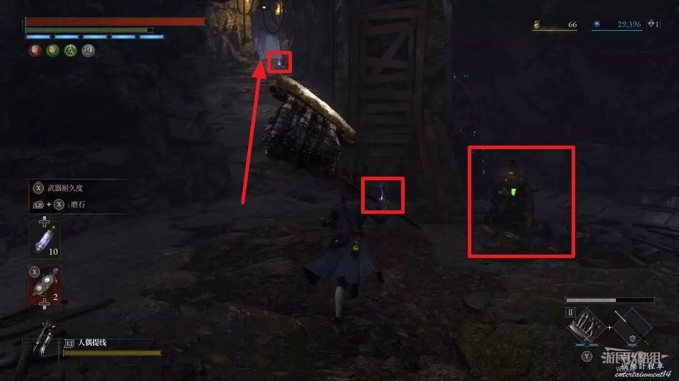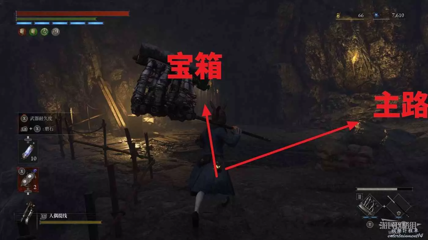 完事爬到此塔樓上面,沿著下圖路線穿過鎖鏈走到前方模板處再右拐走到頭,跳到下面平台可開啟一個寶箱,第一次拾取裡面寶物獲得一個【軍團彈匣】,第二次拾取獲得【破損的切割磨石】與【破損的穿透磨石】。