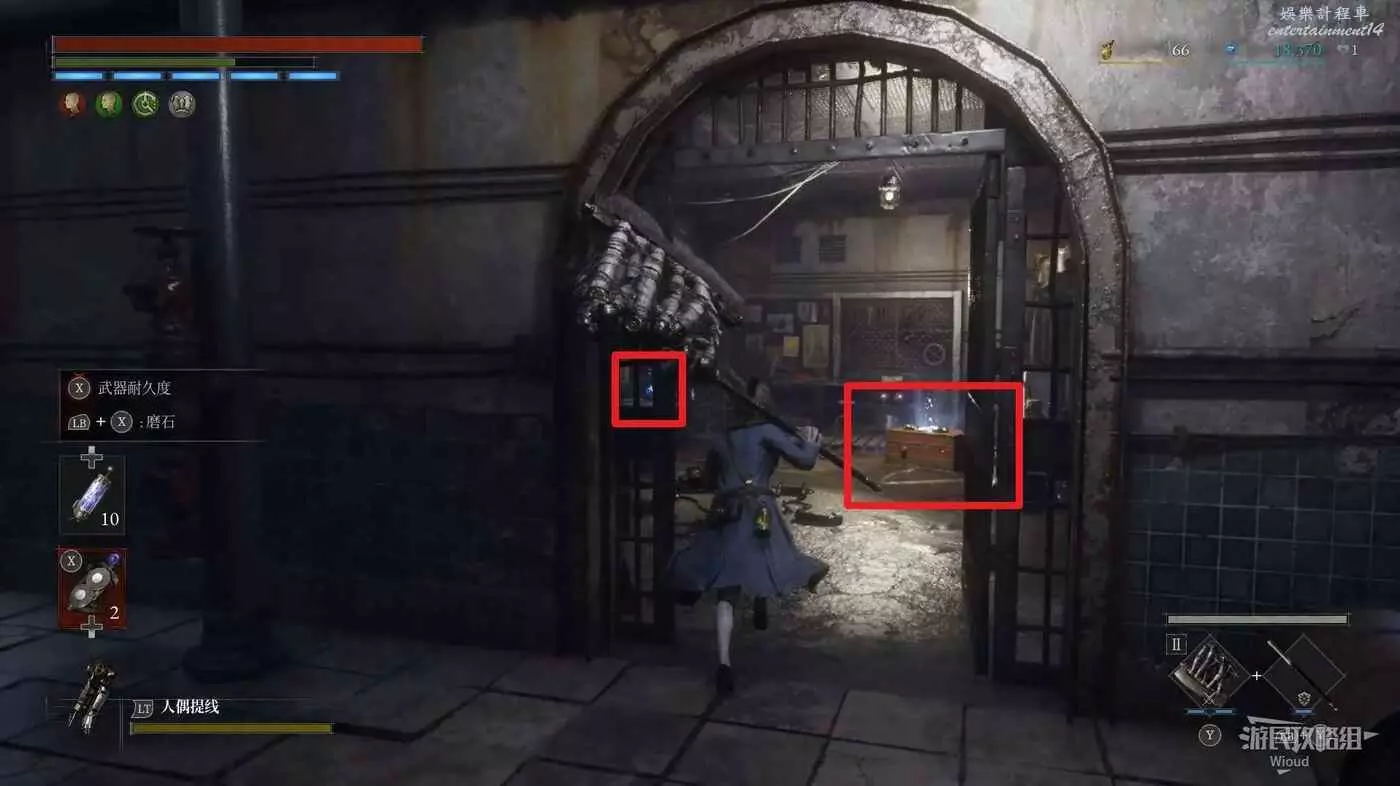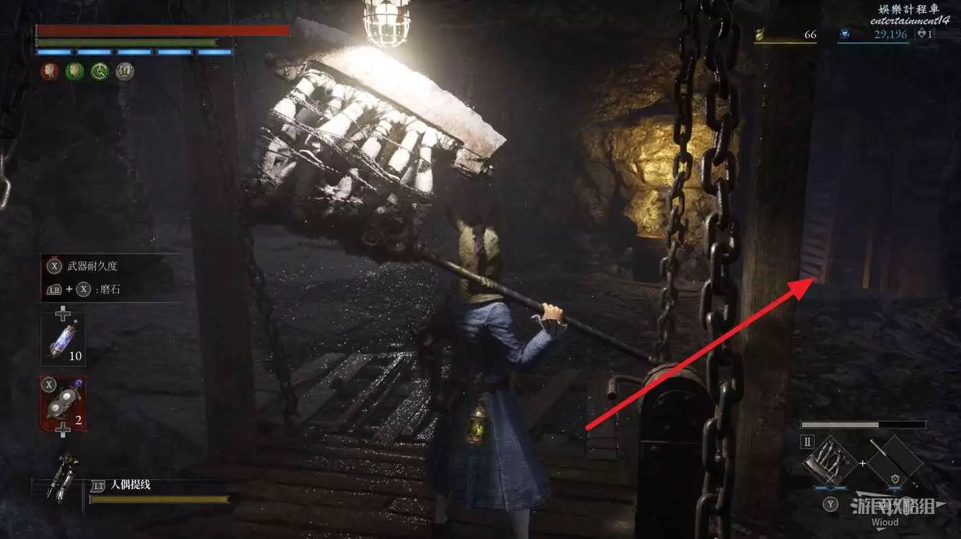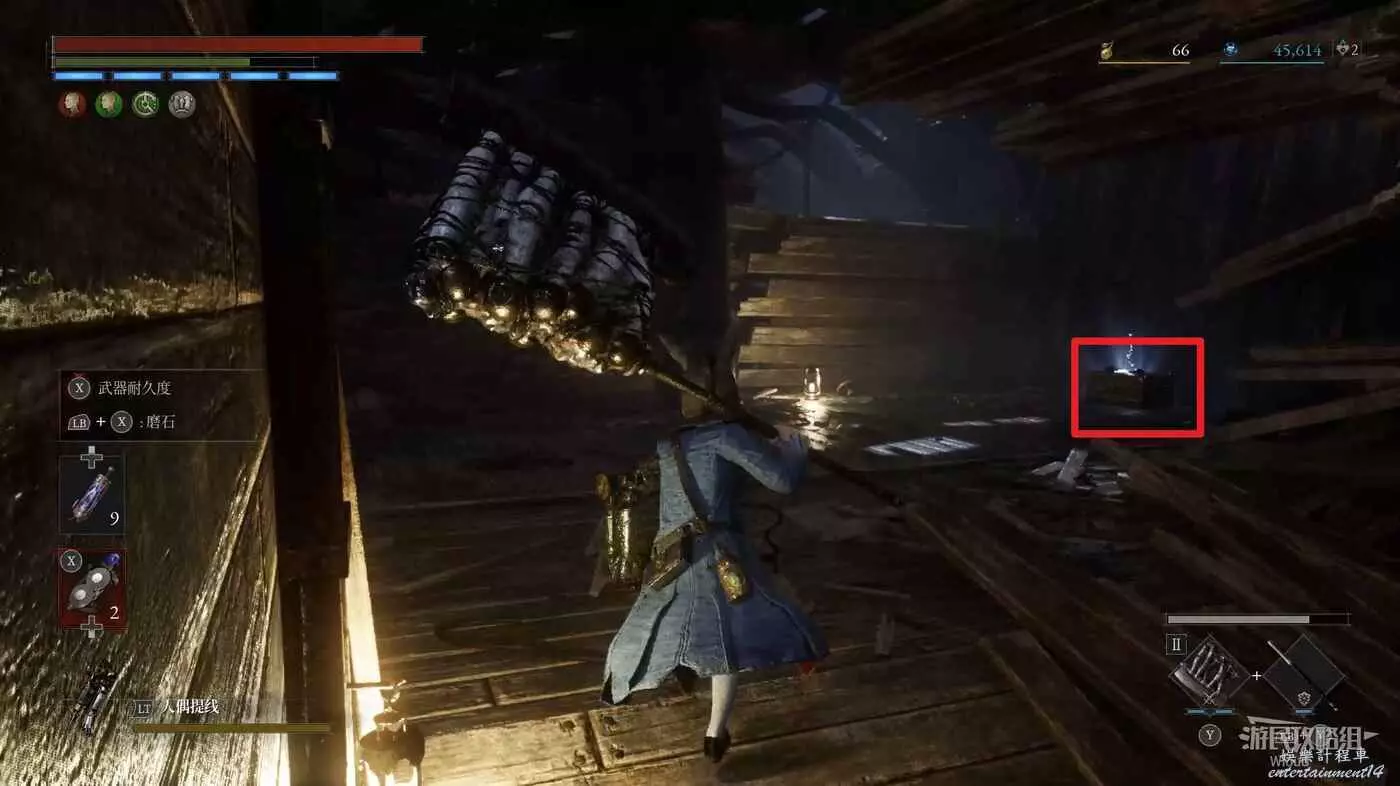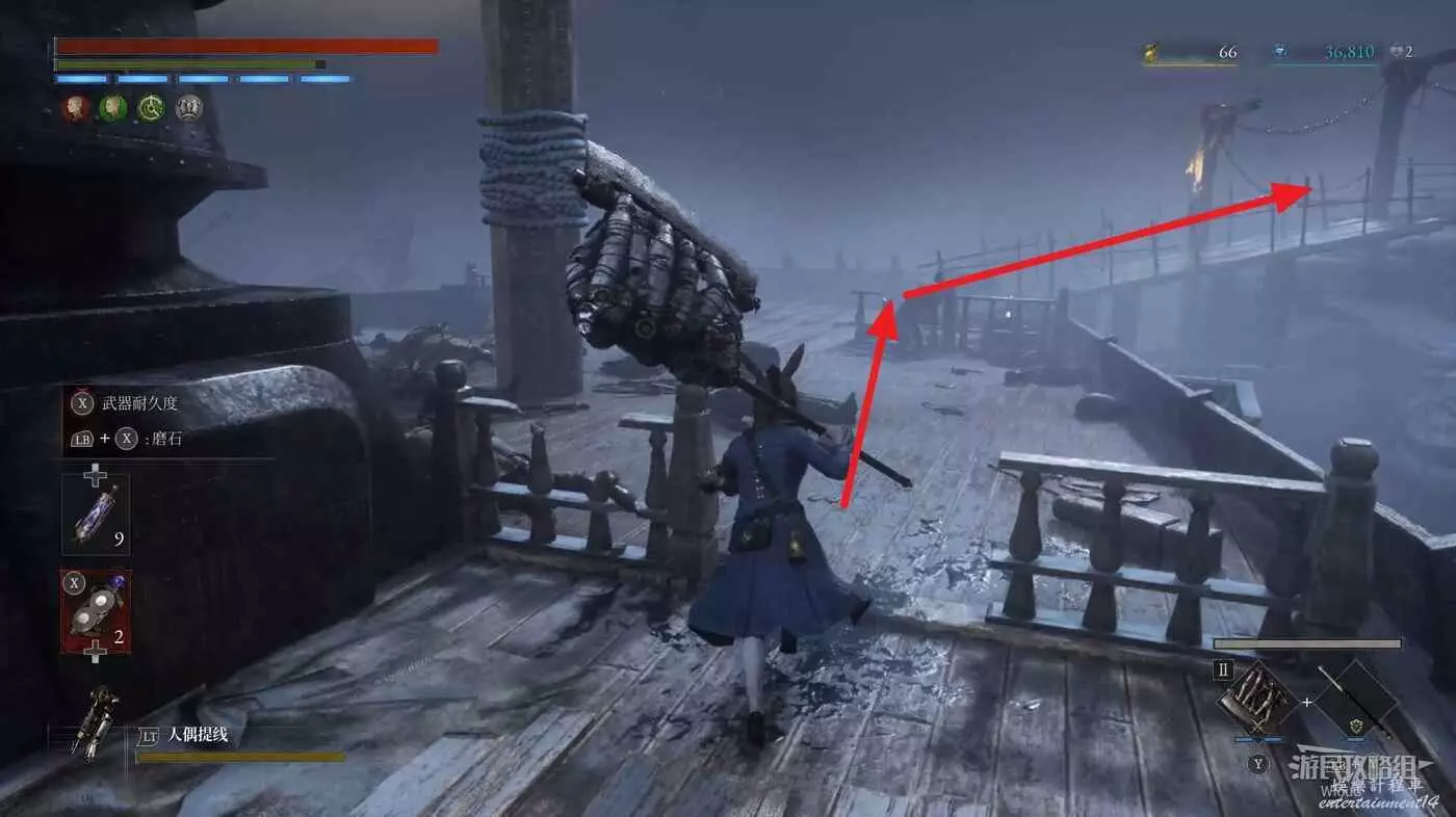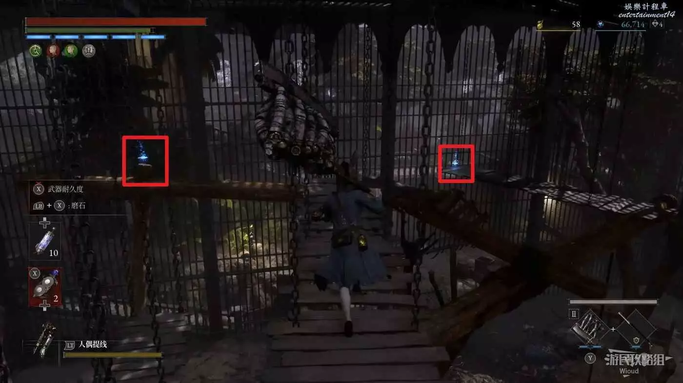 完事爬到此塔樓上面,沿著下圖路線穿過鎖鏈走到前方模板處再右拐走到頭,跳到下面平台可開啟一個寶箱,第一次拾取裡面寶物獲得一個【軍團彈匣】,第二次拾取獲得【破損的切割磨石】與【破損的穿透磨石】。