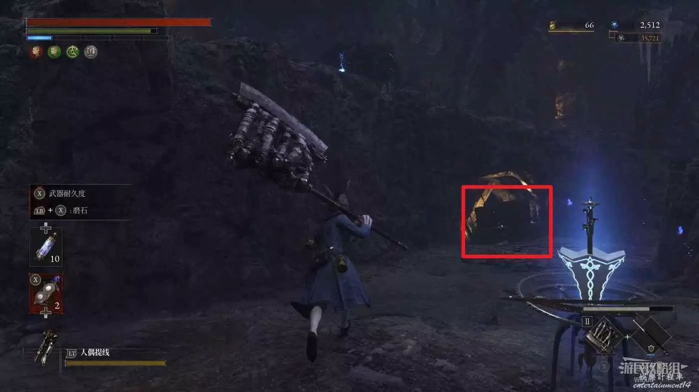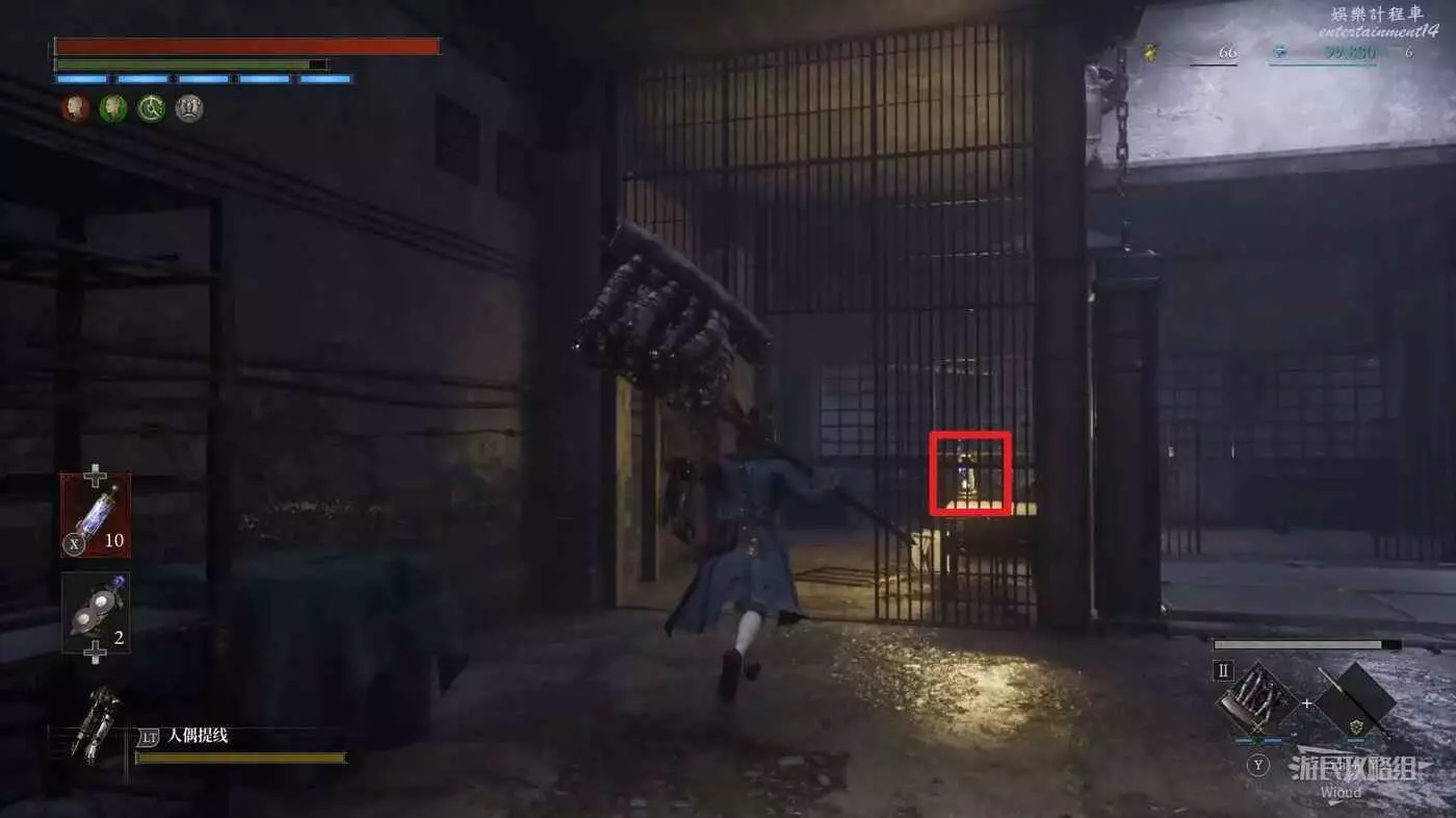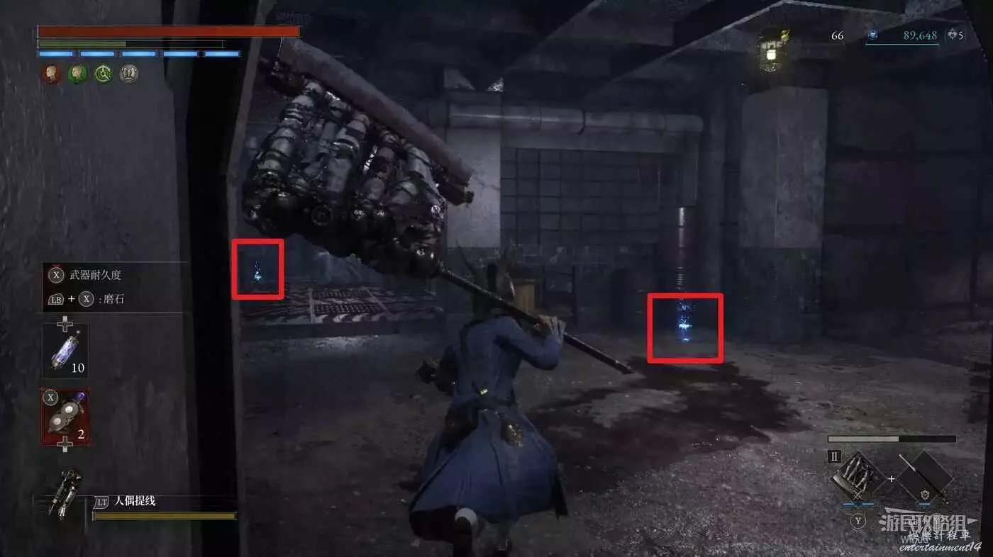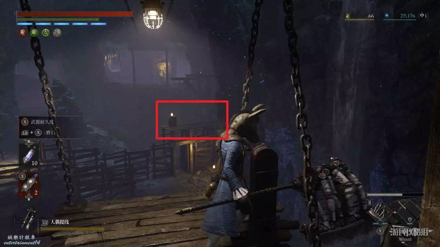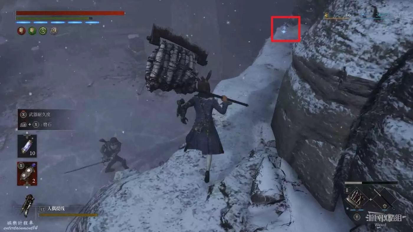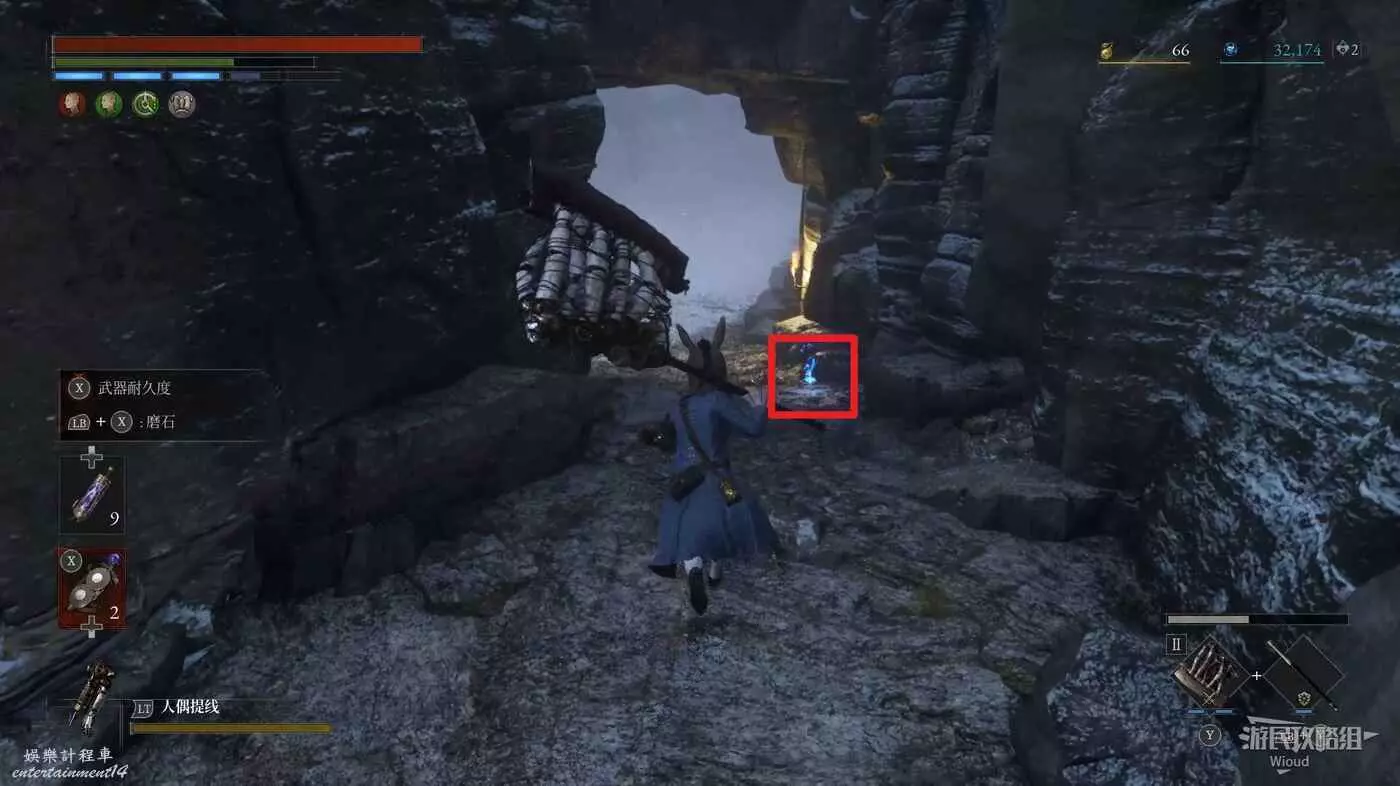 完事爬到此塔樓上面,沿著下圖路線穿過鎖鏈走到前方模板處再右拐走到頭,跳到下面平台可開啟一個寶箱,第一次拾取裡面寶物獲得一個【軍團彈匣】,第二次拾取獲得【破損的切割磨石】與【破損的穿透磨石】。