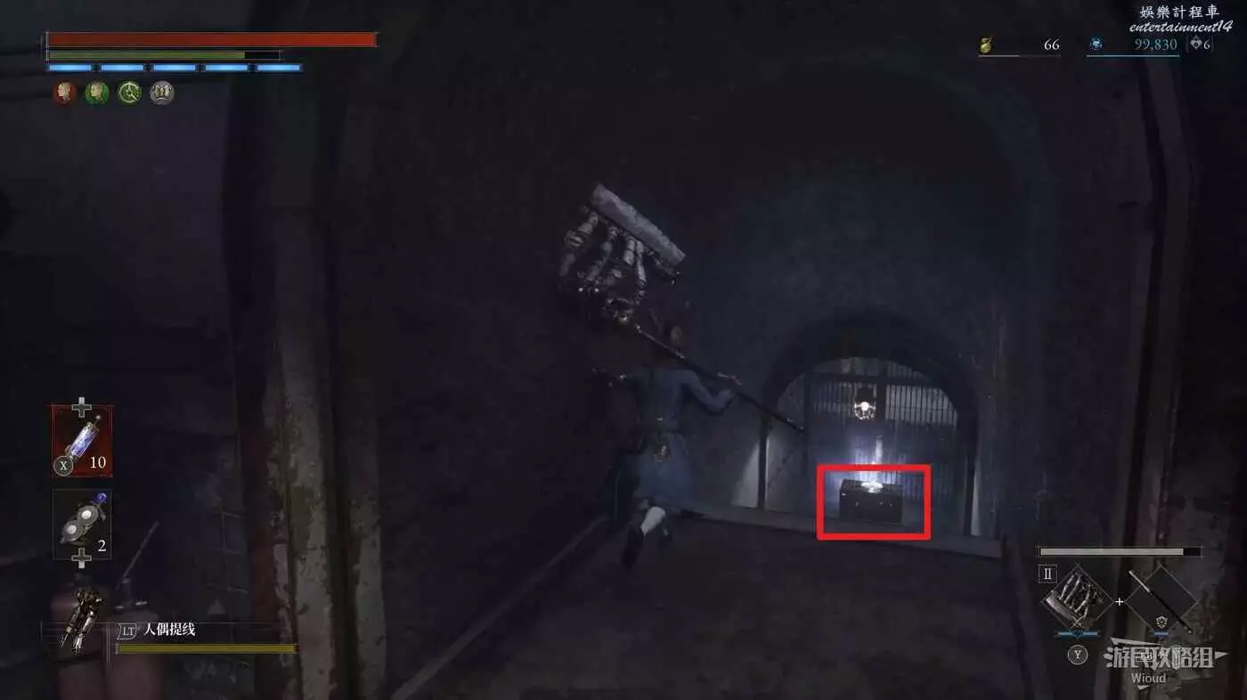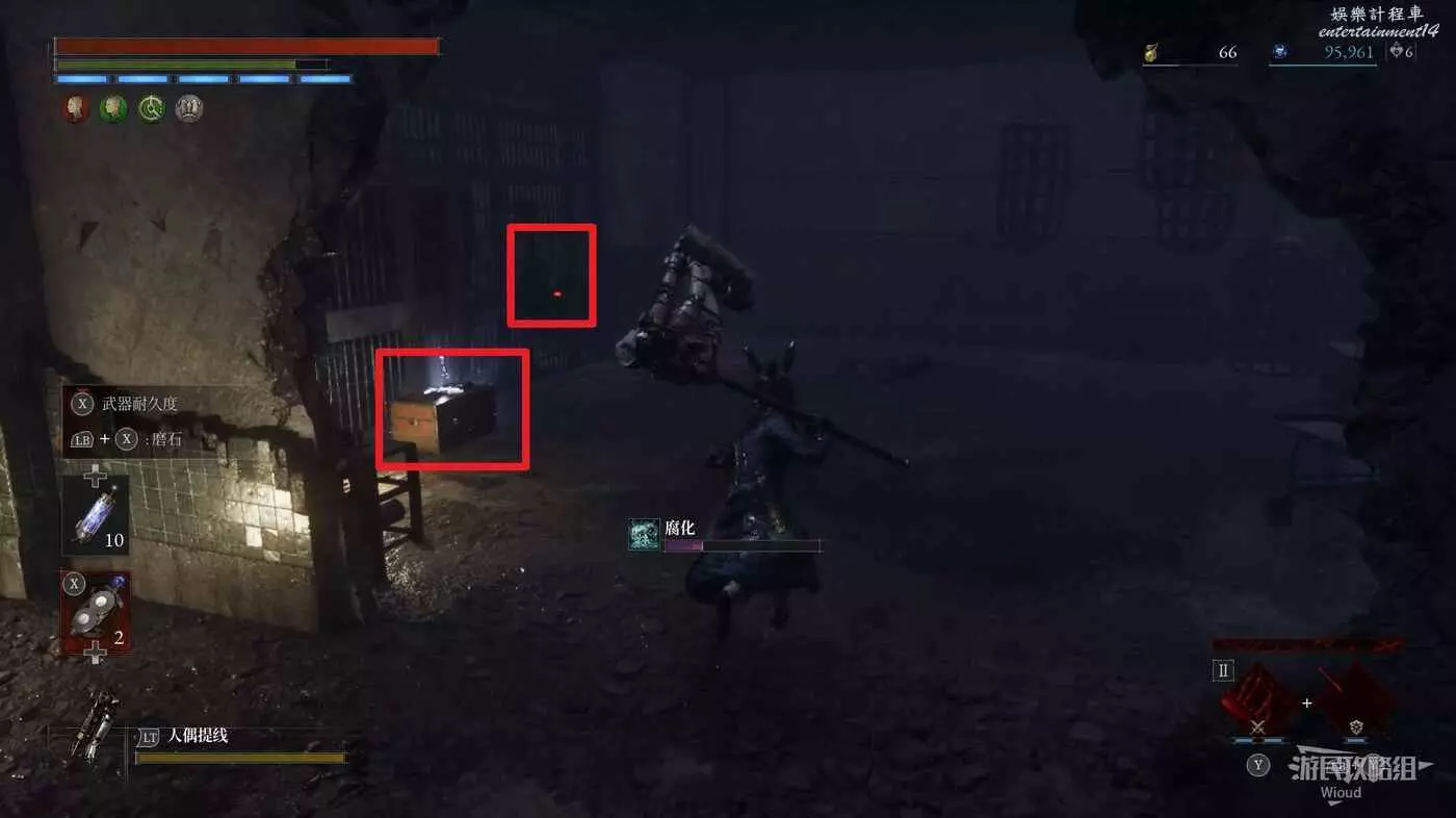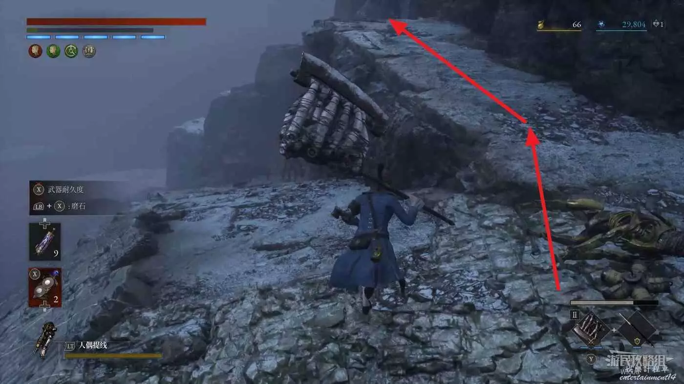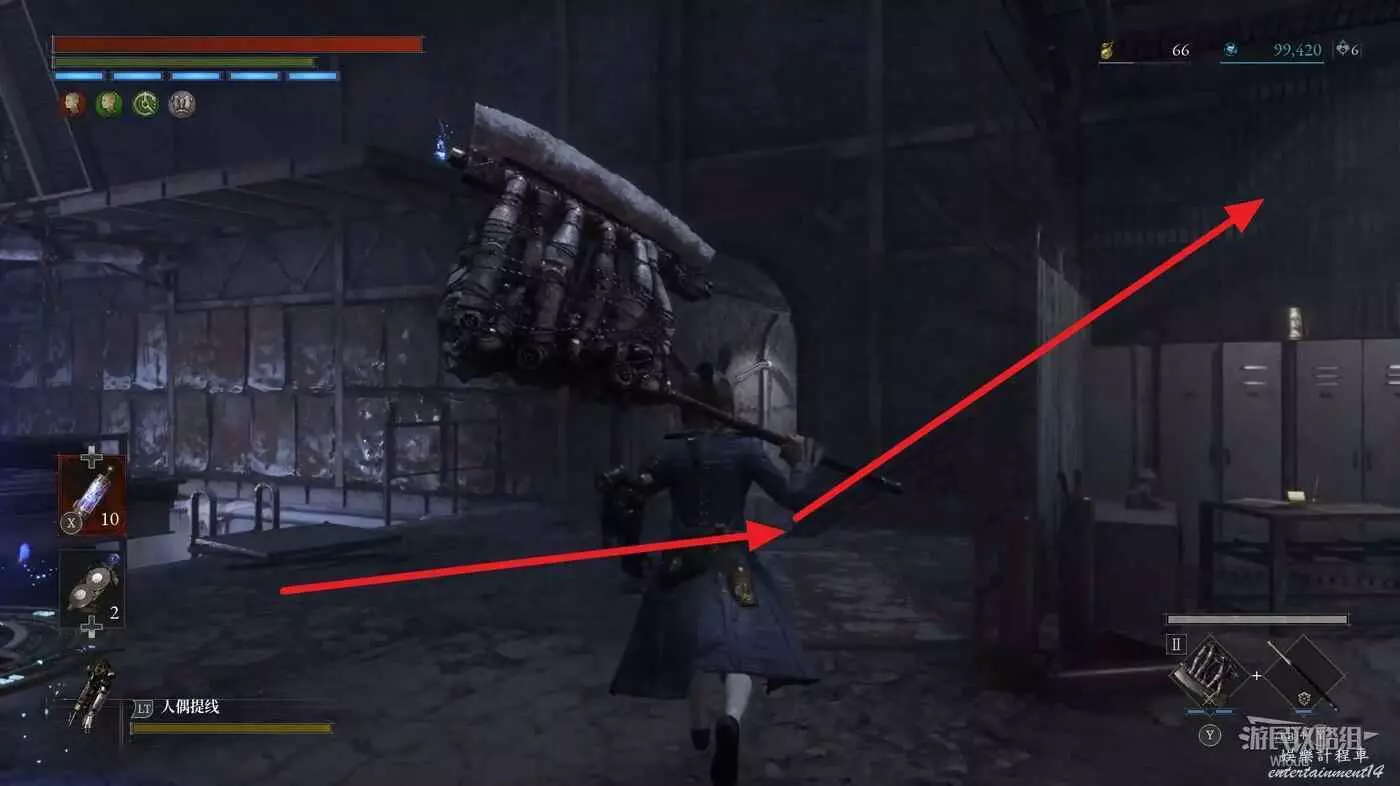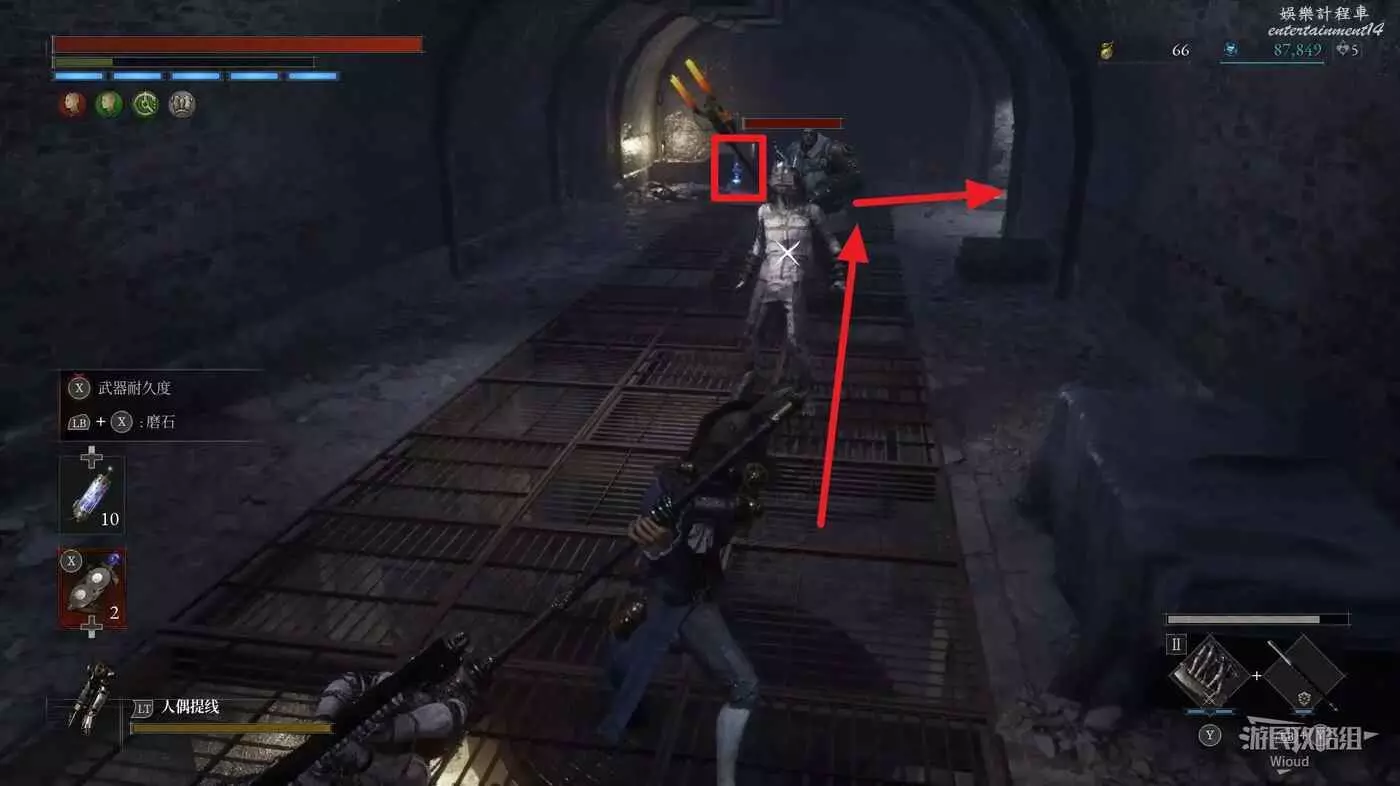 完事爬到此塔樓上面,沿著下圖路線穿過鎖鏈走到前方模板處再右拐走到頭,跳到下面平台可開啟一個寶箱,第一次拾取裡面寶物獲得一個【軍團彈匣】,第二次拾取獲得【破損的切割磨石】與【破損的穿透磨石】。
