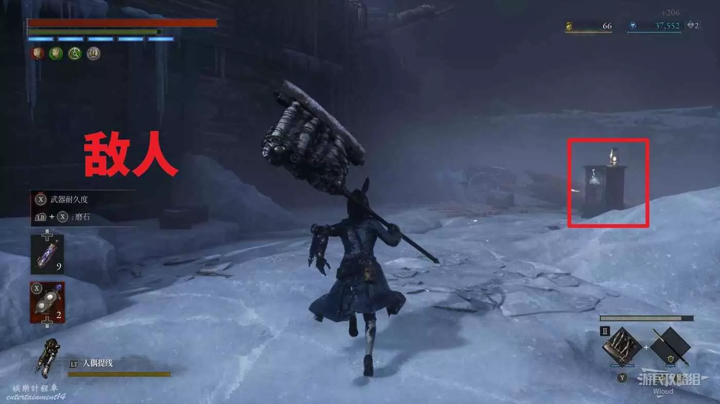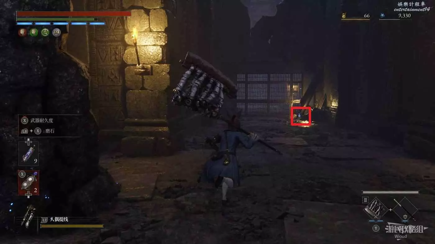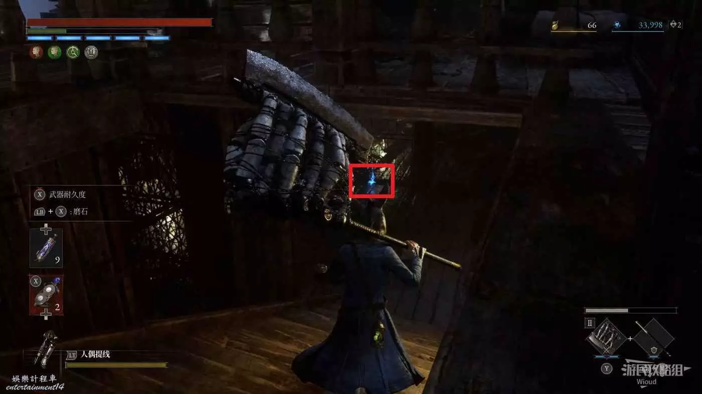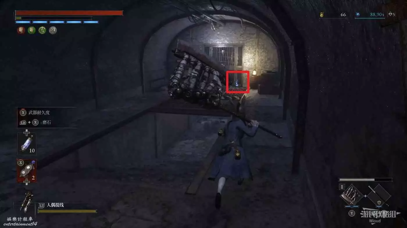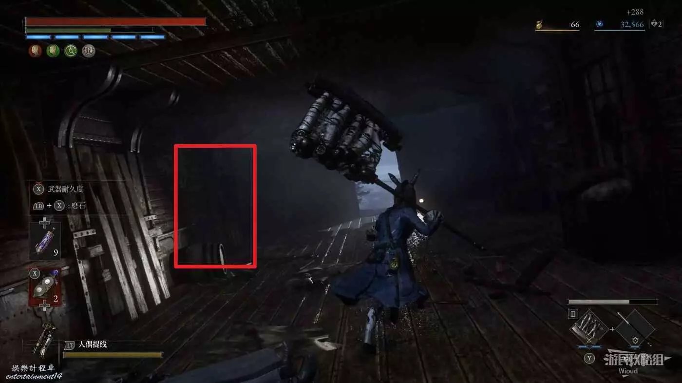 完事爬到此塔樓上面,沿著下圖路線穿過鎖鏈走到前方模板處再右拐走到頭,跳到下面平台可開啟一個寶箱,第一次拾取裡面寶物獲得一個【軍團彈匣】,第二次拾取獲得【破損的切割磨石】與【破損的穿透磨石】。