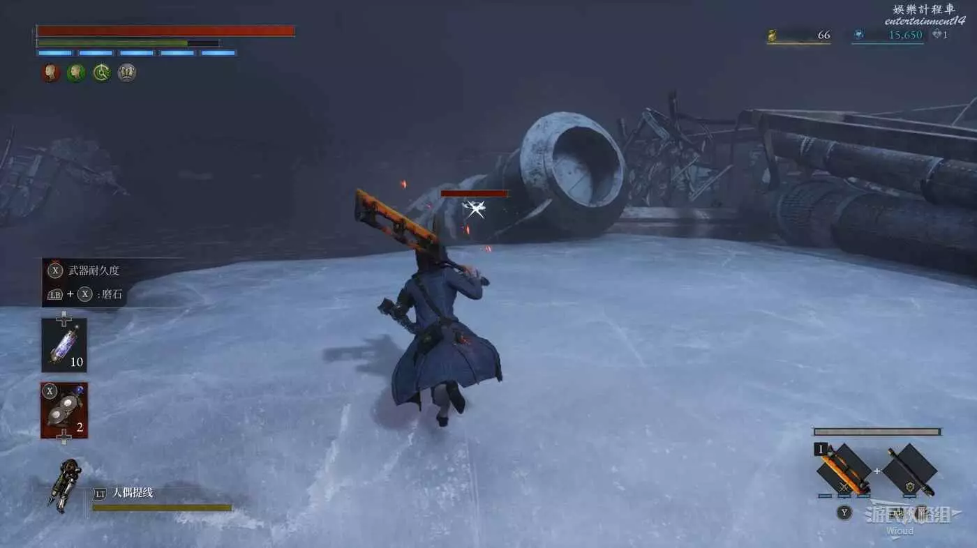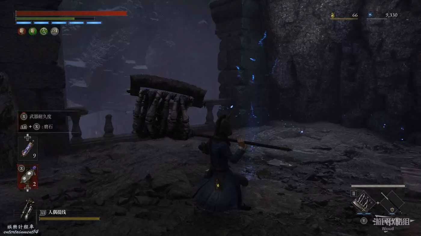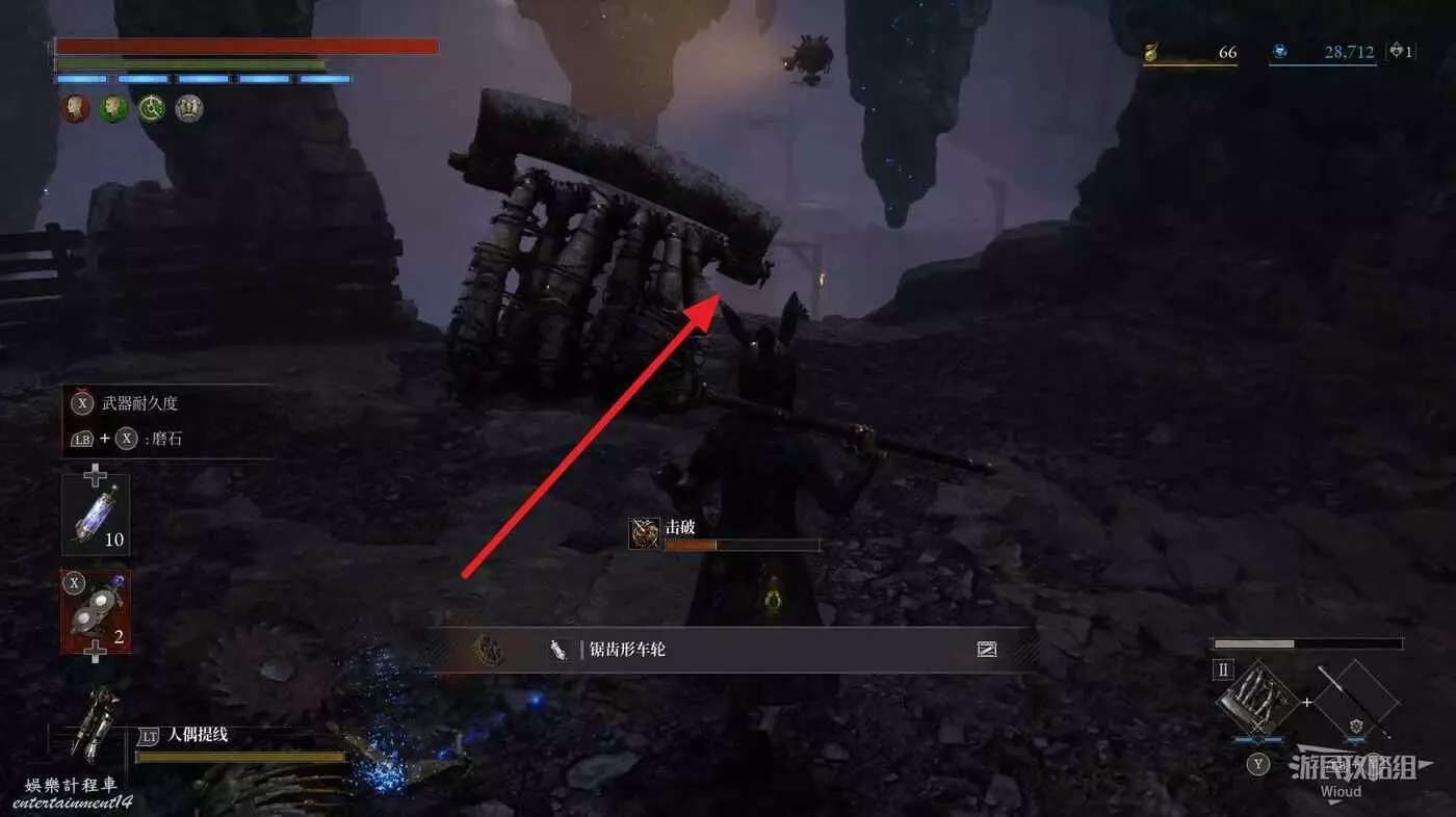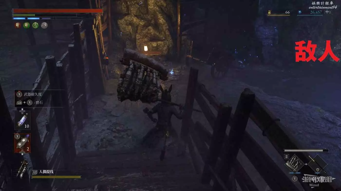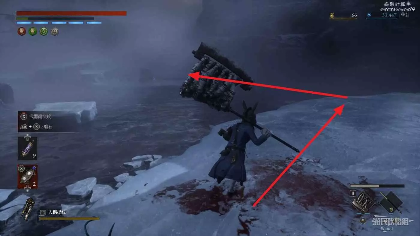 完事爬到此塔樓上面,沿著下圖路線穿過鎖鏈走到前方模板處再右拐走到頭,跳到下面平台可開啟一個寶箱,第一次拾取裡面寶物獲得一個【軍團彈匣】,第二次拾取獲得【破損的切割磨石】與【破損的穿透磨石】。