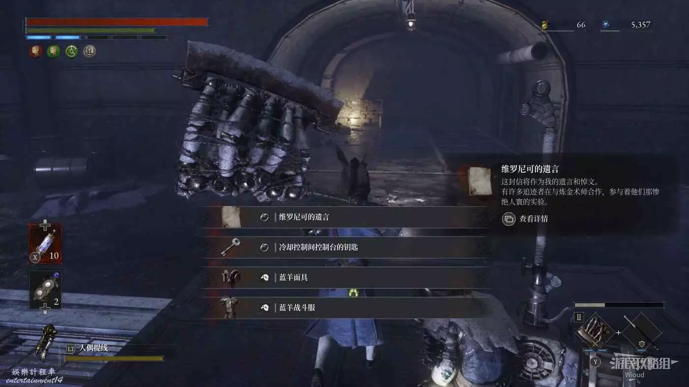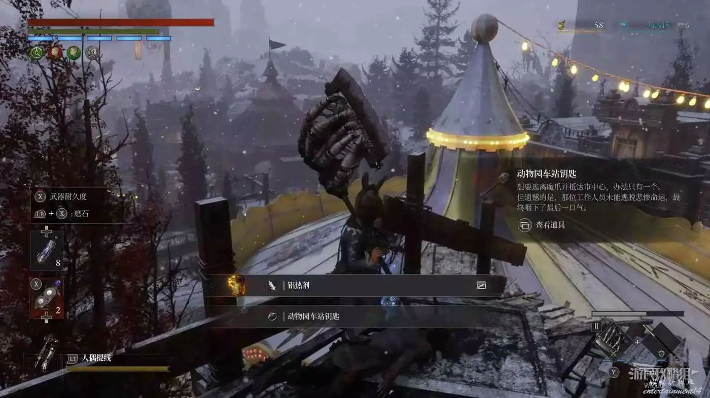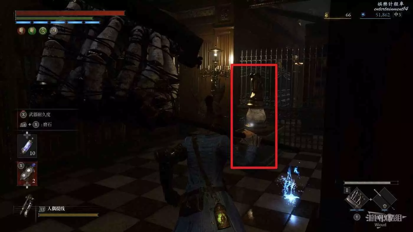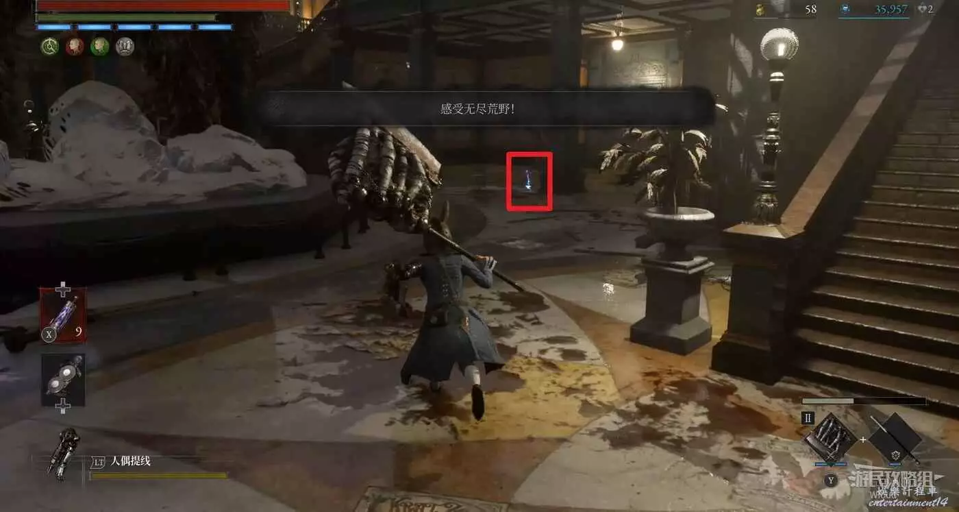 此篝火左邊就是最終BOSS的房間,此時還有一些東西沒搞完,明天10號將更新三個密碼機的解謎、補充盲人畫家支線、補充狂歡花園處落下的【冬眠+1】護身符等,建議小夥伴先推到這裡!