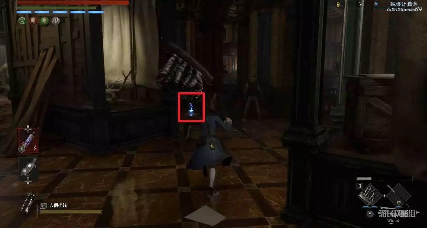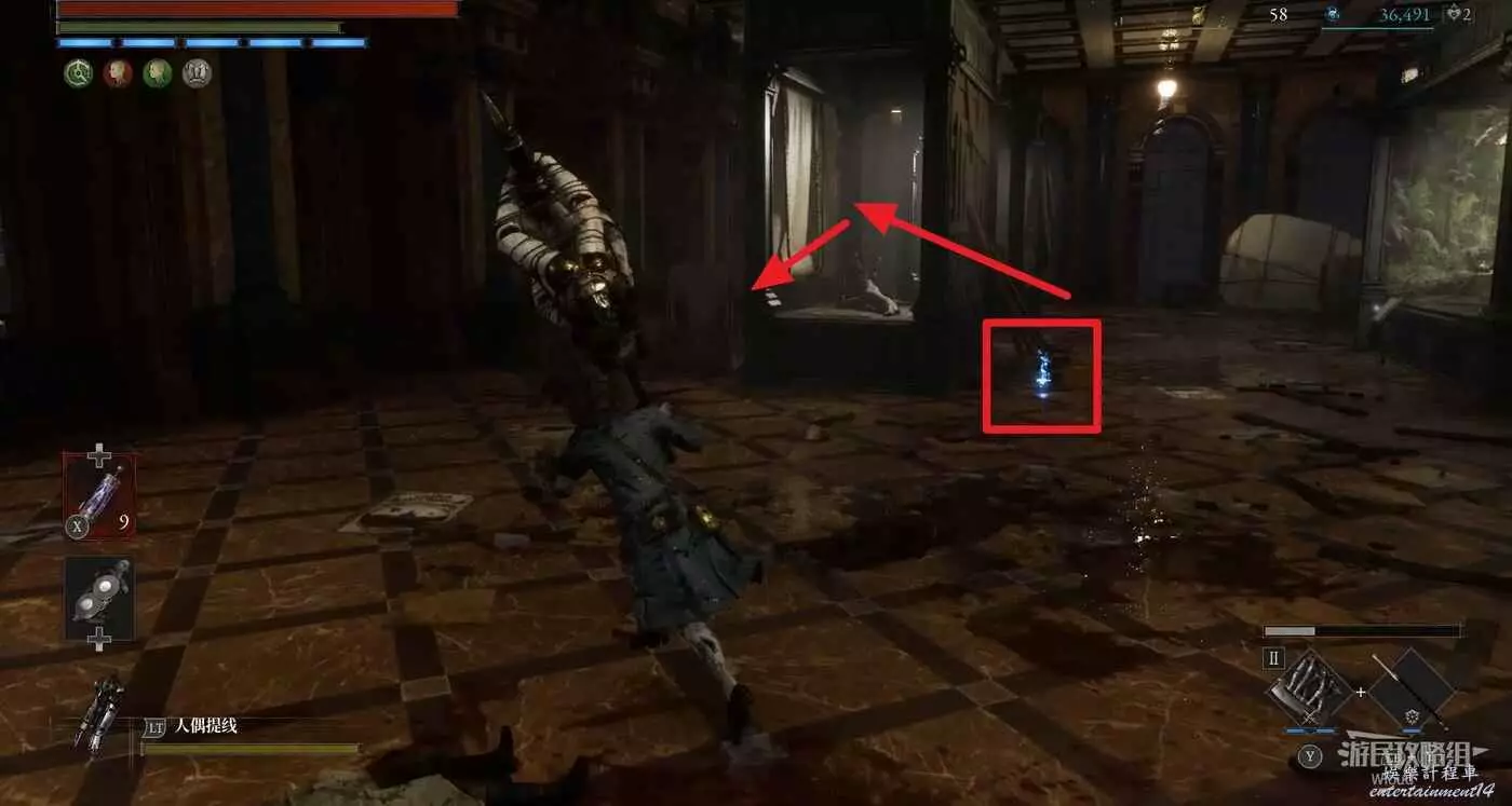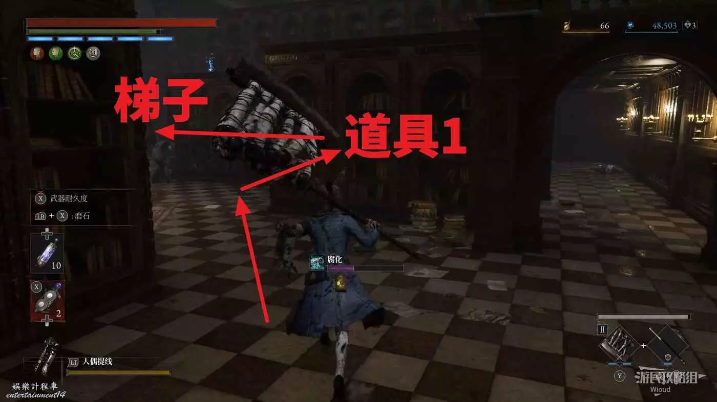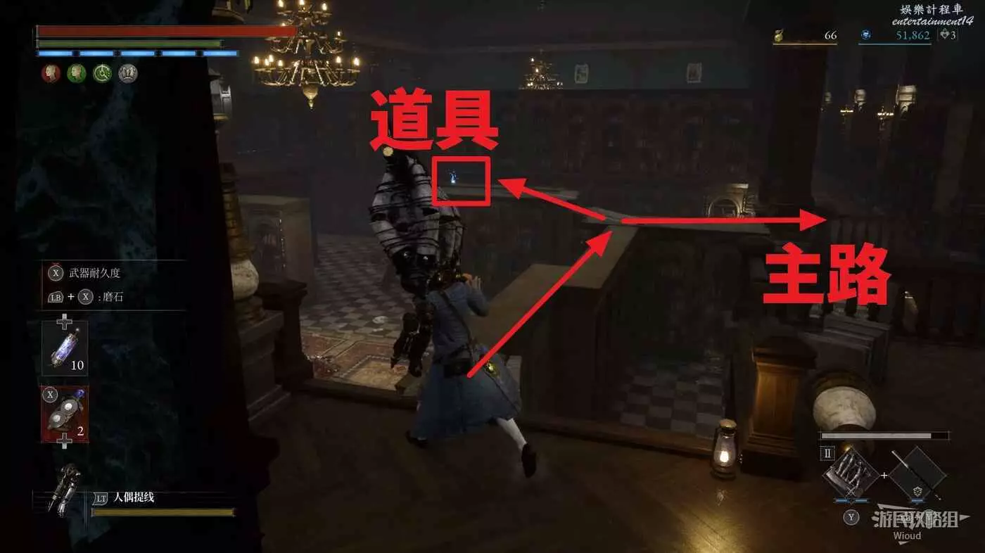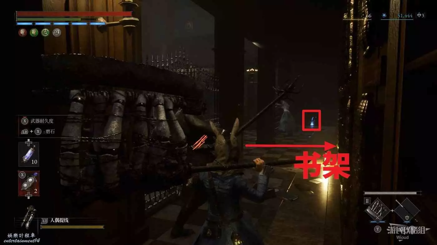 直走右拐,穿過一片牢籠,沿著下圖路線貼著右邊書架繞到裡面拿個道具,走到梯子的位置,貼著右牆來到中間,右邊有個可以互動的書架,互動後兩側都會開啟一個凹口,左邊有個怪物,右邊可拾取一個【超凡恢復安瓶】。