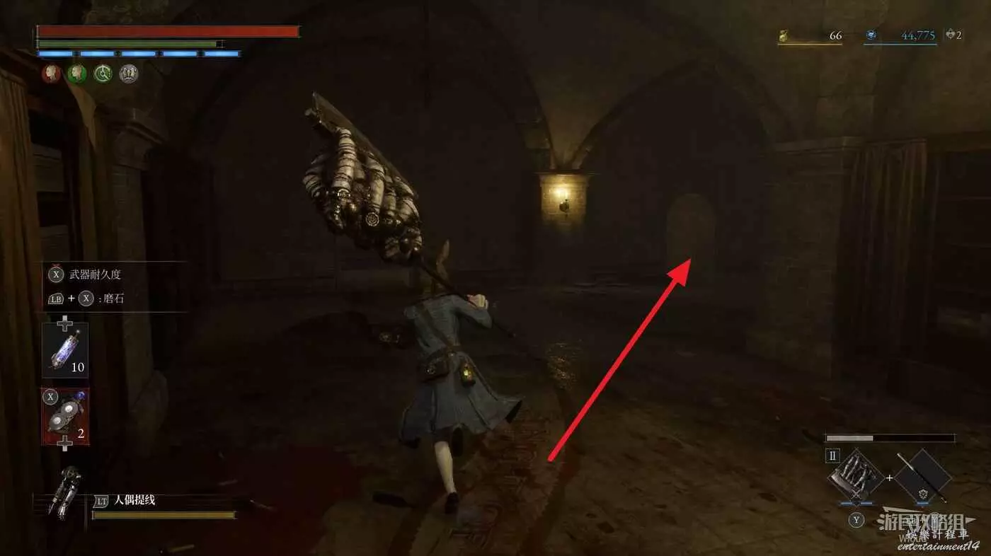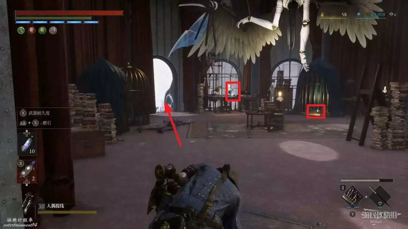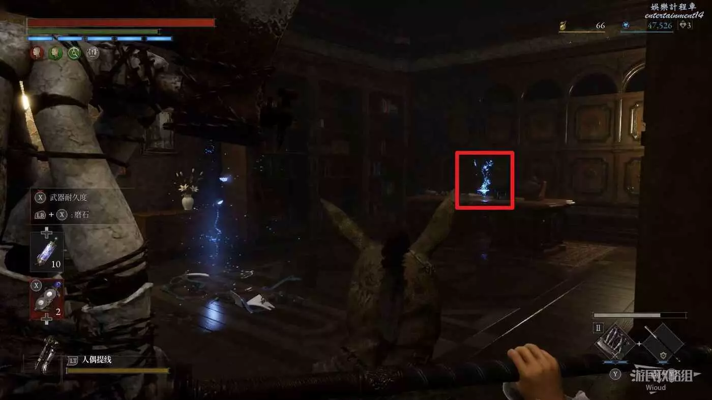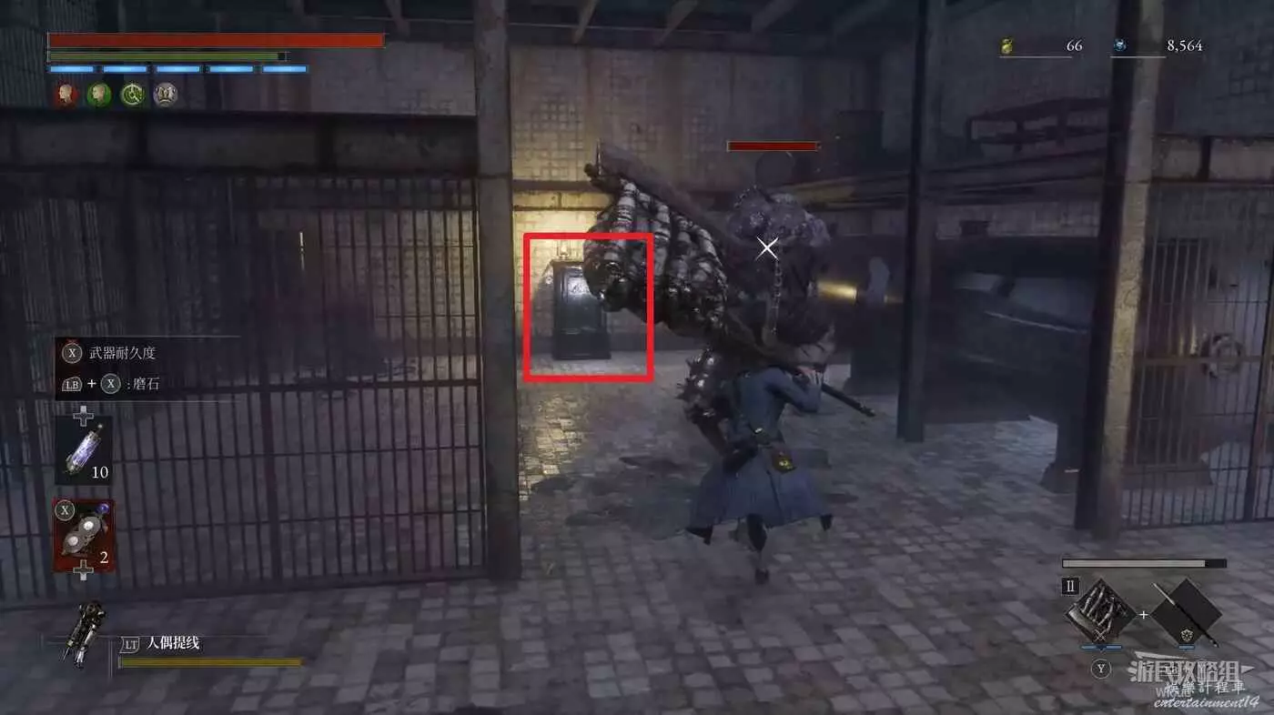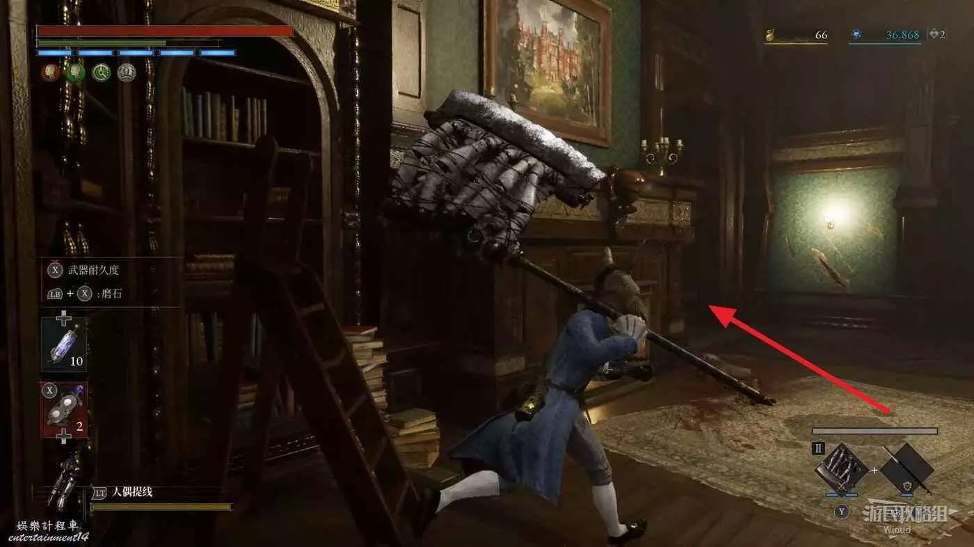 直走右拐,穿過一片牢籠,沿著下圖路線貼著右邊書架繞到裡面拿個道具,走到梯子的位置,貼著右牆來到中間,右邊有個可以互動的書架,互動後兩側都會開啟一個凹口,左邊有個怪物,右邊可拾取一個【超凡恢復安瓶】。