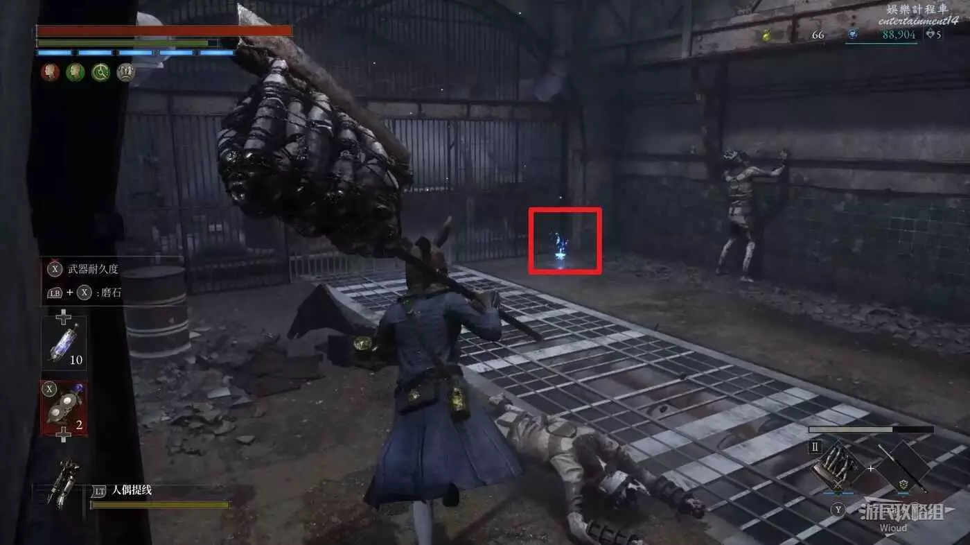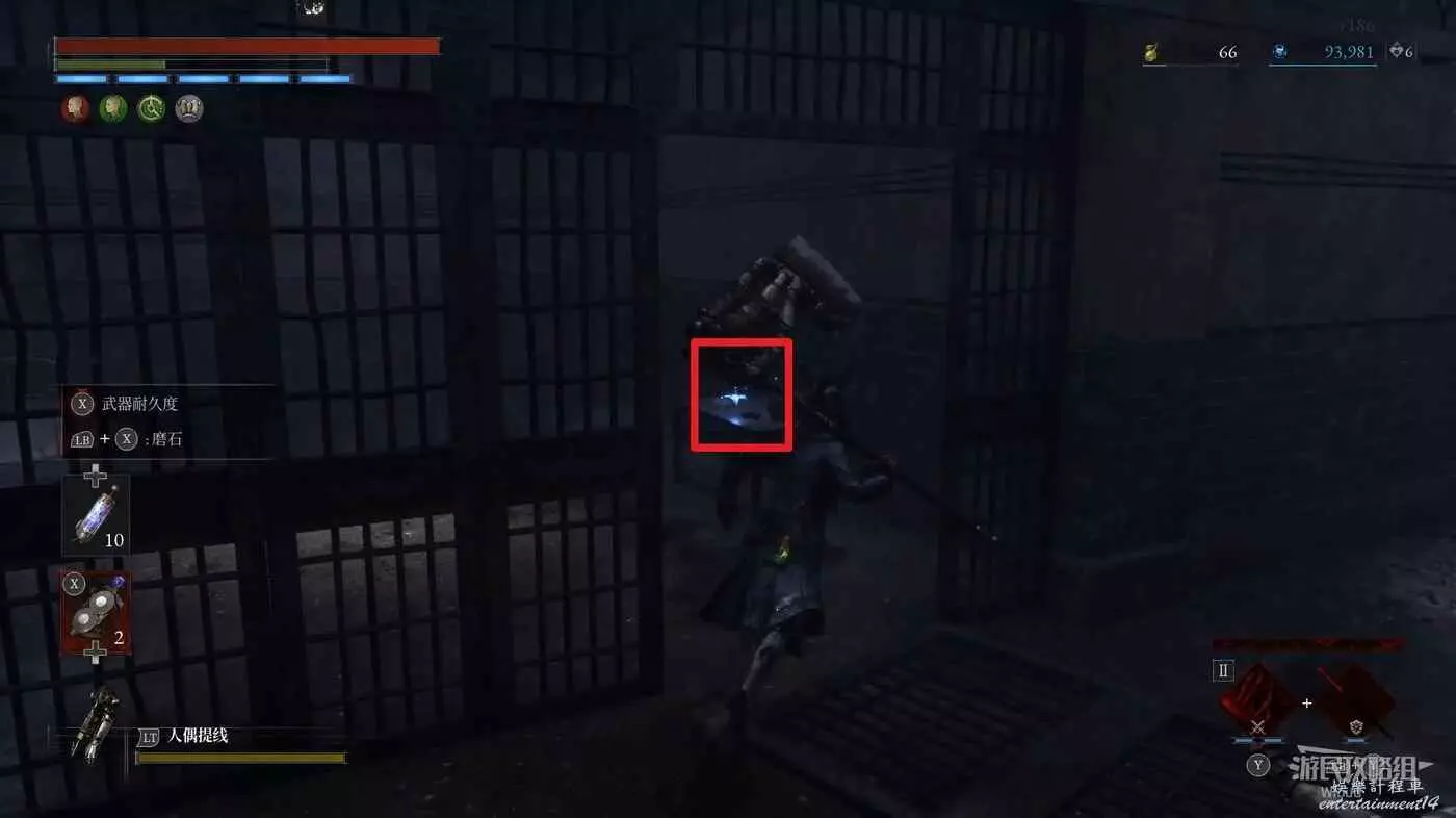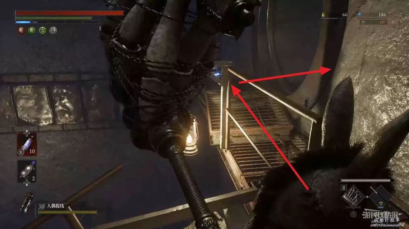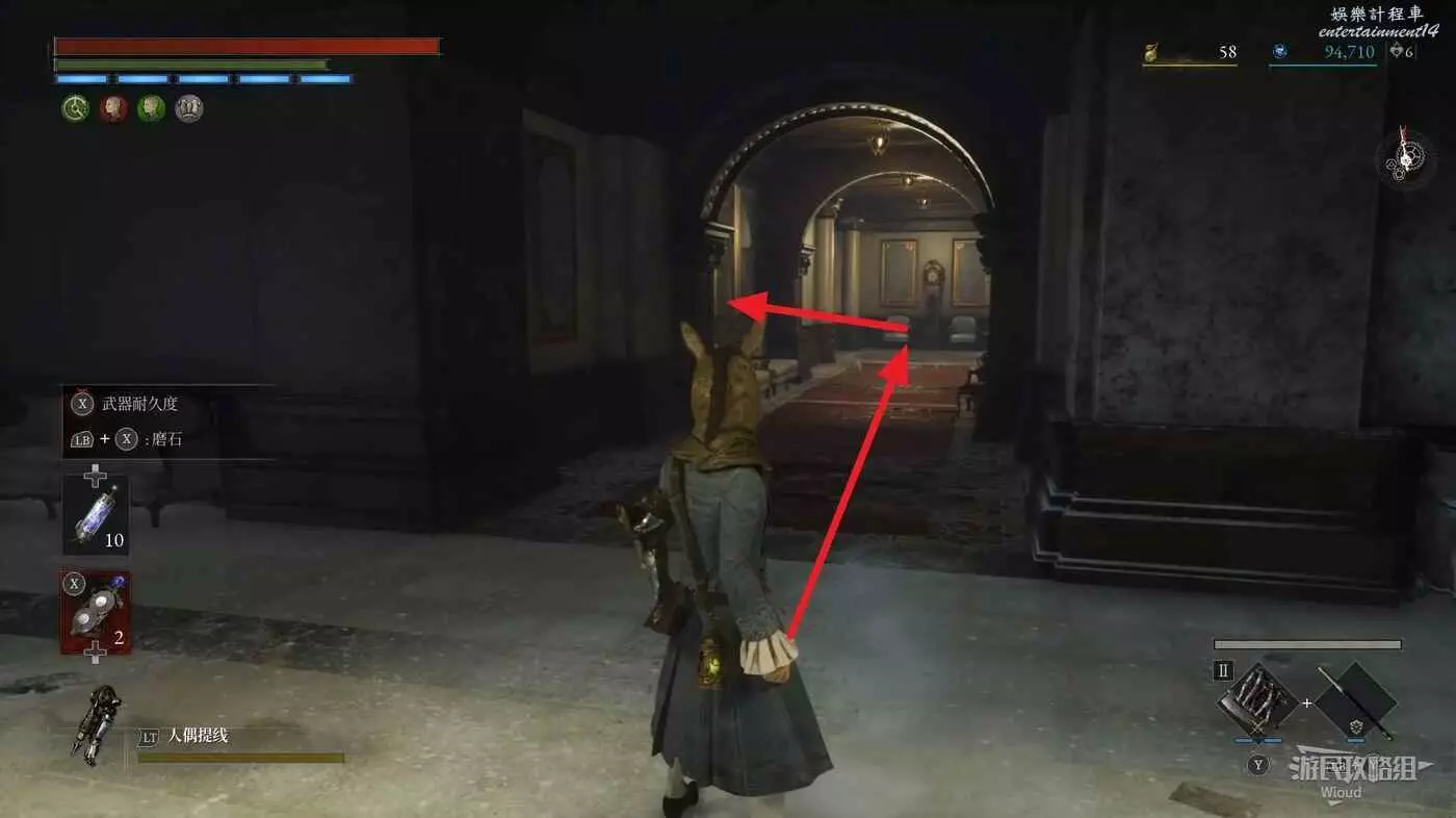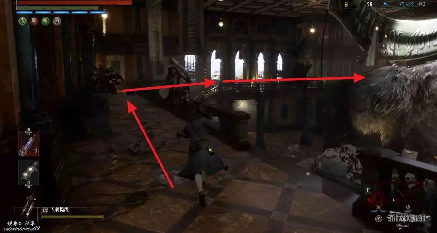 直走右拐,穿過一片牢籠,沿著下圖路線貼著右邊書架繞到裡面拿個道具,走到梯子的位置,貼著右牆來到中間,右邊有個可以互動的書架,互動後兩側都會開啟一個凹口,左邊有個怪物,右邊可拾取一個【超凡恢復安瓶】。