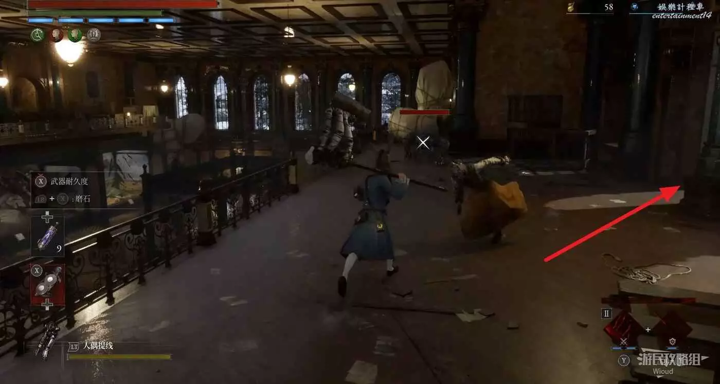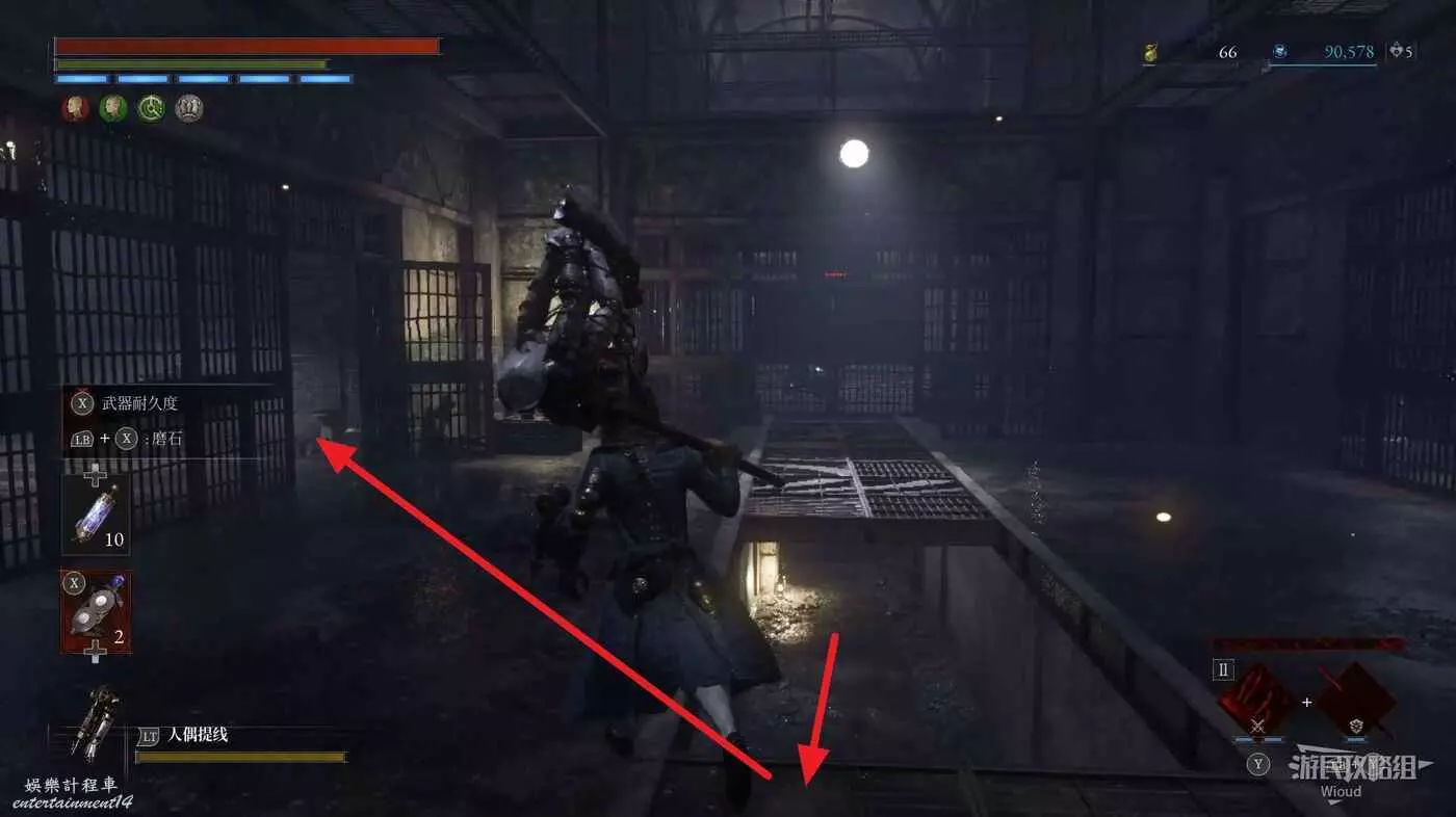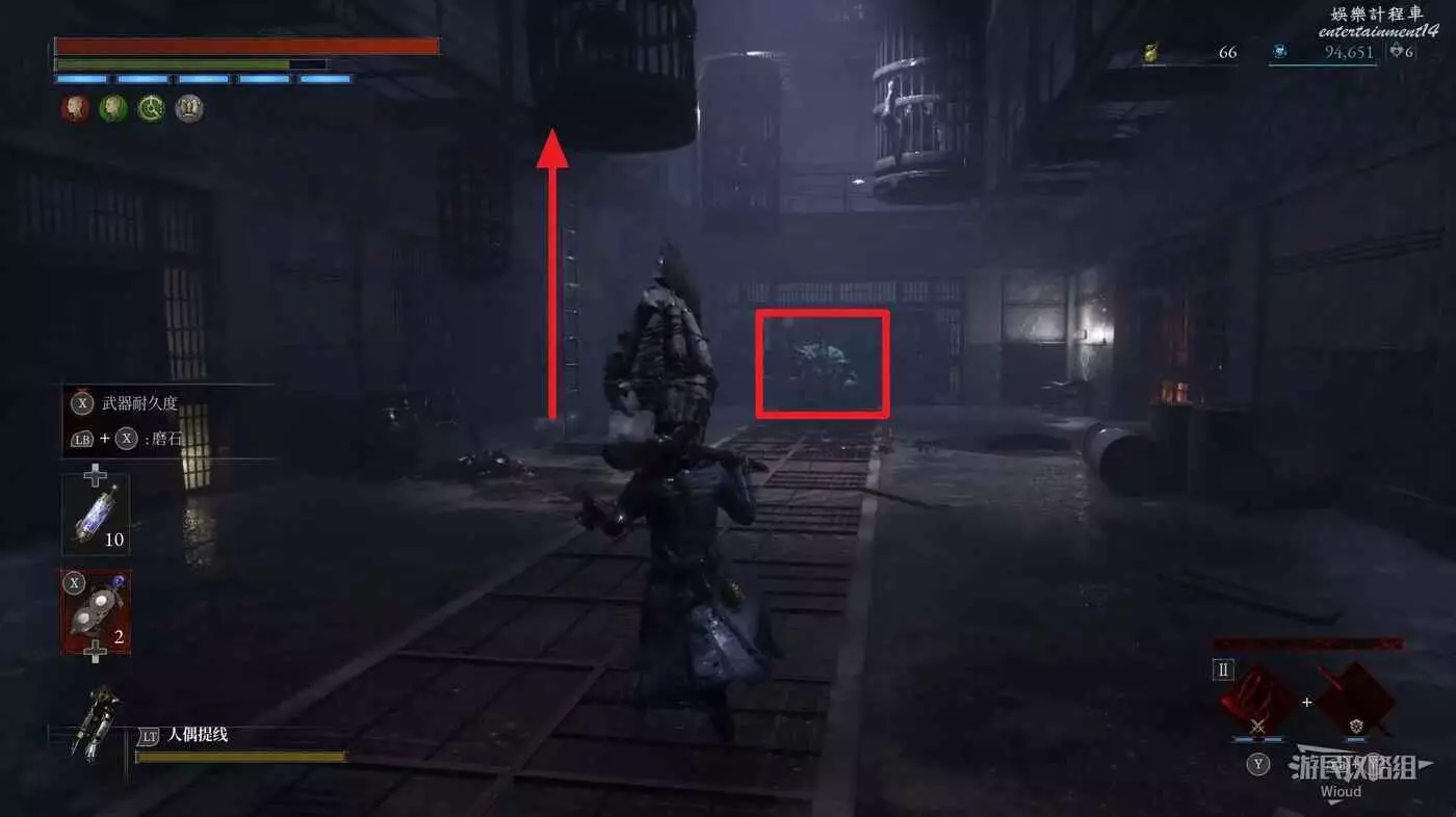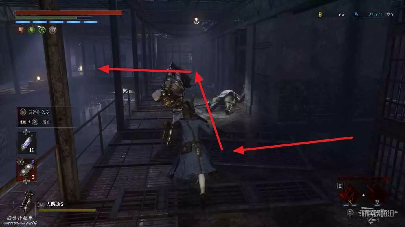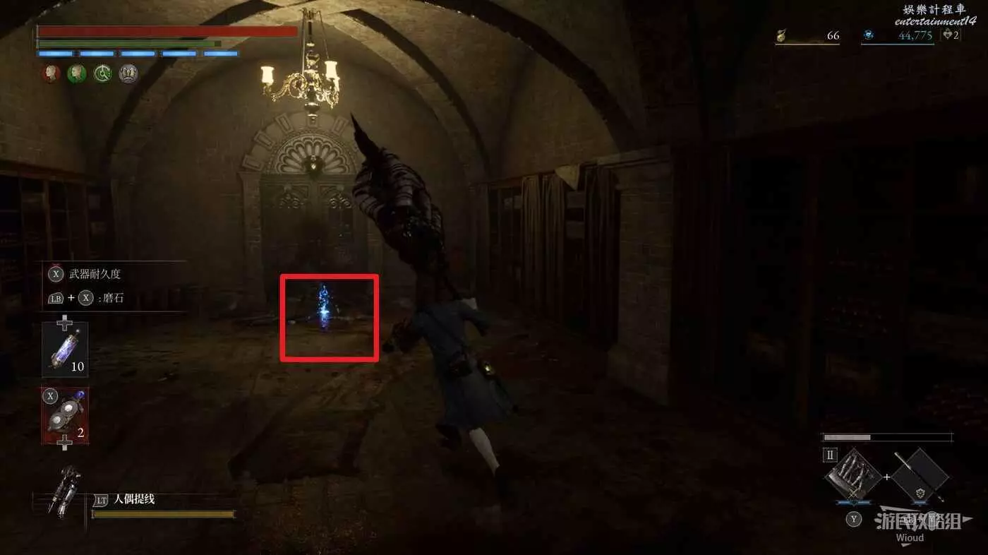 直走右拐,穿過一片牢籠,沿著下圖路線貼著右邊書架繞到裡面拿個道具,走到梯子的位置,貼著右牆來到中間,右邊有個可以互動的書架,互動後兩側都會開啟一個凹口,左邊有個怪物,右邊可拾取一個【超凡恢復安瓶】。