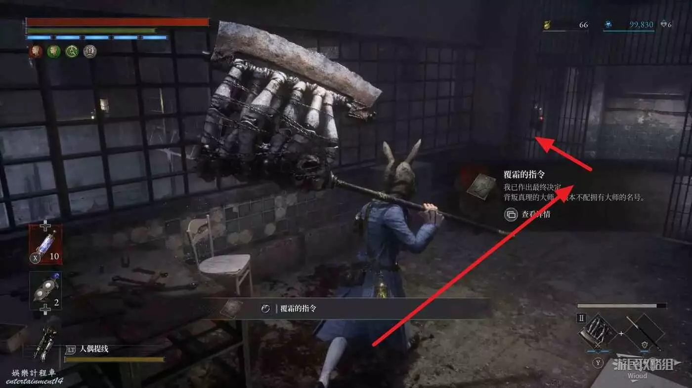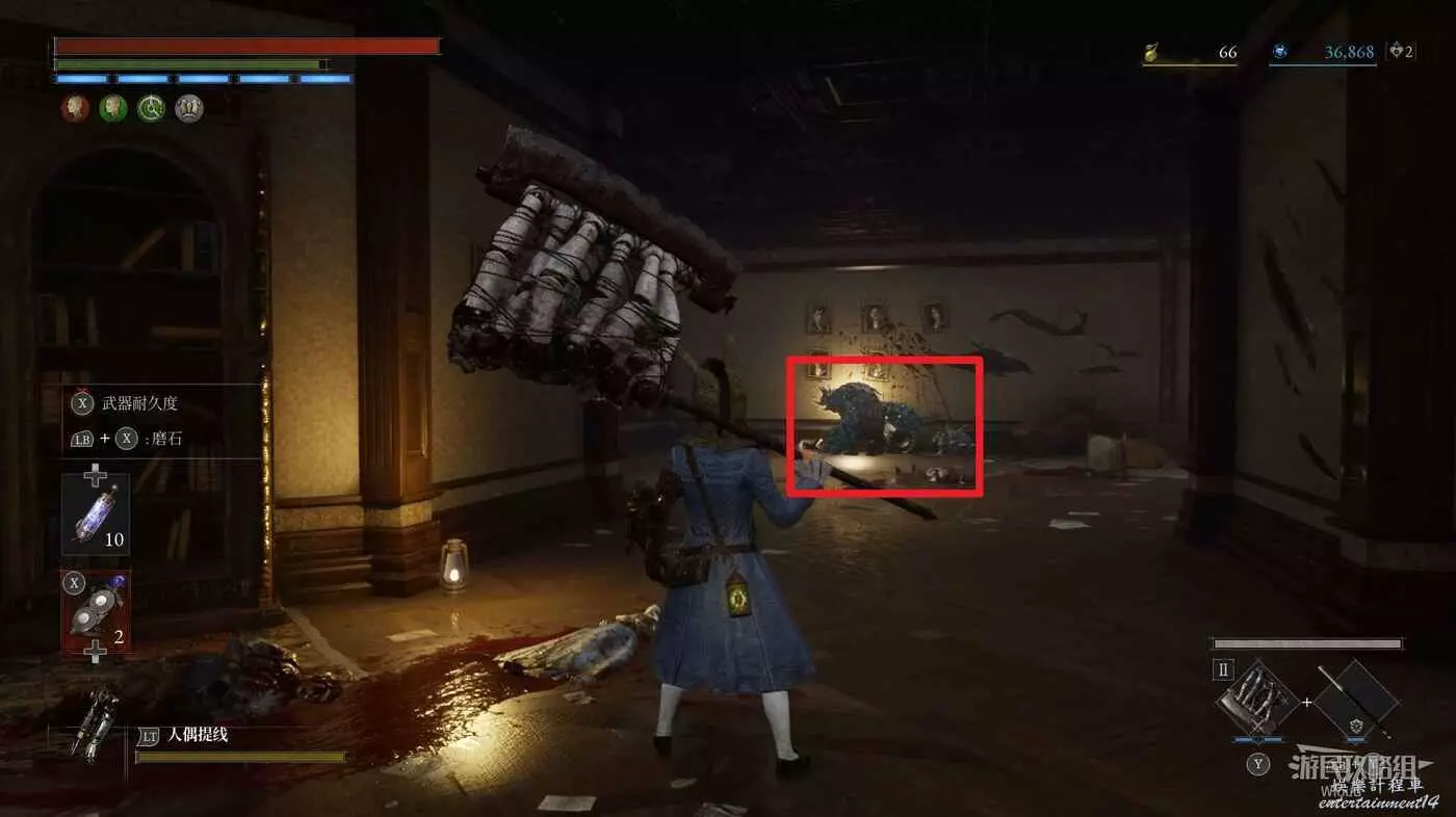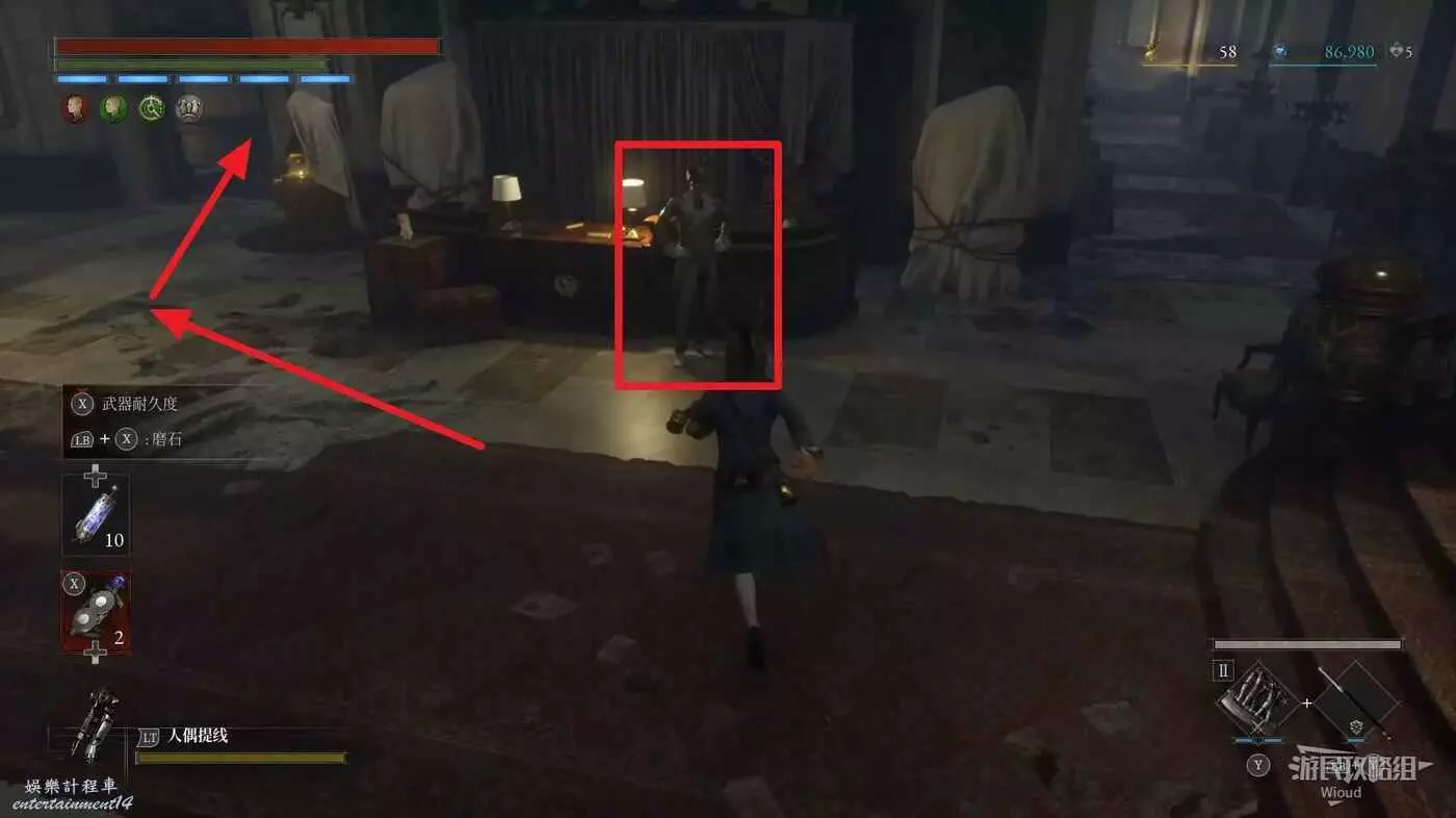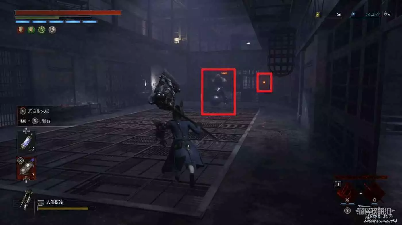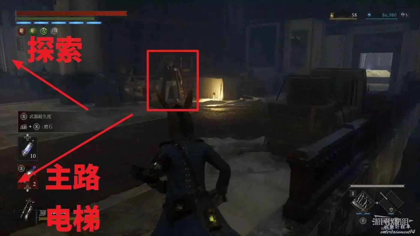 直走右拐,穿過一片牢籠,沿著下圖路線貼著右邊書架繞到裡面拿個道具,走到梯子的位置,貼著右牆來到中間,右邊有個可以互動的書架,互動後兩側都會開啟一個凹口,左邊有個怪物,右邊可拾取一個【超凡恢復安瓶】。