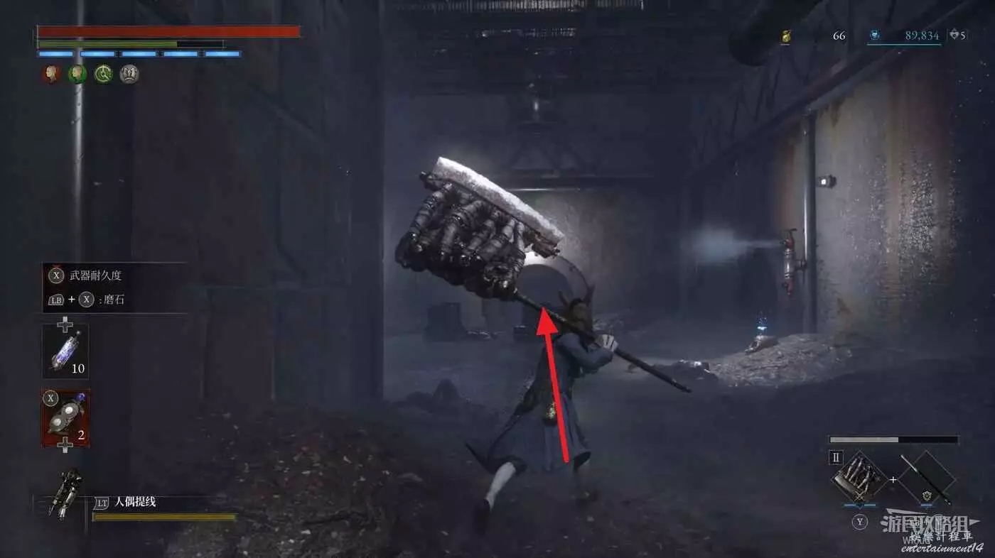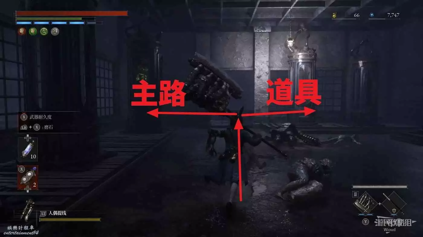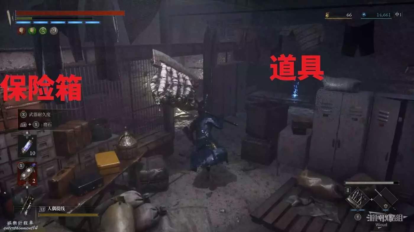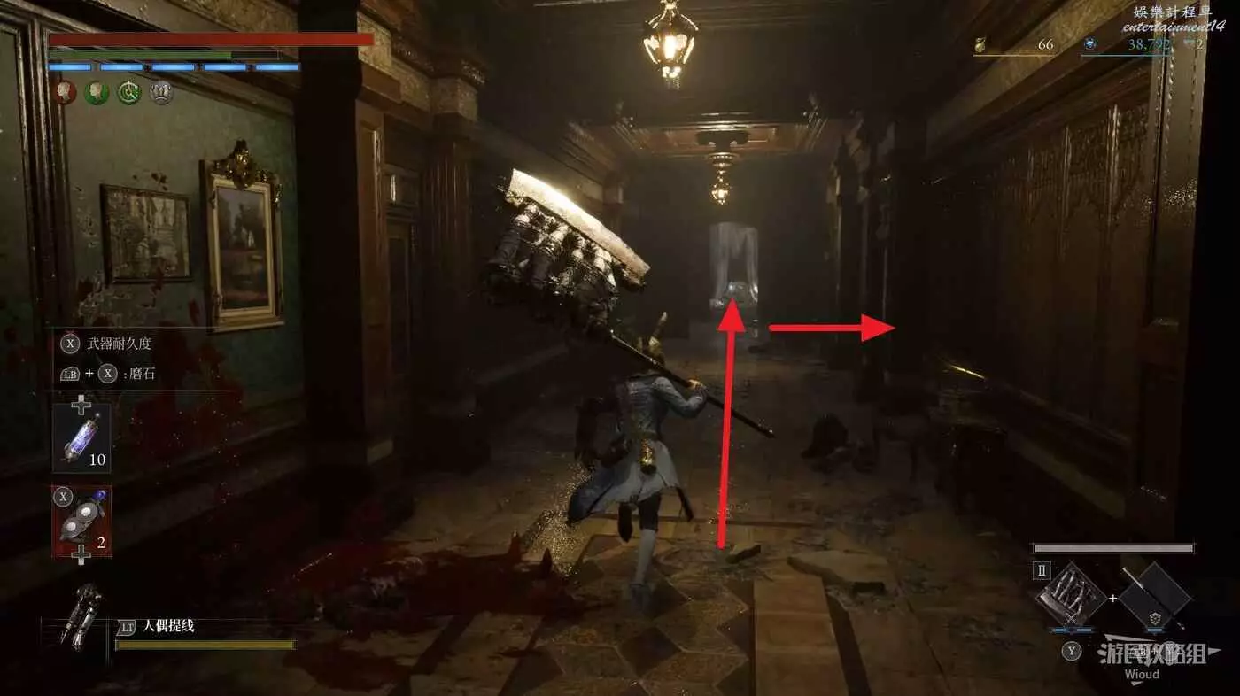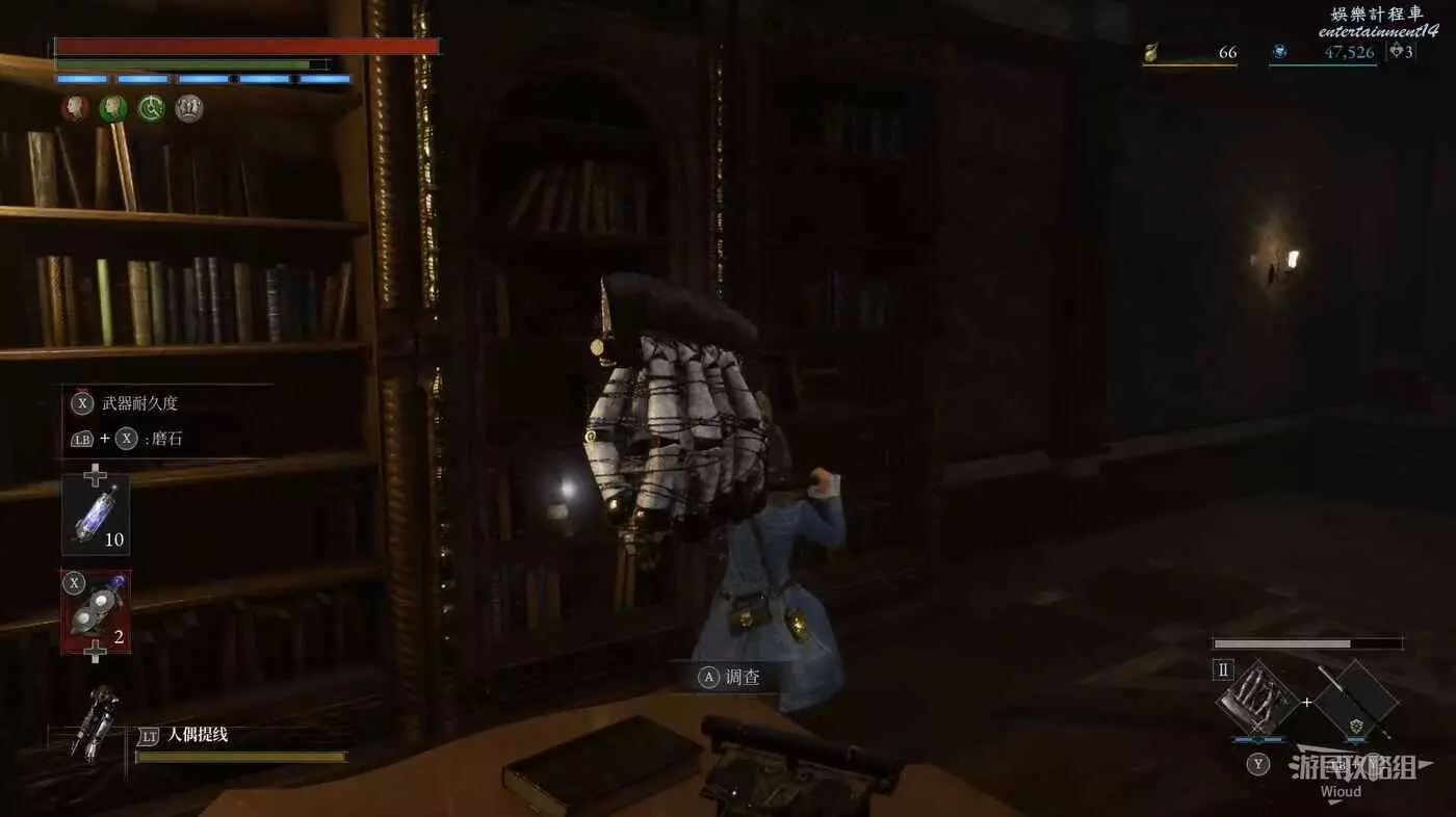 直走右拐,穿過一片牢籠,沿著下圖路線貼著右邊書架繞到裡面拿個道具,走到梯子的位置,貼著右牆來到中間,右邊有個可以互動的書架,互動後兩側都會開啟一個凹口,左邊有個怪物,右邊可拾取一個【超凡恢復安瓶】。