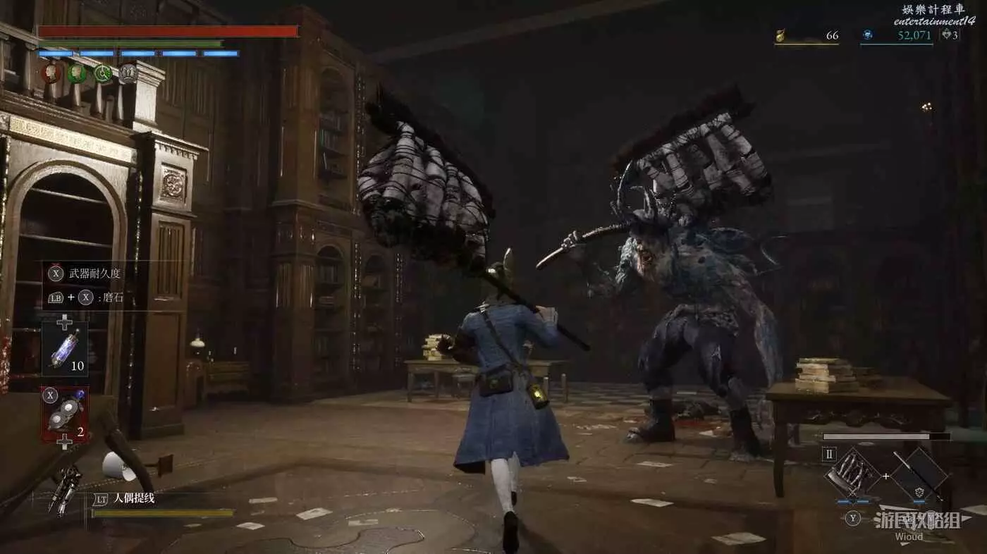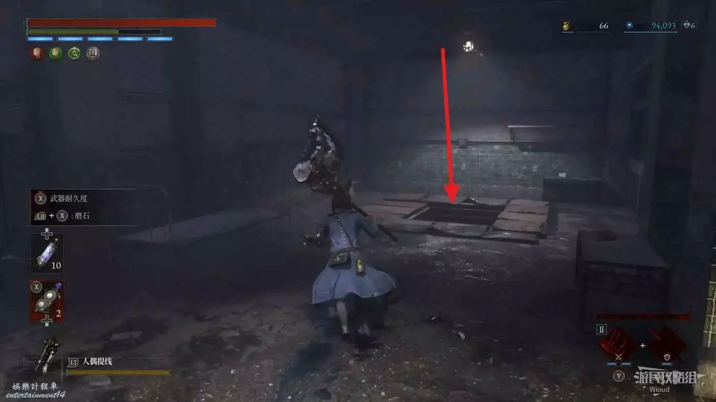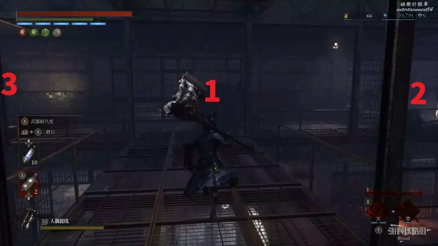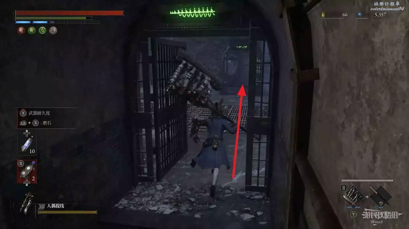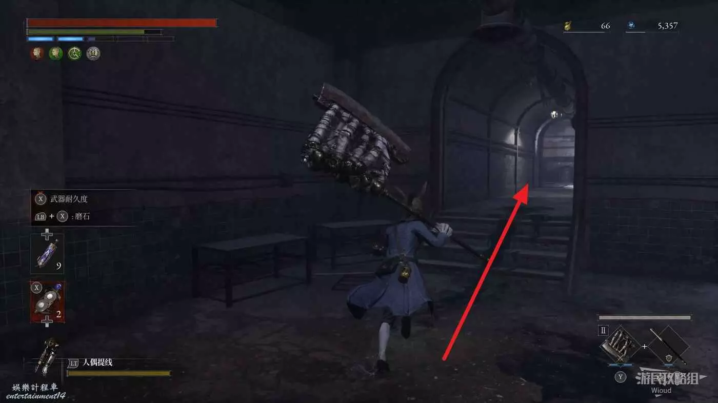 直走右拐,穿過一片牢籠,沿著下圖路線貼著右邊書架繞到裡面拿個道具,走到梯子的位置,貼著右牆來到中間,右邊有個可以互動的書架,互動後兩側都會開啟一個凹口,左邊有個怪物,右邊可拾取一個【超凡恢復安瓶】。