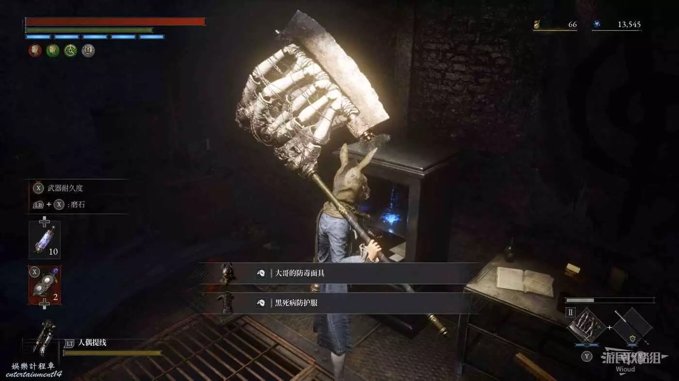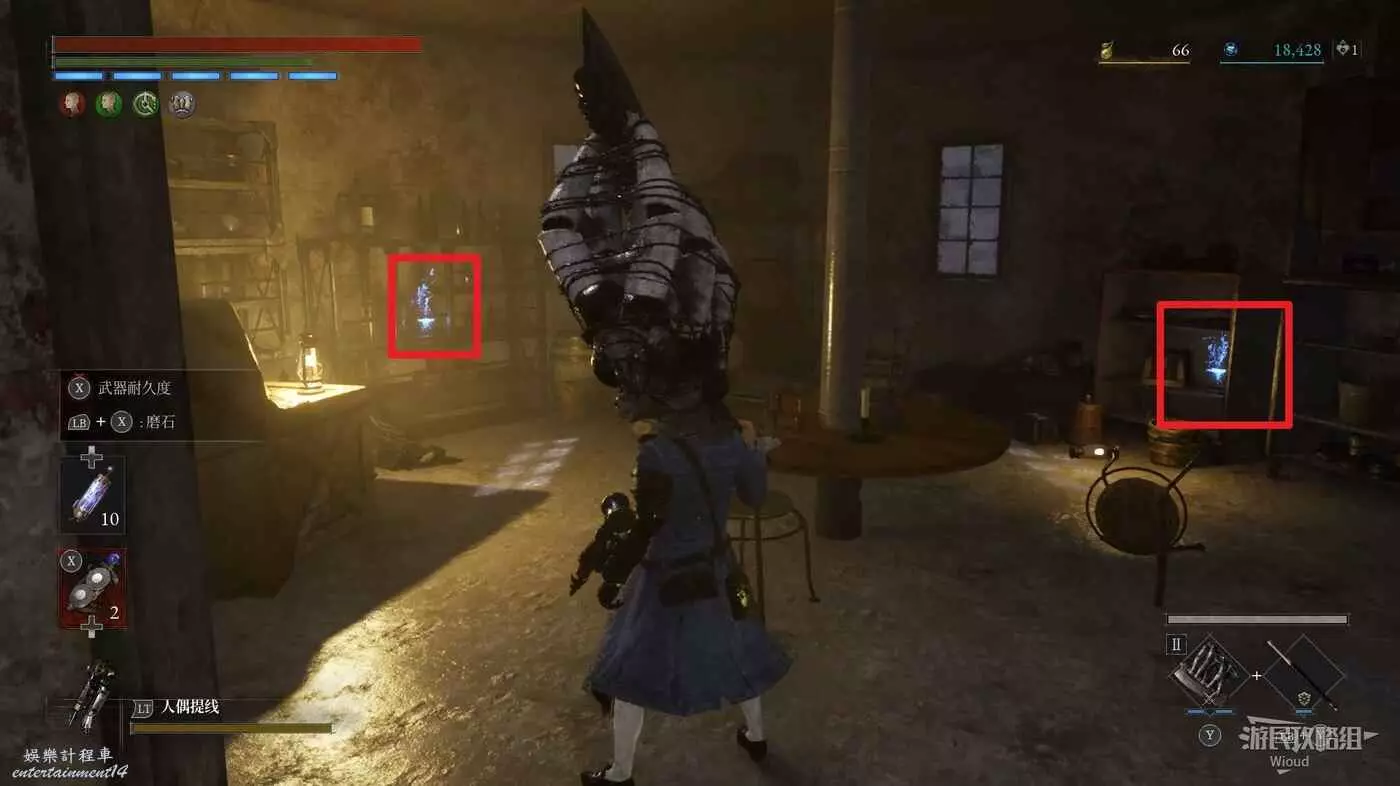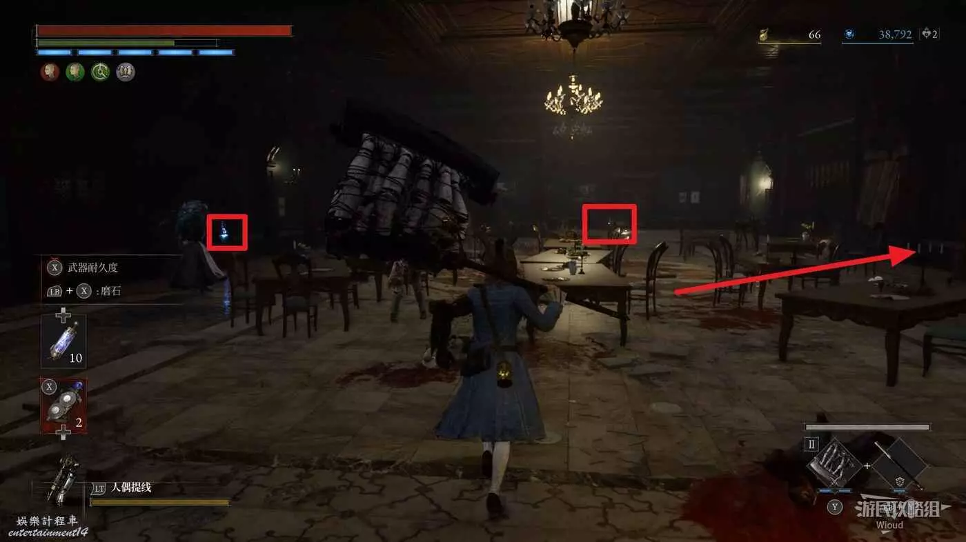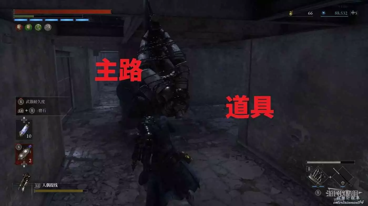 進入前方右邊的餐廳,拾取下圖所示的兩個道具,右邊廚房拾取第三個道具,旁邊梯子走下去啟動篝火【摩納德救濟院地窖】。