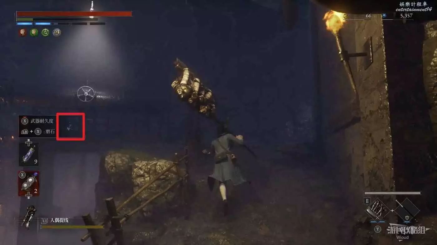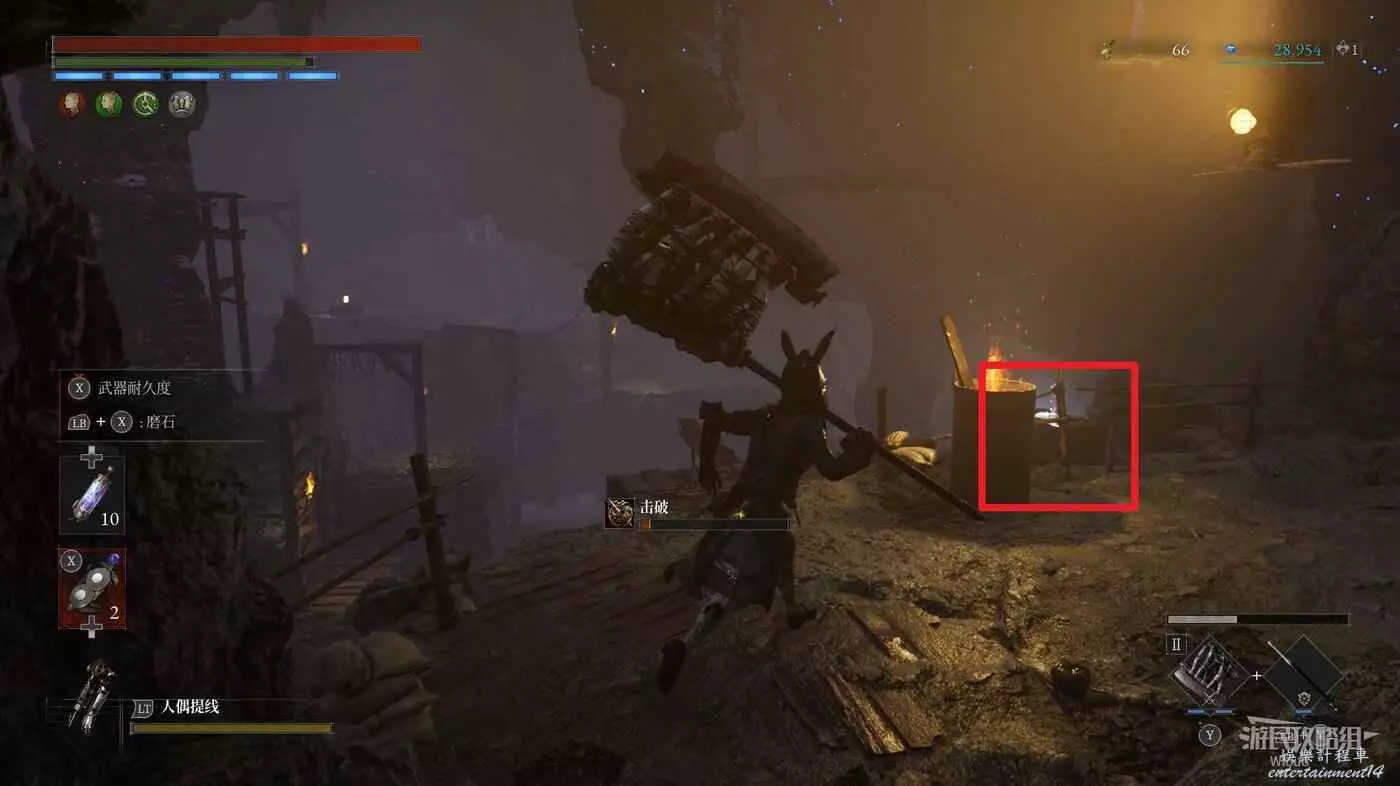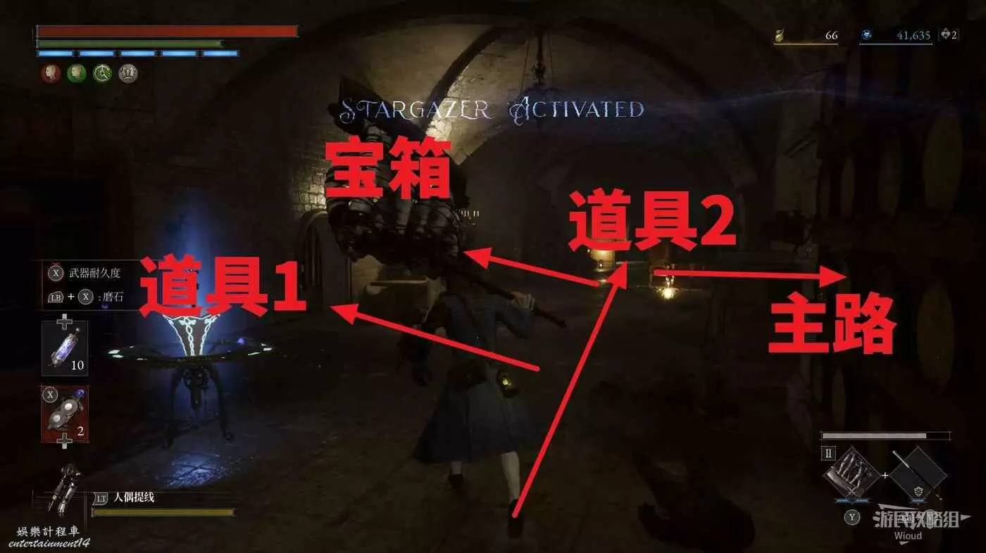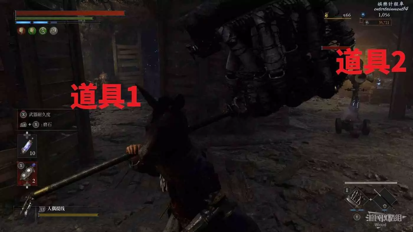 進入篝火正對面的房間可撿到道具2,沿著篝火前方右側的樓梯下去到達一個酒窖。