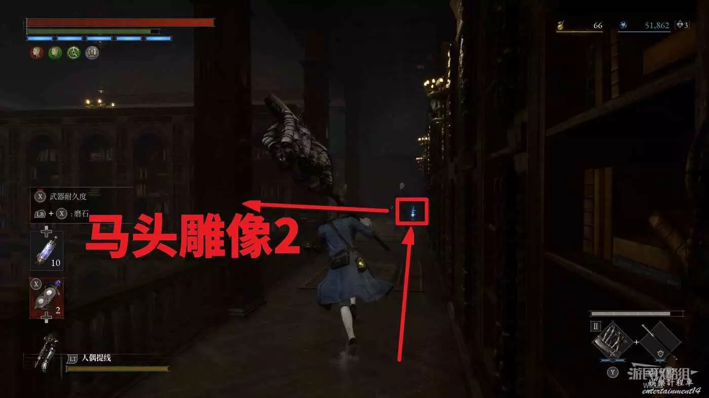 梯子下方拾取一個道具,和馬頭雕像互動能移動周圍書架,回到2層陽臺週邊走到書架上面。