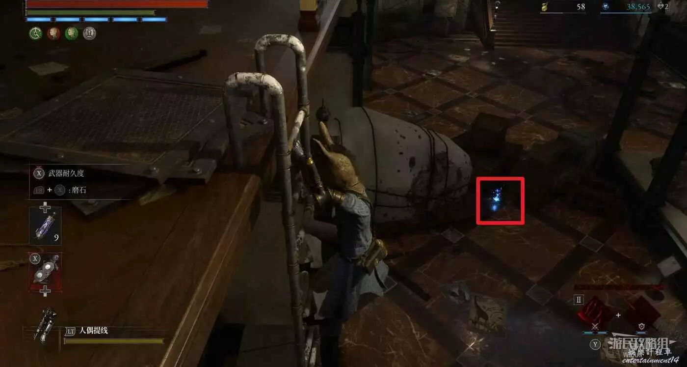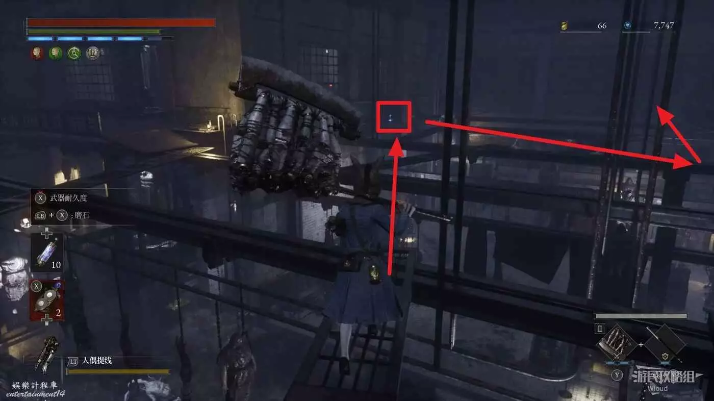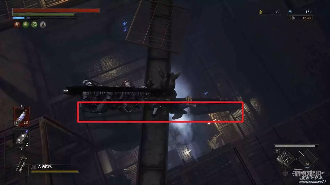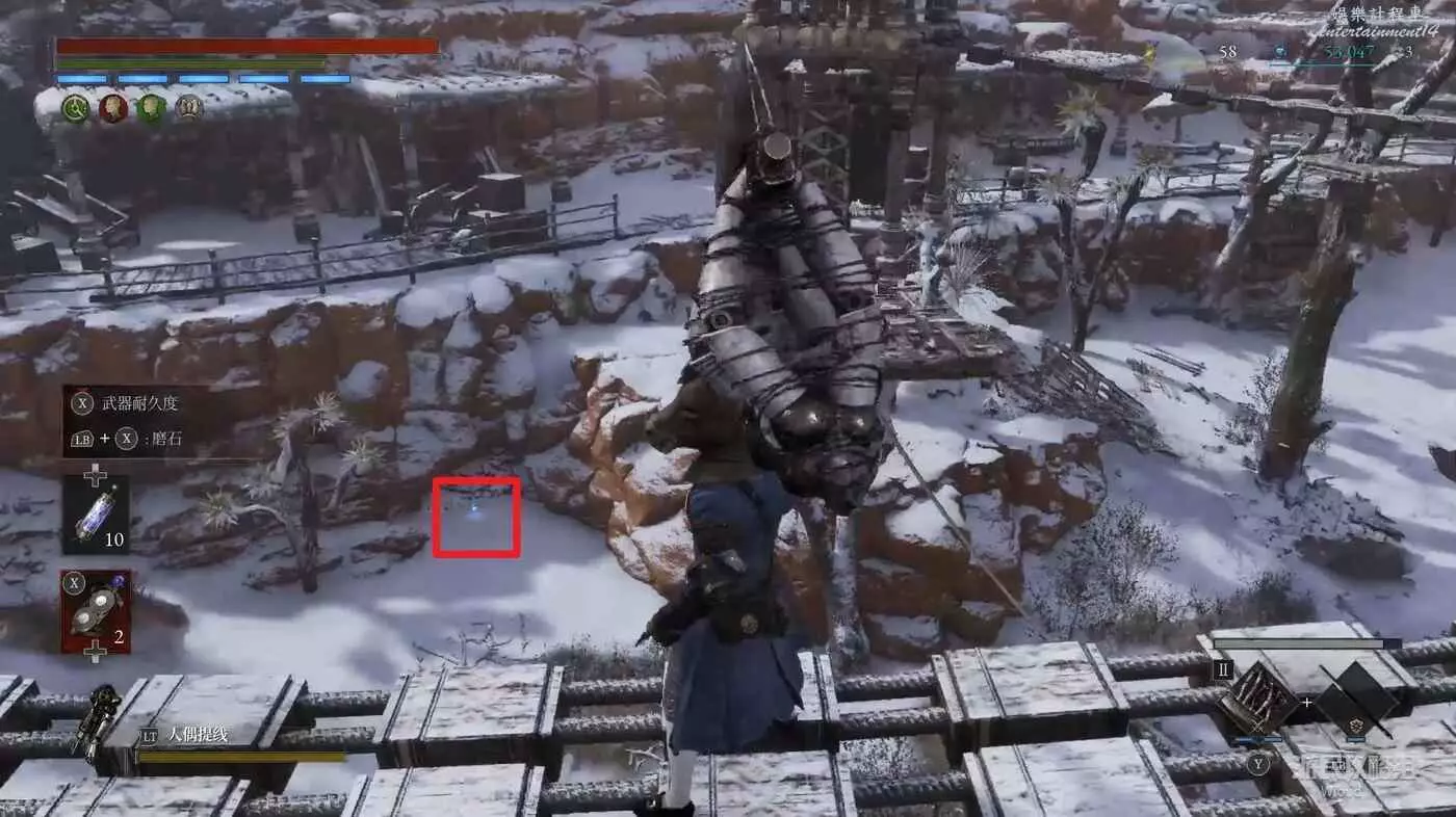 回到高層梯子處往右走,中間會遇到一個向上的梯子,先無視繼續往前走。